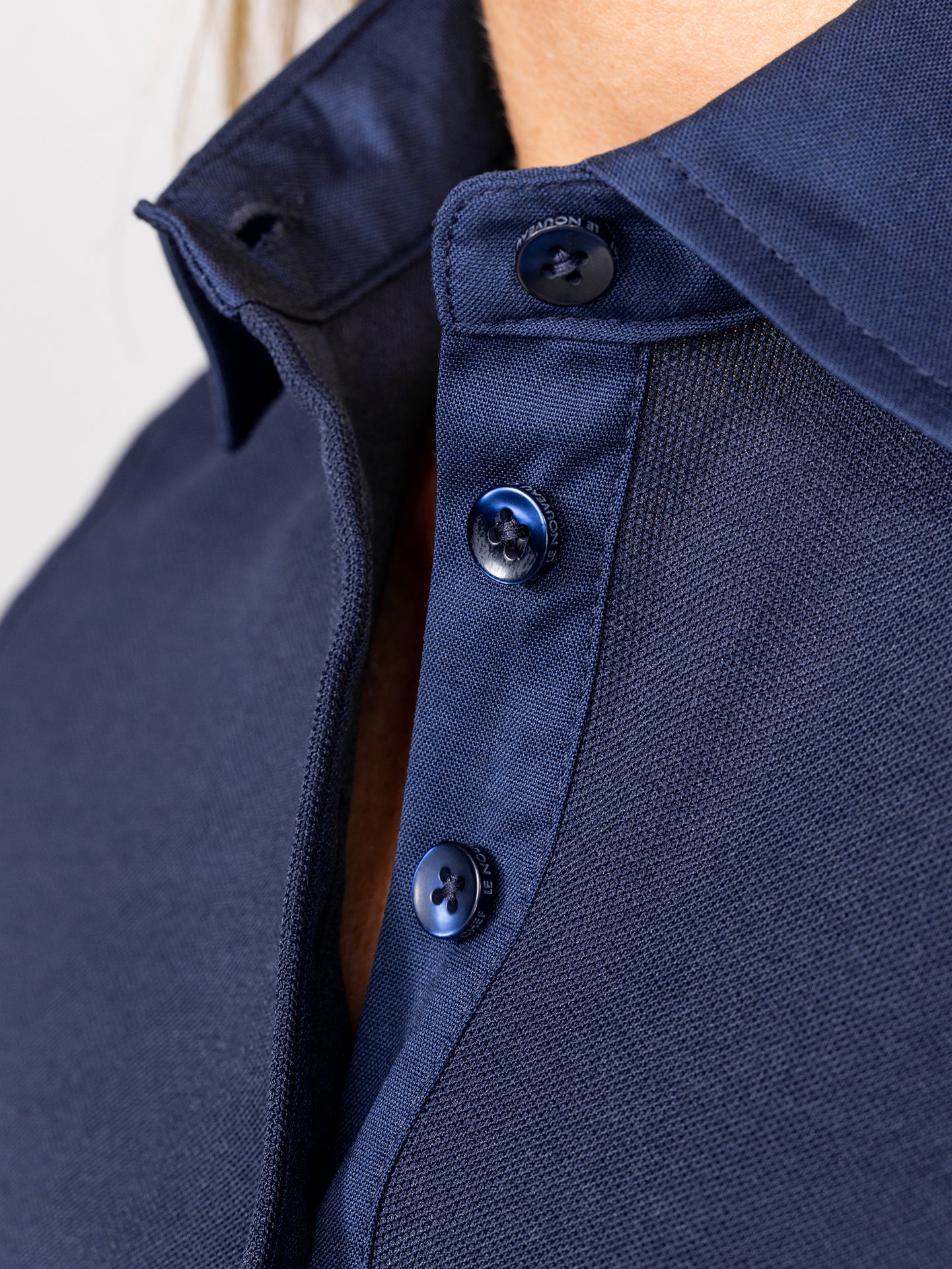Longsleeve Polo Alice is a modern interpretation of the classic polo shirt, especially created for waitresses. By using woven fabric for the cuffs and collar, this shirt is both sporty and classic at the same time. The high quality polo-piqué fabric is made from Bio-cotton and recycled PET bottles.