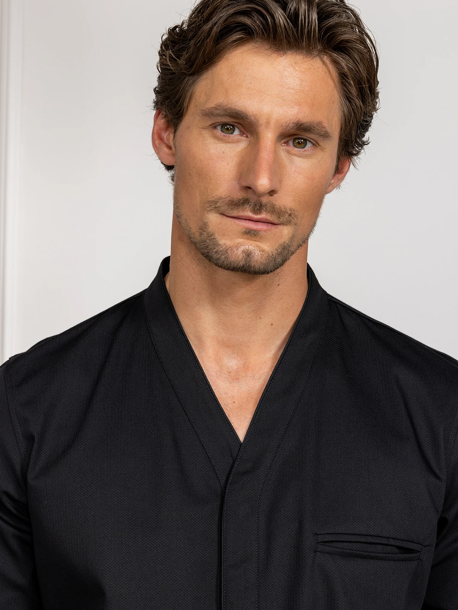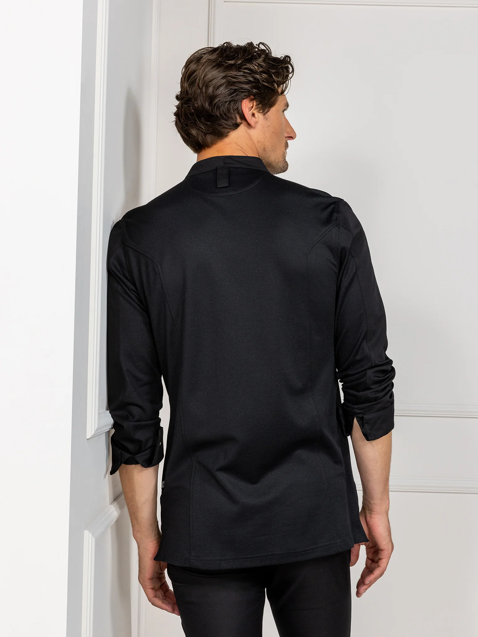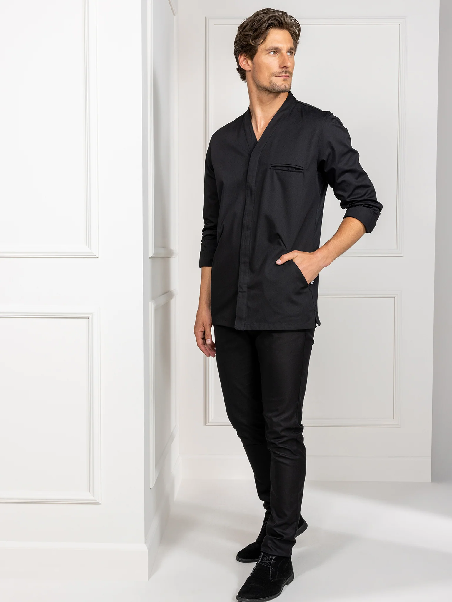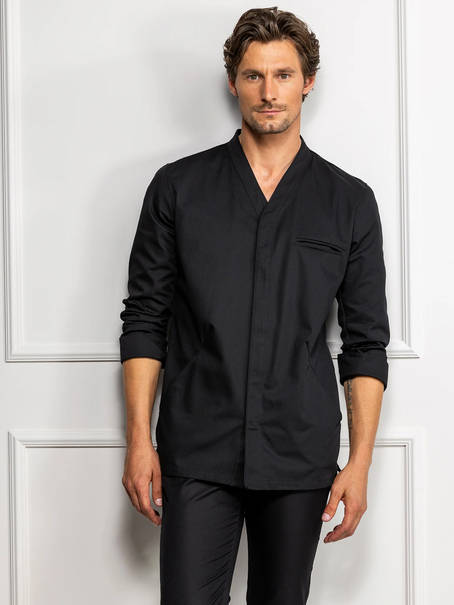 Made from luxurious herringbone fabric, this Asian style chef jacket with v-neck and side pockets meets the highest standard in chef fashion. By using stretch fabric on the back of the chef jacket, Andreas fits perfectly.