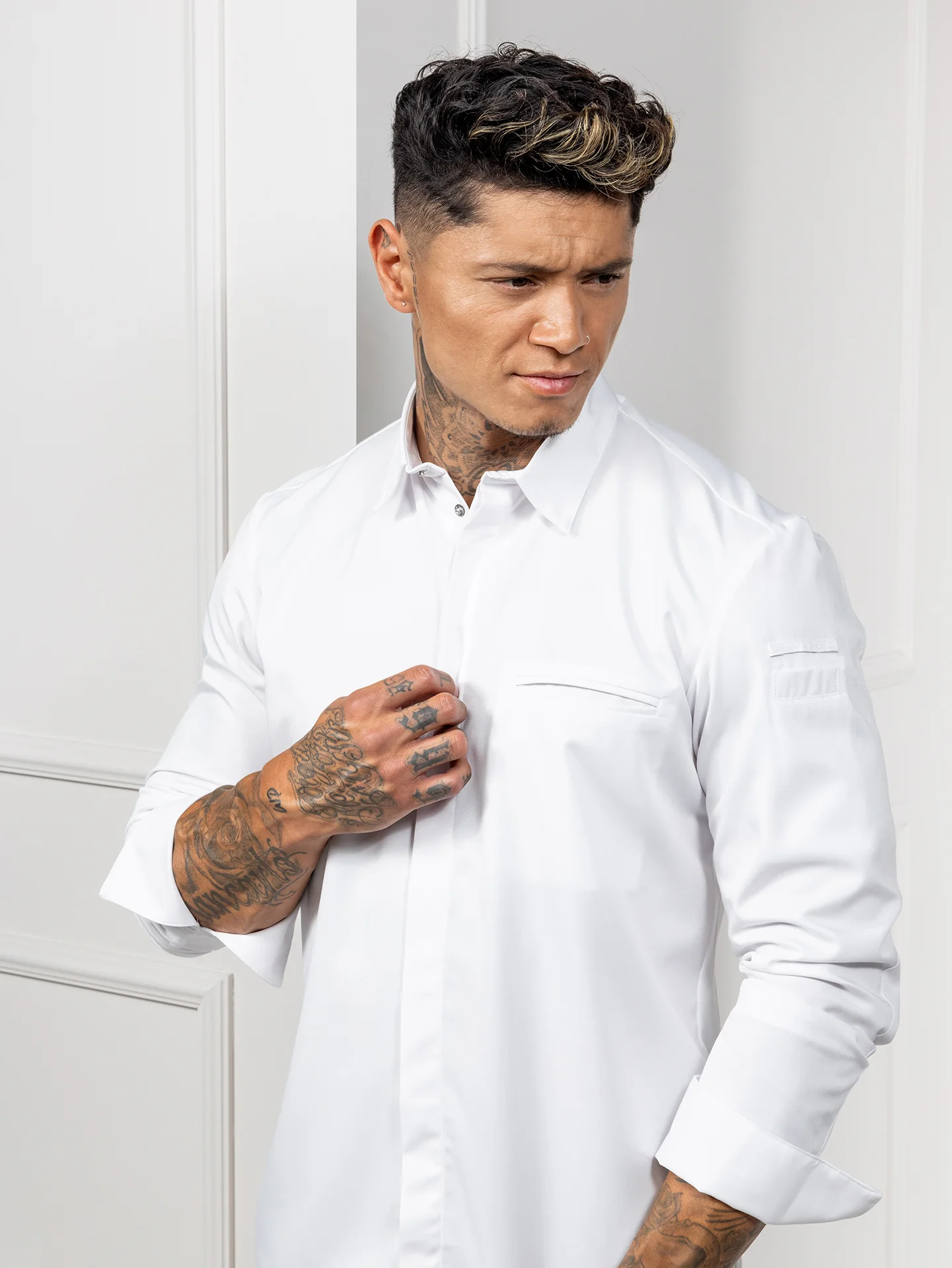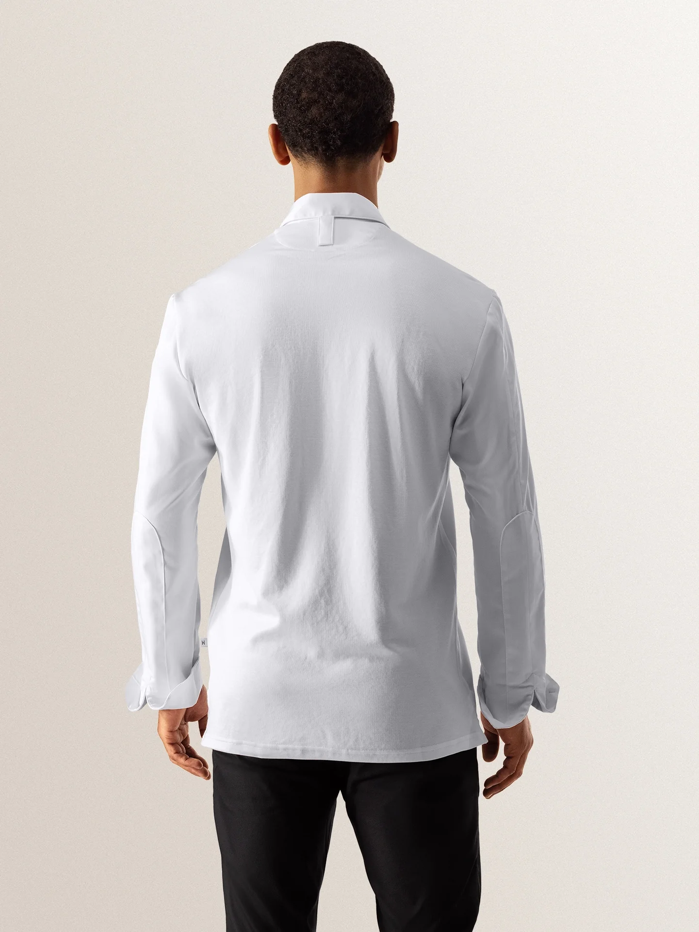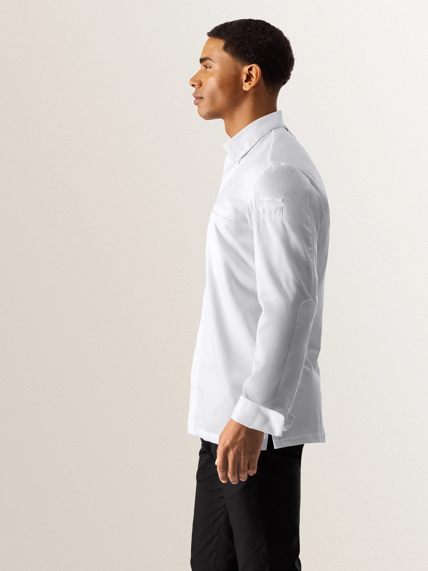 Fashionable and comfortable, this white chef jacket fits both ways. Made from the highest class satin weave fabric, a very light weight fabric. By using stretch on the back, this chef jacket is elastic in all directions.