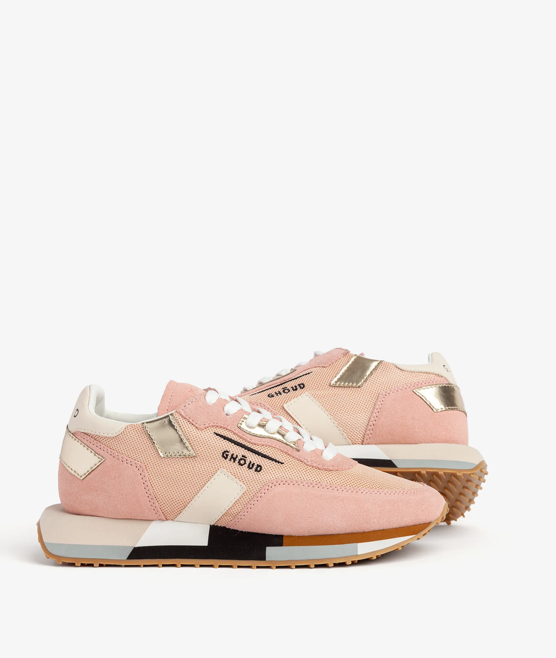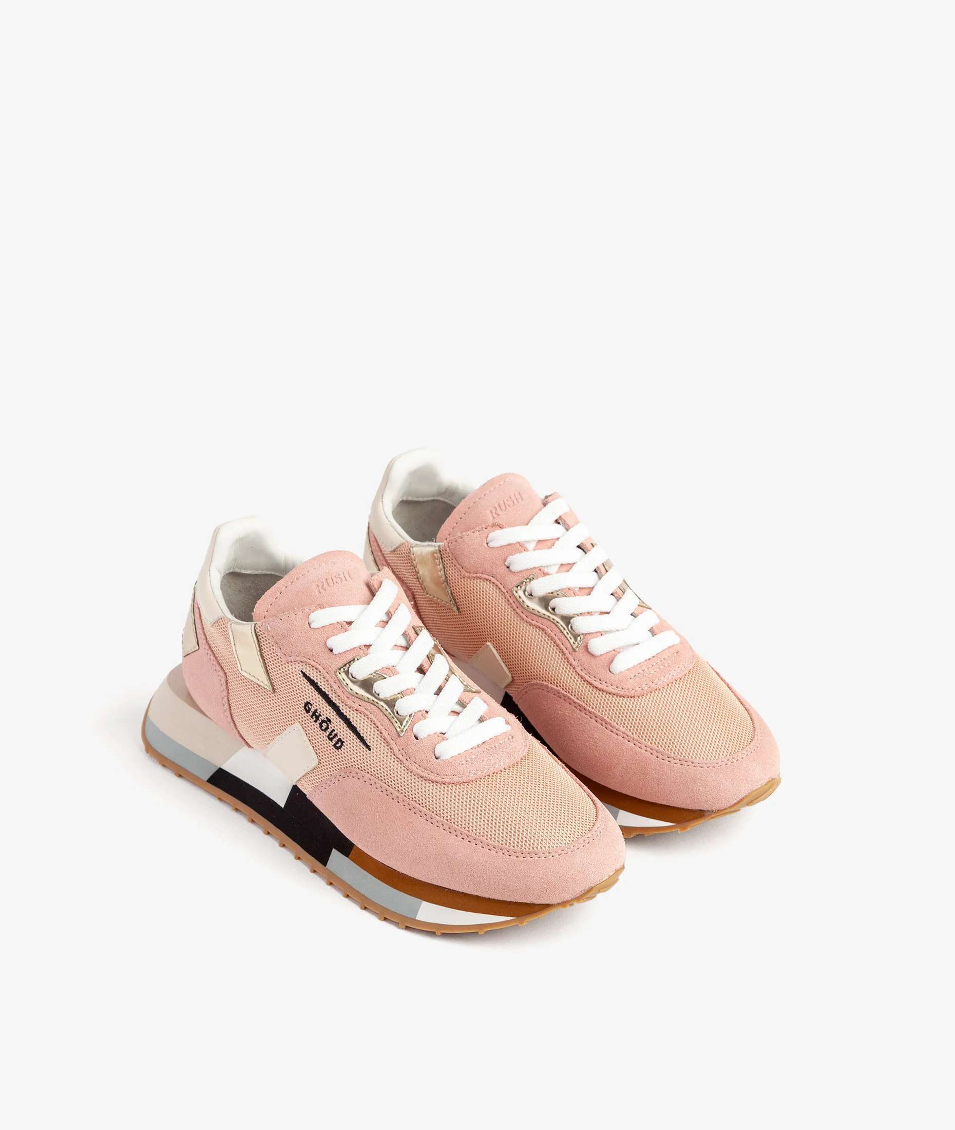 Chaussure contemporaine, fashion running, le modèle Rush Multicolor de Ghōud présente un design minimal caractérisé par des lignes géométriques et décisives. Tige en maille et en daim avec des détails en cuir miroir. Onglet en daim contrastant avec le nom du modèle imprimé. Semelle multicolore pour un look distinctif. Logo emblématique imprimé sur le côté.