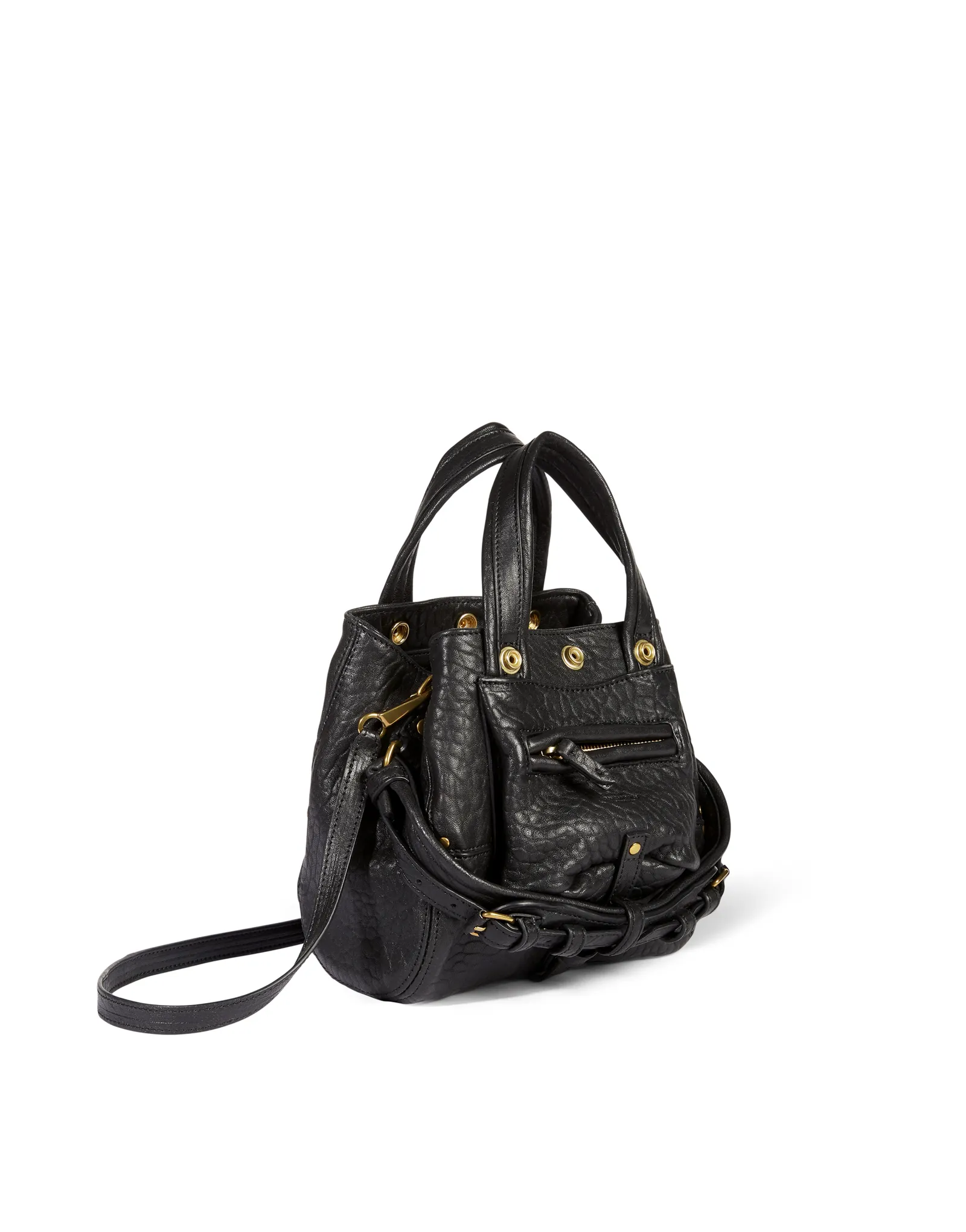 Mini-sac bandoulière, porté à la main. Deux poignées en cuir et une bandoulière en cuir amovible et ajustable. Fermeture par des boutons pressions.