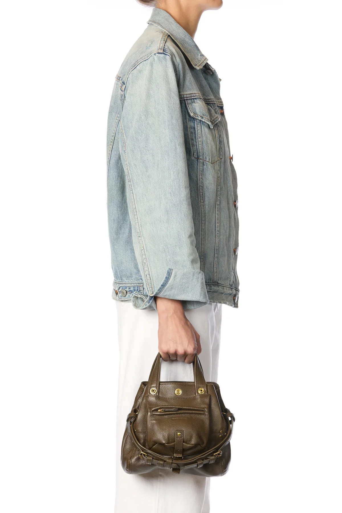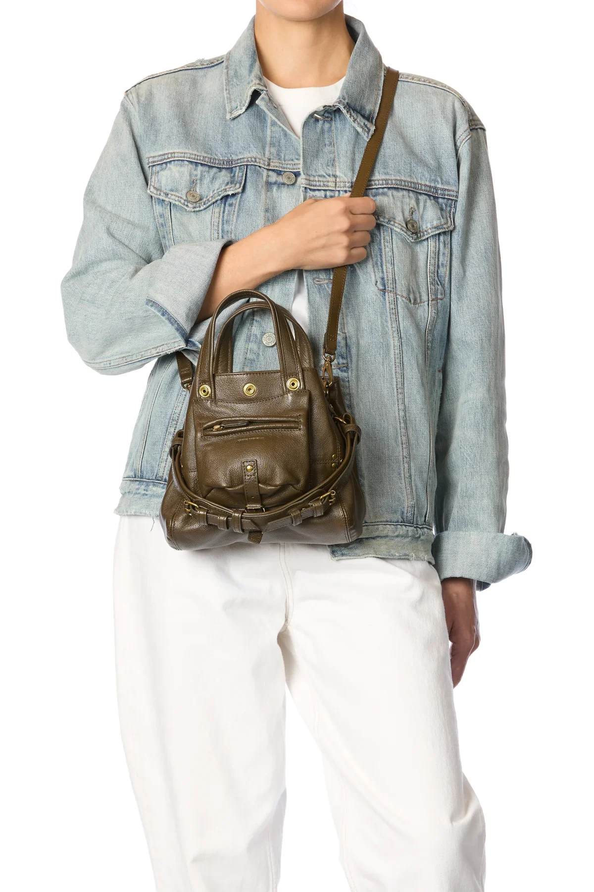 Mini -sac bandoulière, porté à la main. Deux poignées en cuir et une bandoulière en cuir amovible et ajustable. Fermeture par des boutons pressions.