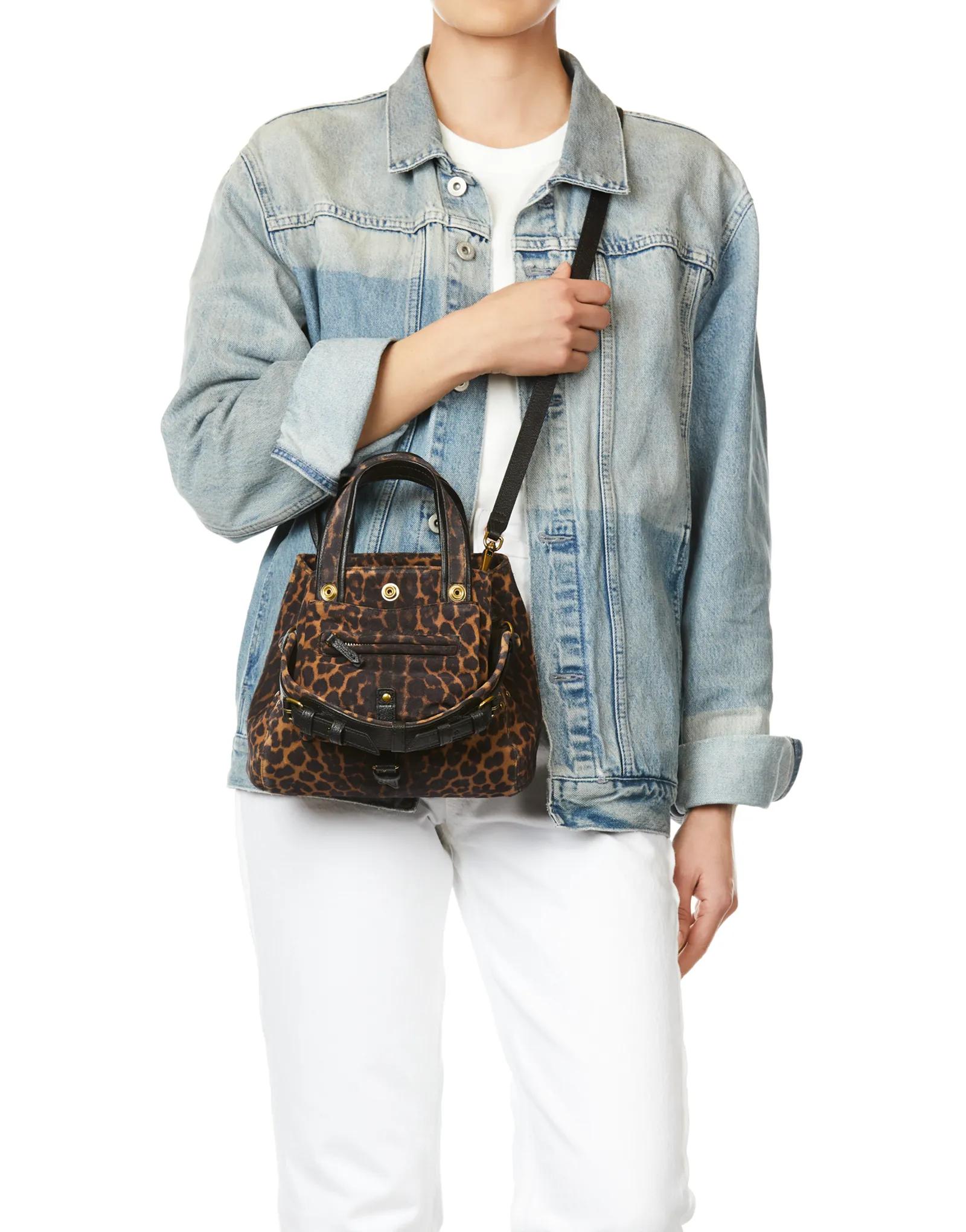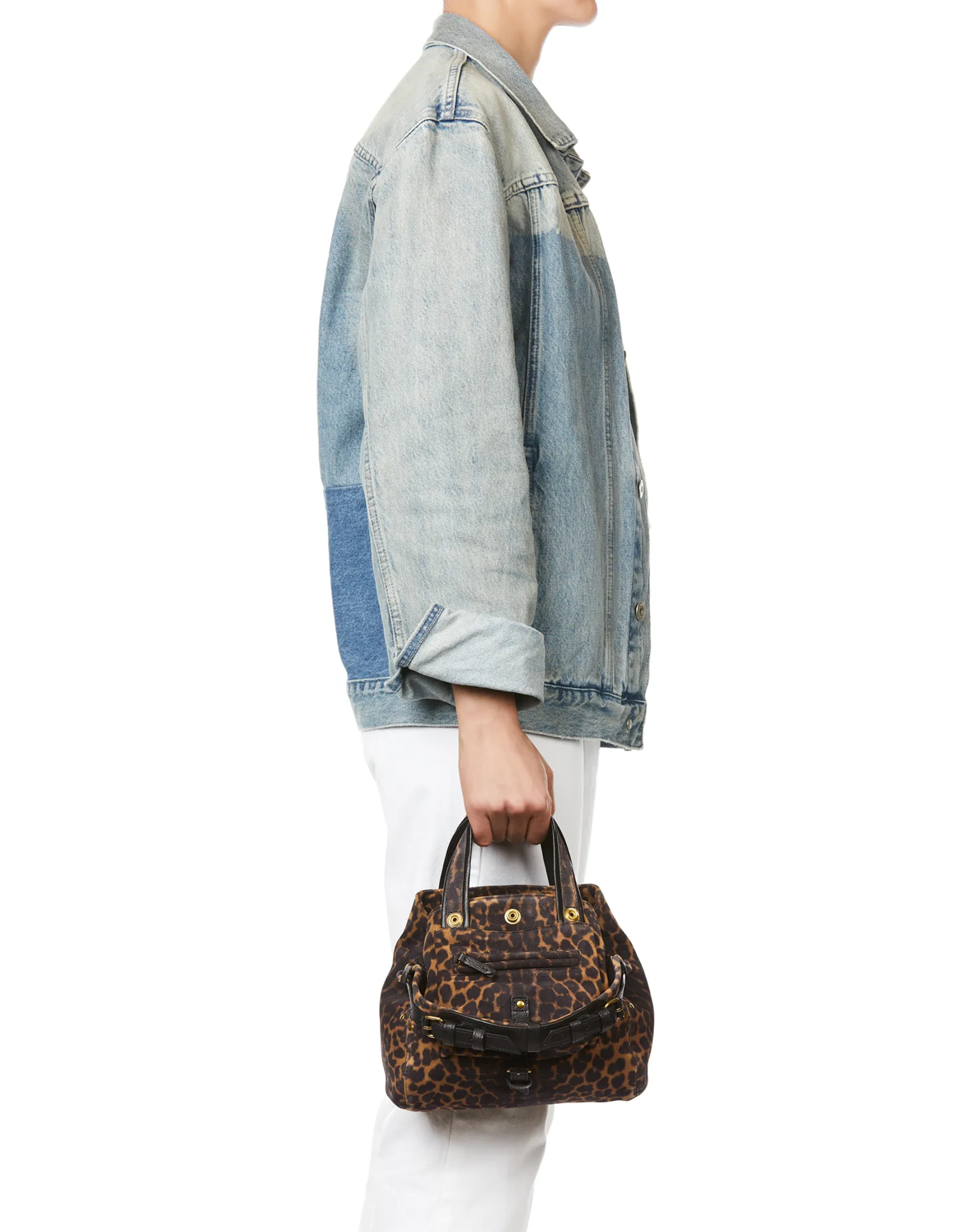 Mini-sac bandoulière, porté à la main. Deux poignées en cuir et une bandoulière en cuir amovible et ajustable. Fermeture par des boutons pressions.