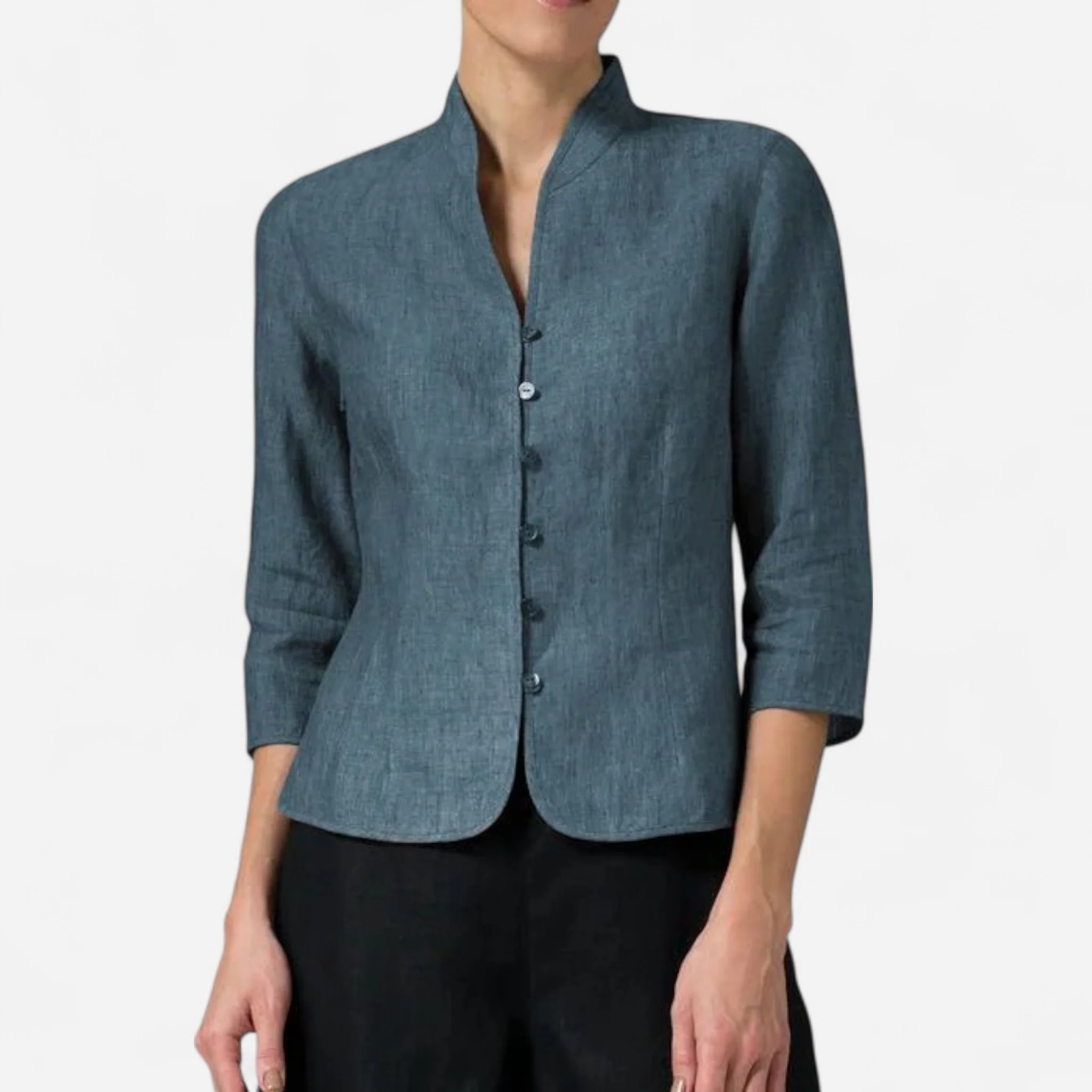 Blouse en Lin Mélangé à Col Mandarin – Manches 3/4 Ajustée