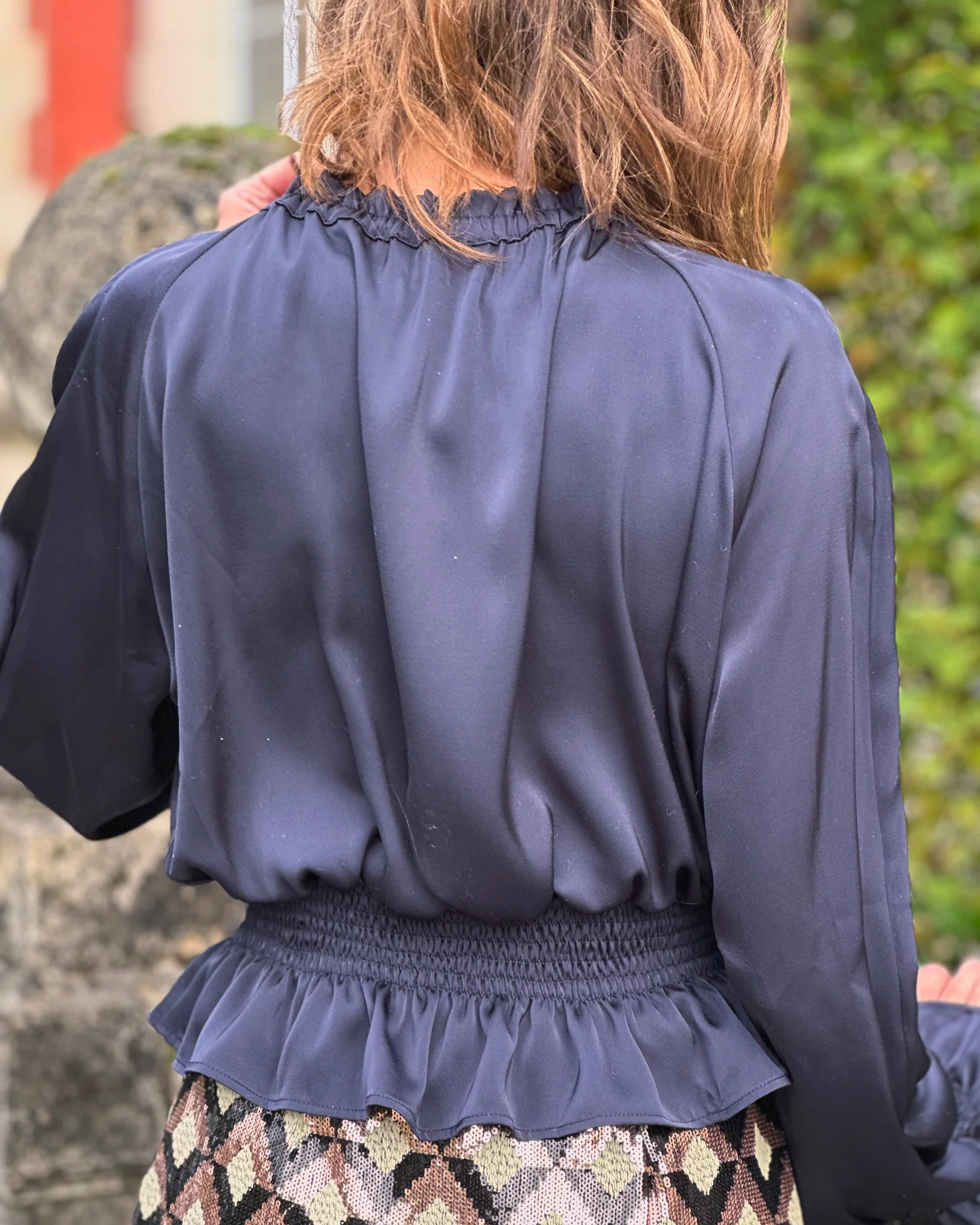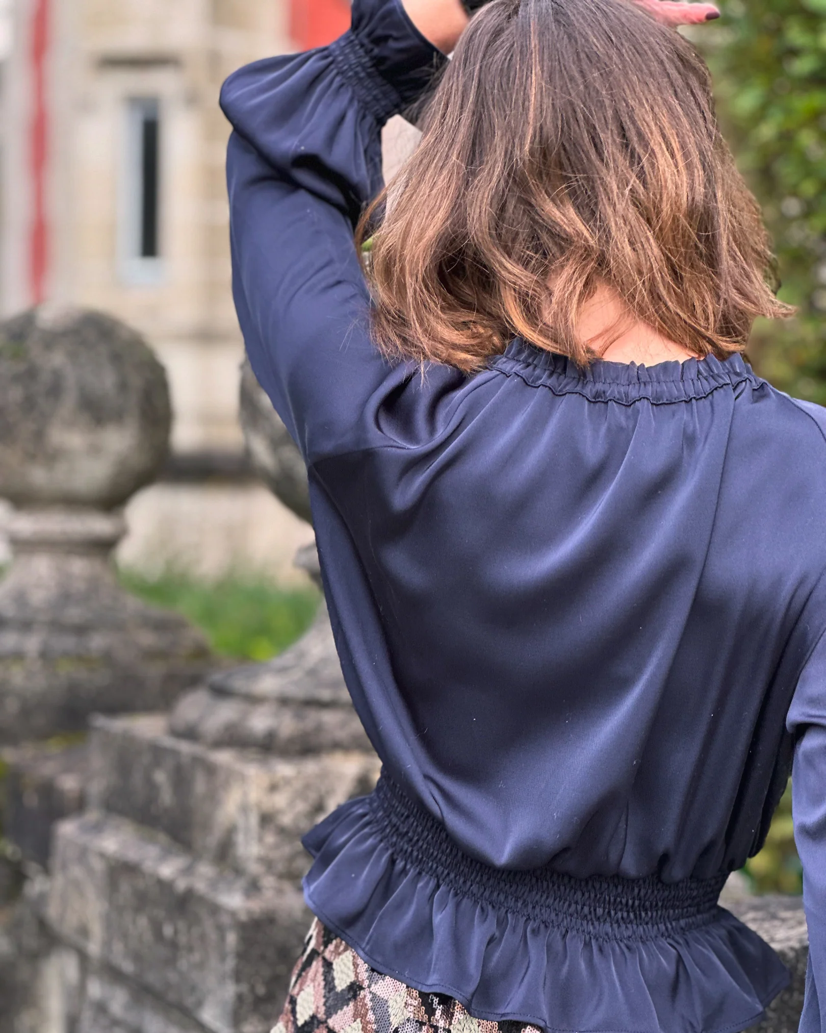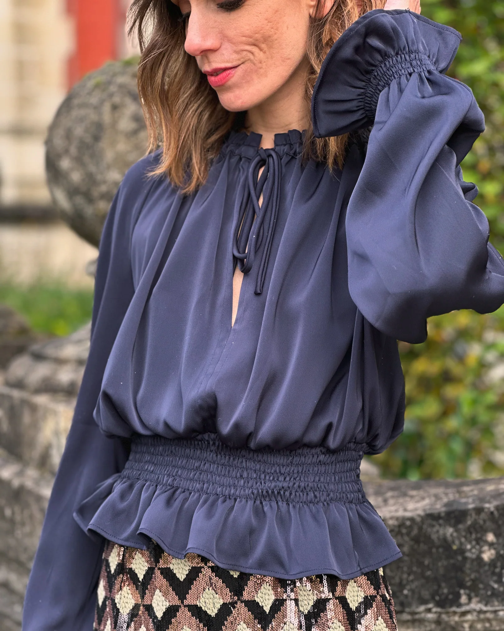 Top coquet avec liens qui permettent d’ouvrir ou fermer le décolleté