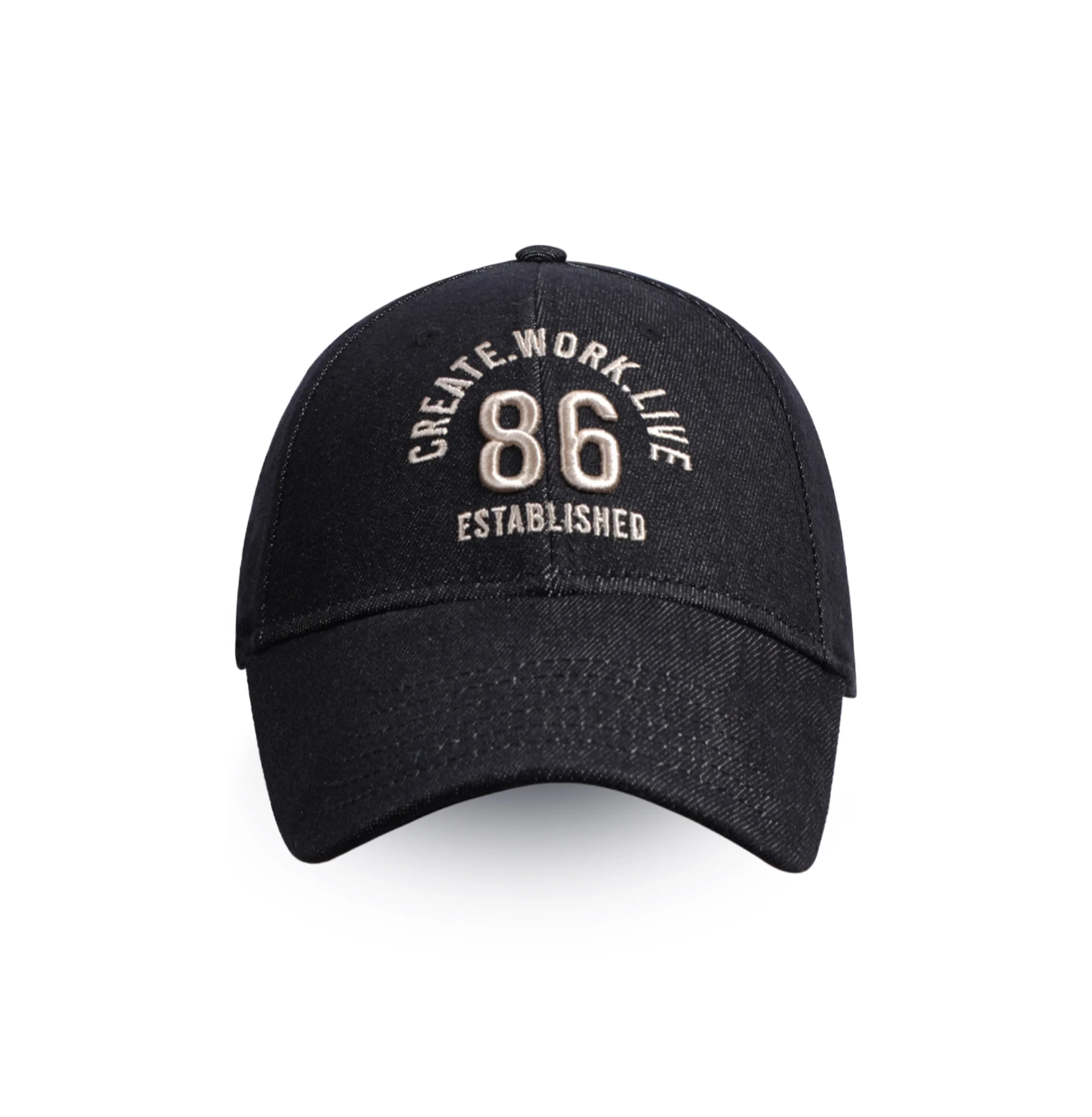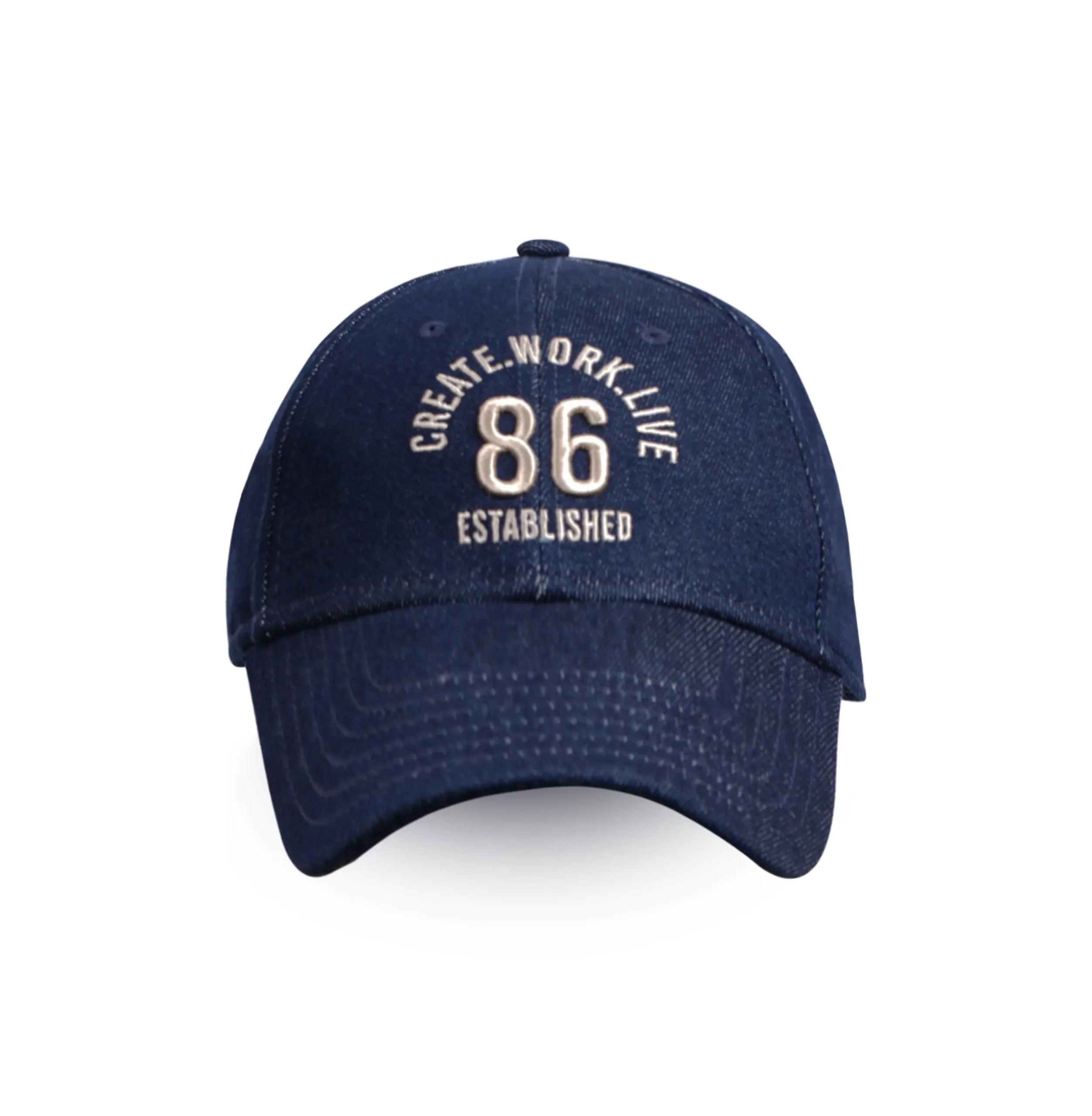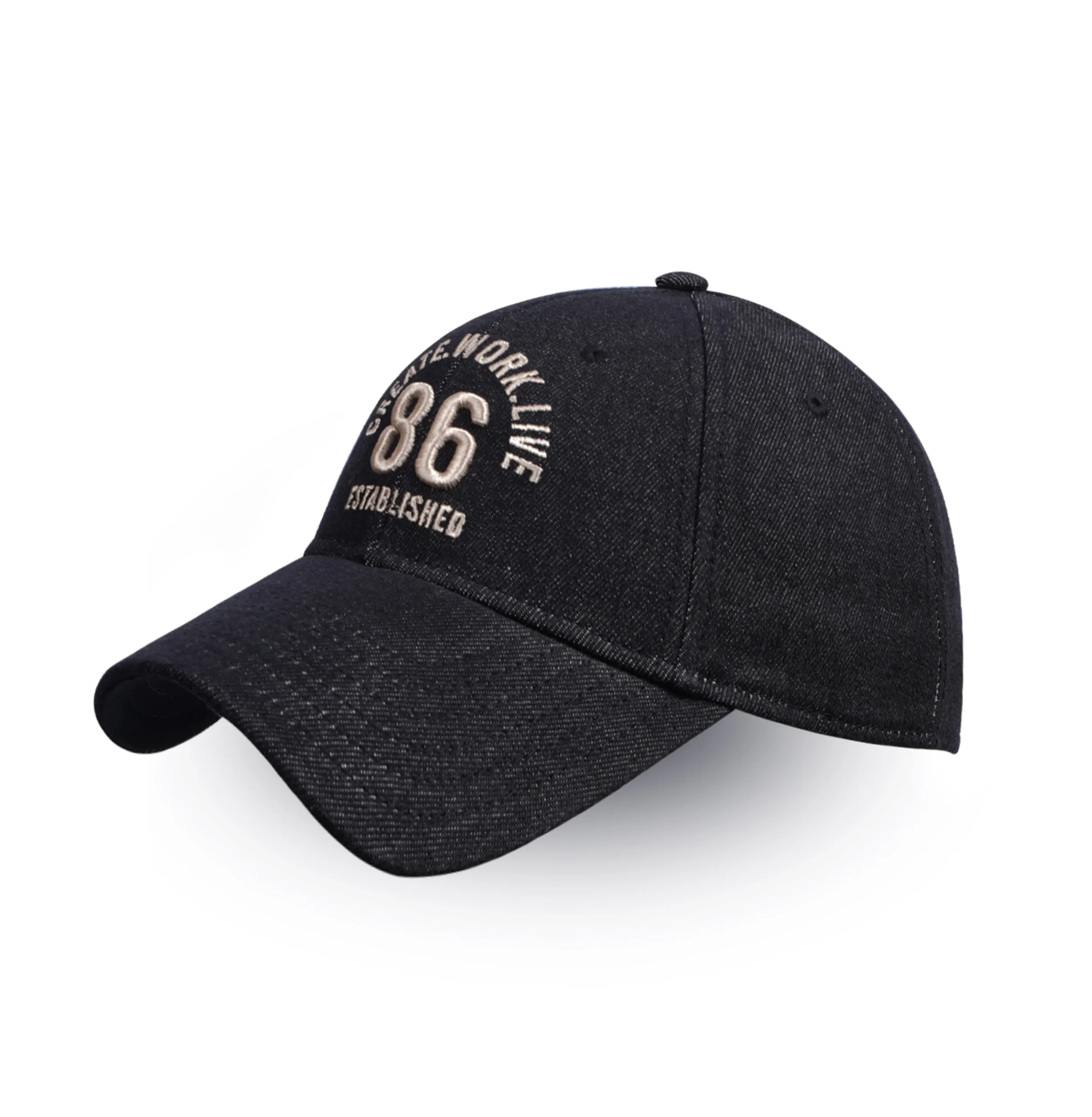 Casquette de baseball a six panneaux, en tissu gros denim délavé, avec sangle arrière classique ajustable et broderie sur le milieu devant.