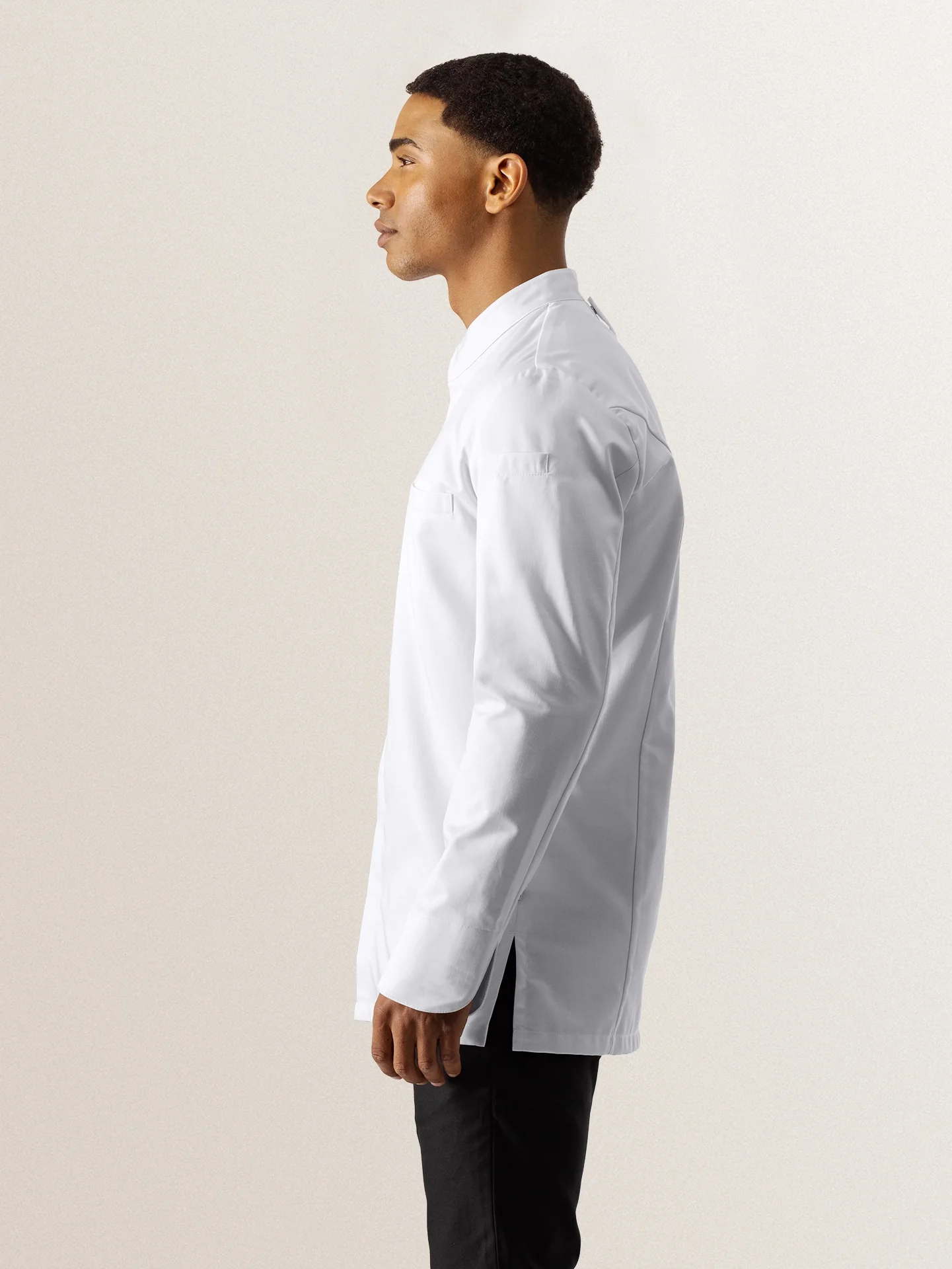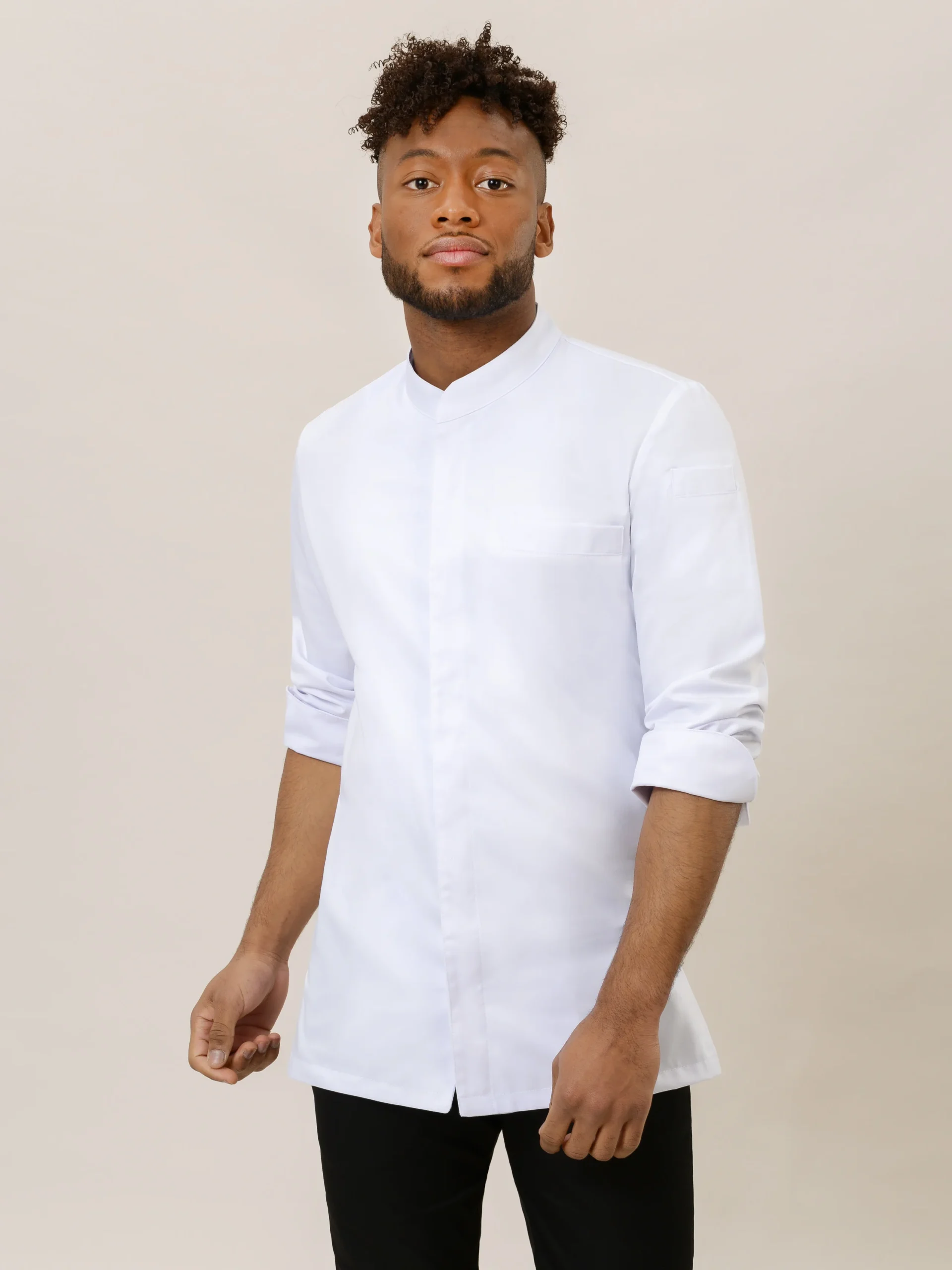 This trendy chef jacket with invisible closure is made from a fabric which features moisture regulation and minimal shrinkage. With its unique fit and soft fabric with satin binding, this white chef jacket has a very luxurious appearance.