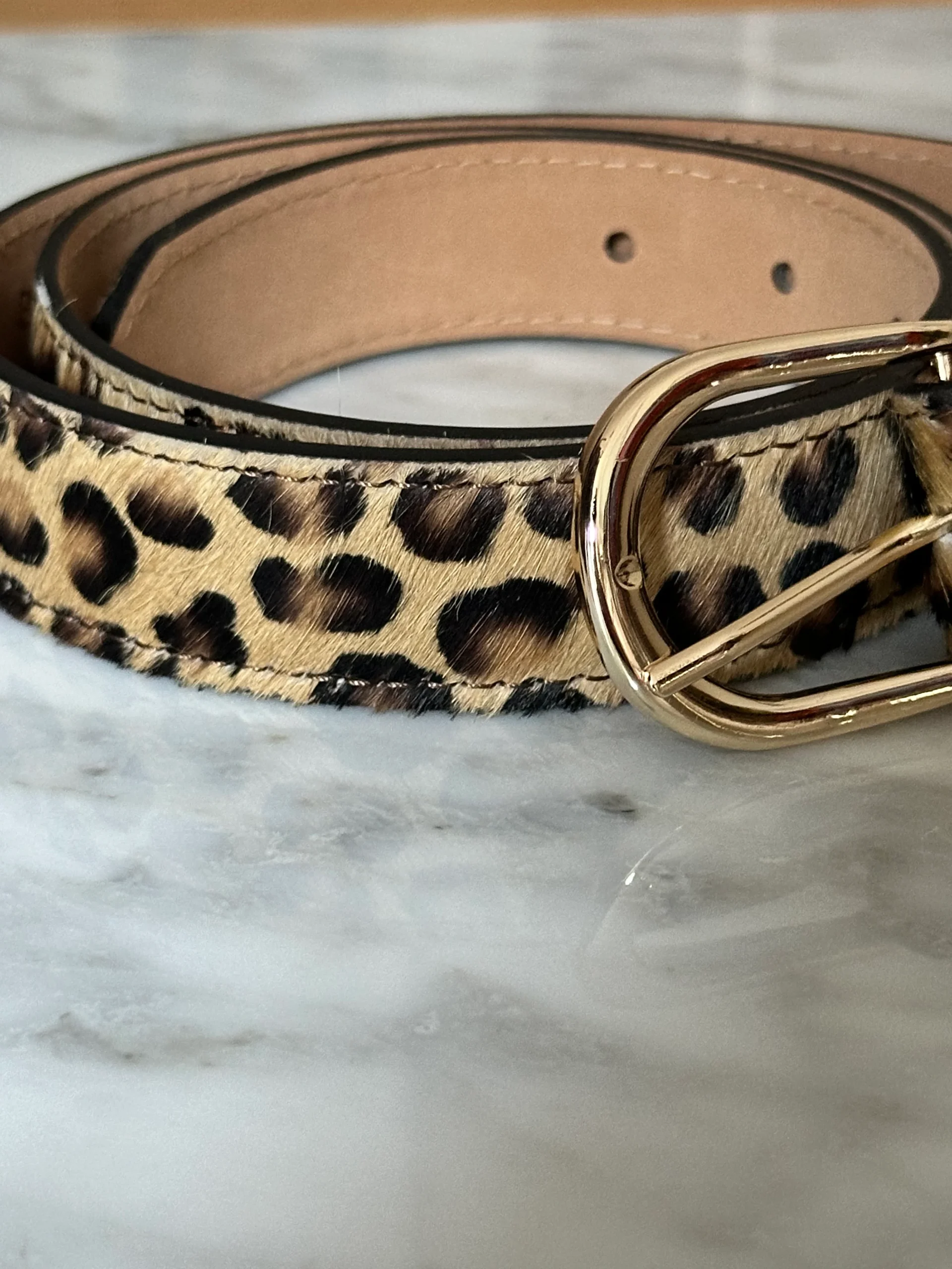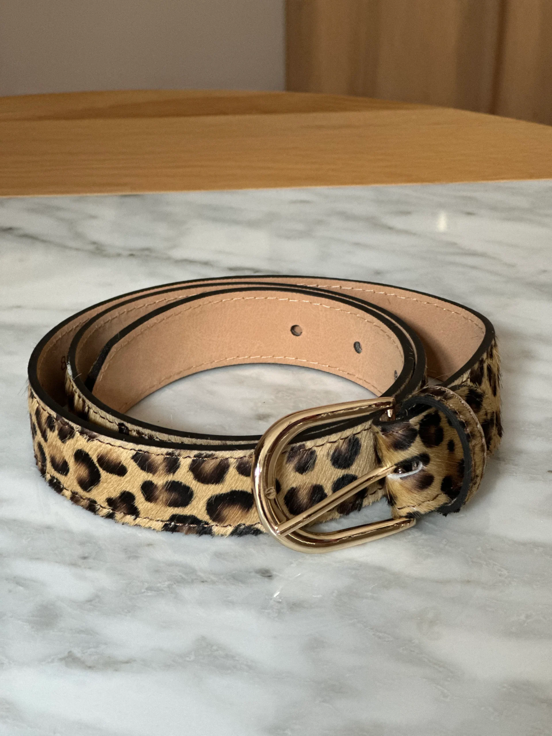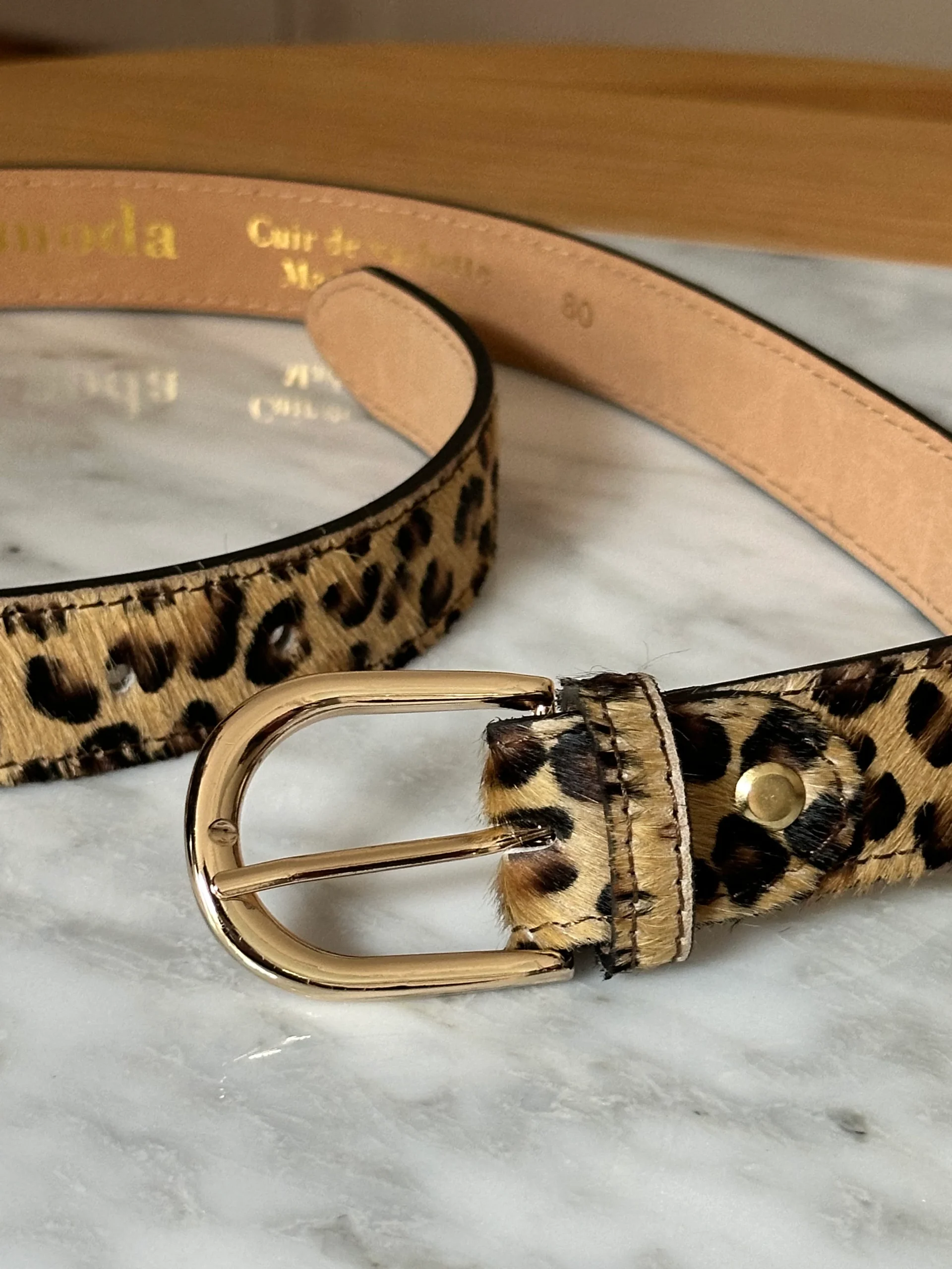 Jolie ceinture en cuir véritable imprimé léopard. Touché peau de bête. Boucle dorée. Existe en 3 tailles : S/M/L