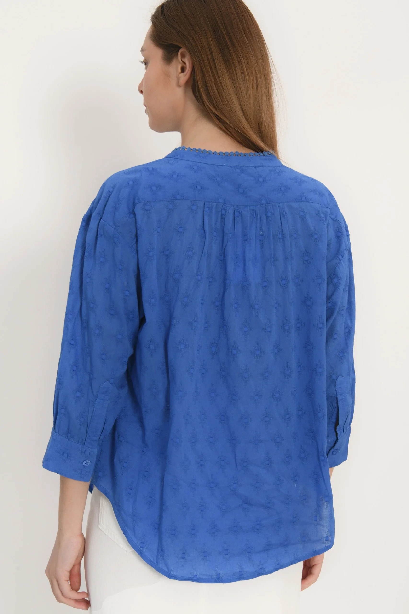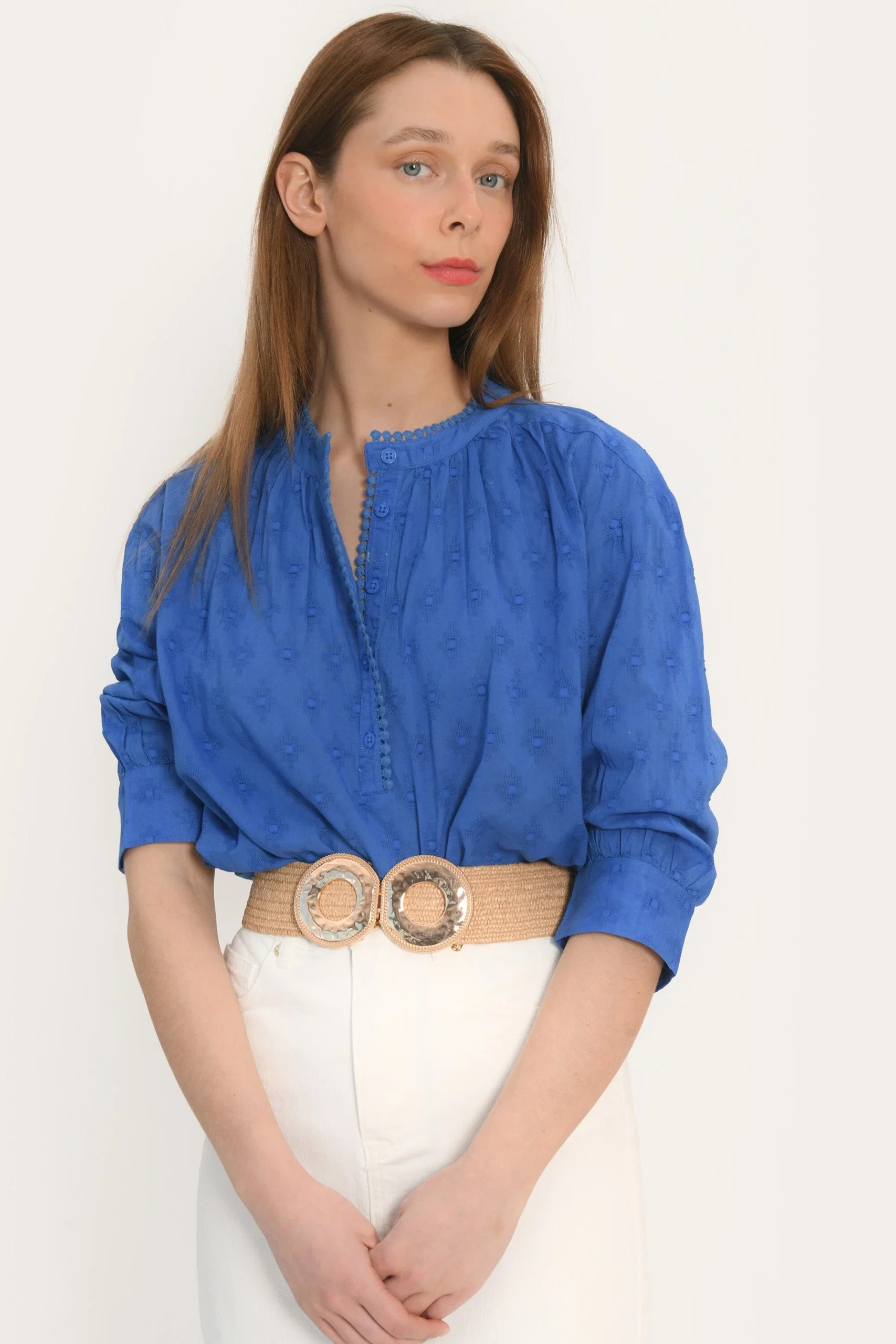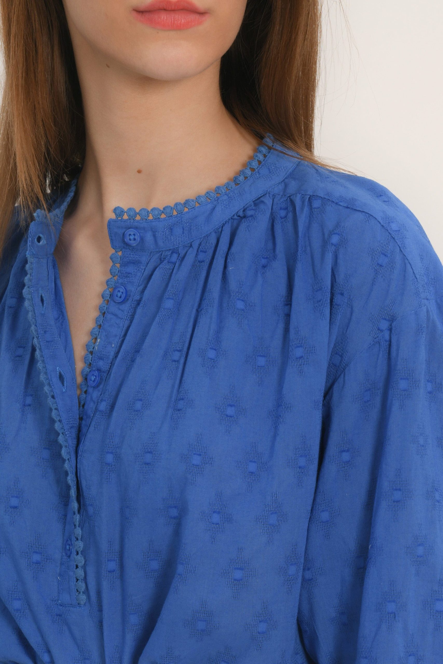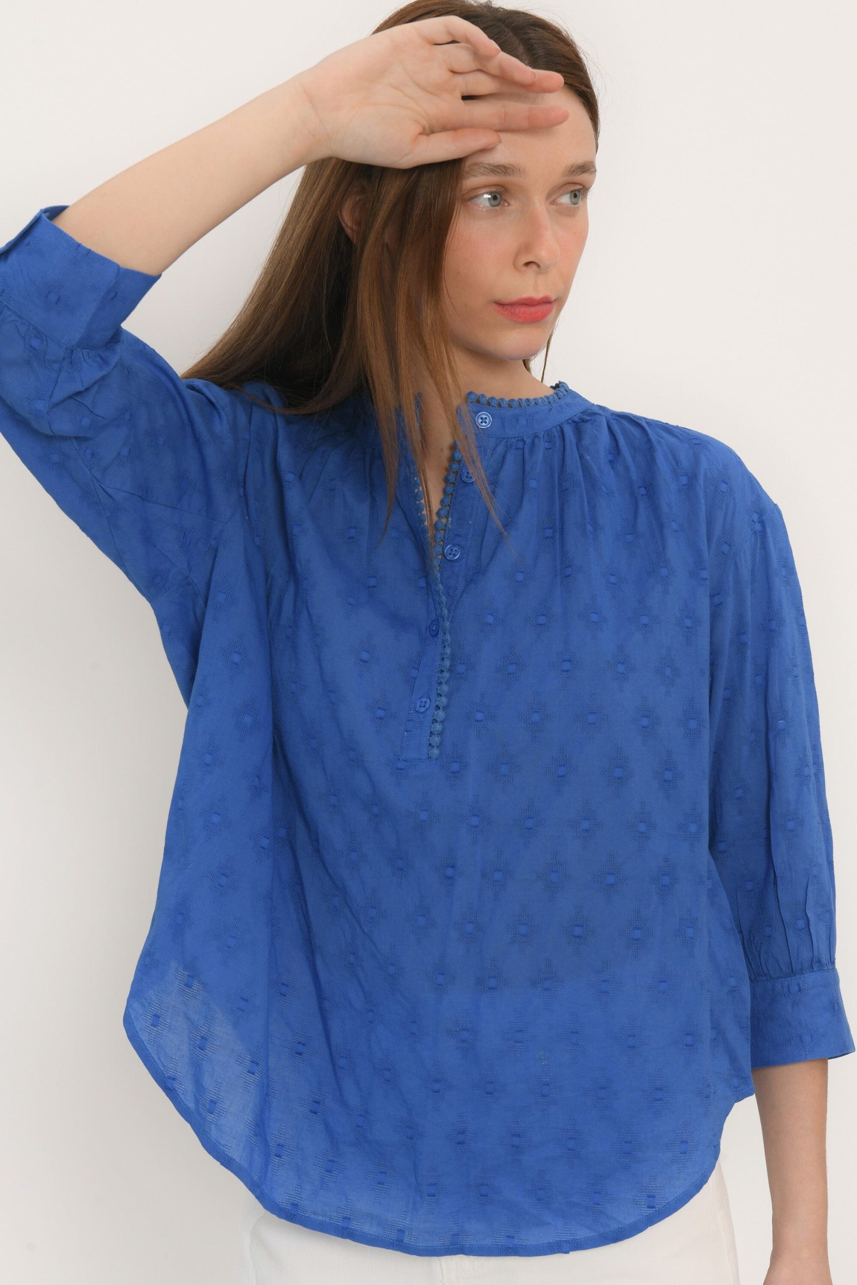 Esprit bohème toute en élégance avec la blouse AssamConfectionnée en coton, tissu entièrement brodé en ton sur tonPetit col montant, boutonnage apparent jusqu’à la tailleJoli détail du croquet soulignant le col et la patte de boutonnageManches 3/4 amples, avec poignet de 5cm fermé par un boutonBas arrondiLongueur 67cm en T36 Emmy mesure 1m77 et porte […]