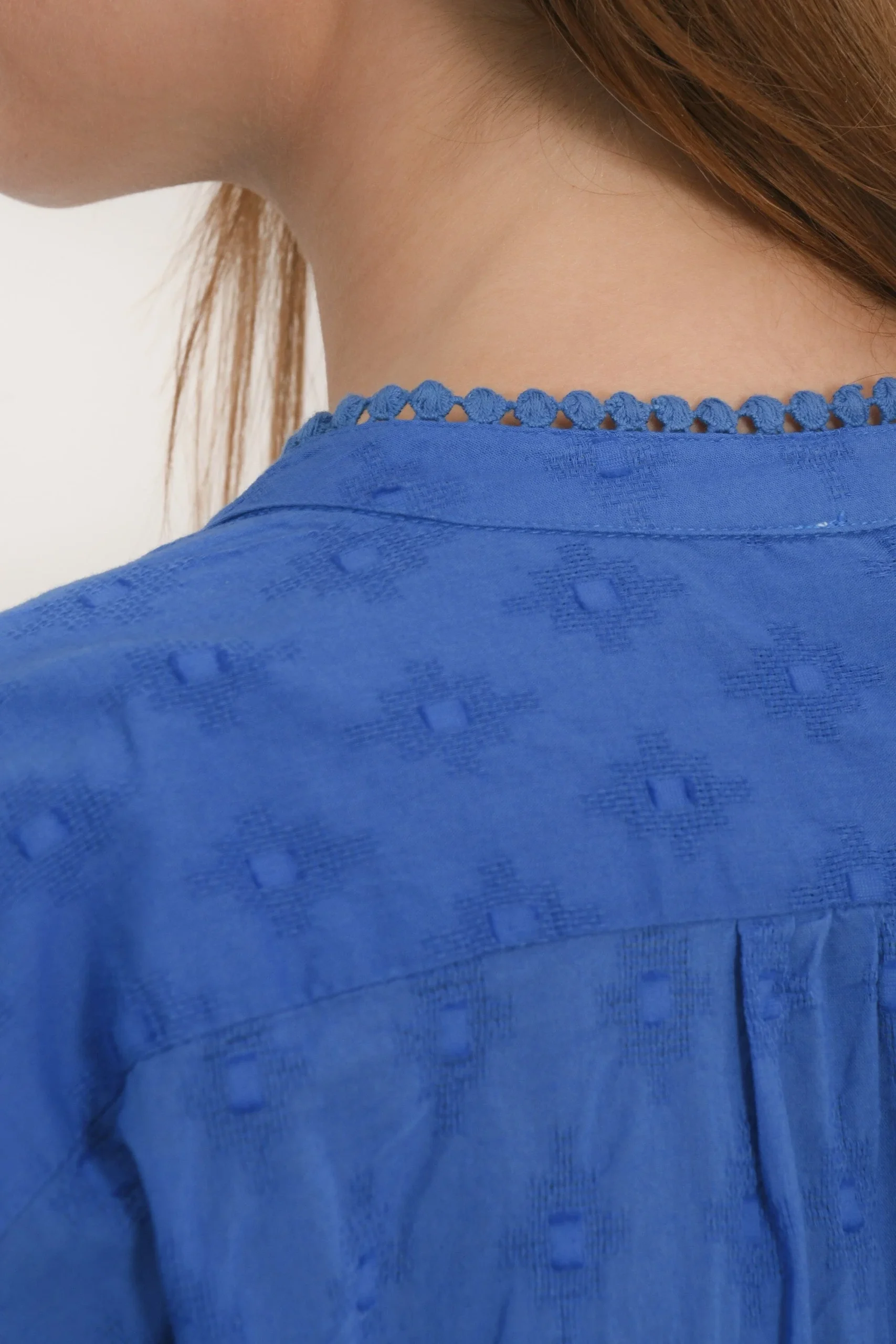 Joli détail du croquet soulignant le col et la patte de boutonnage