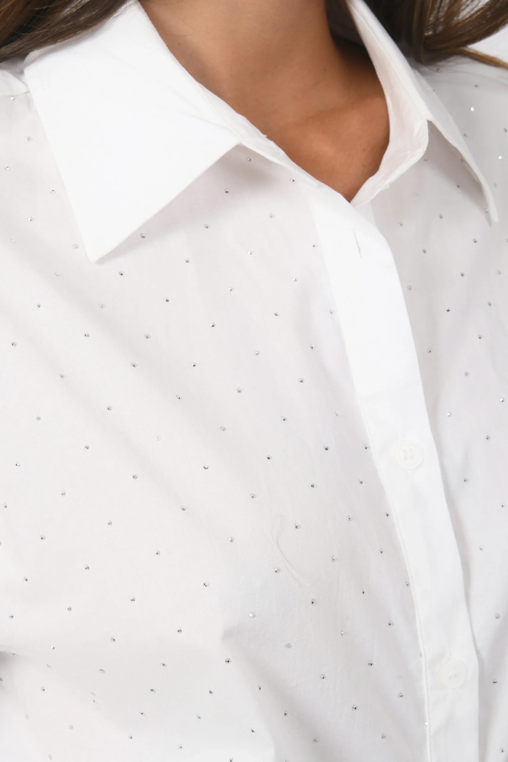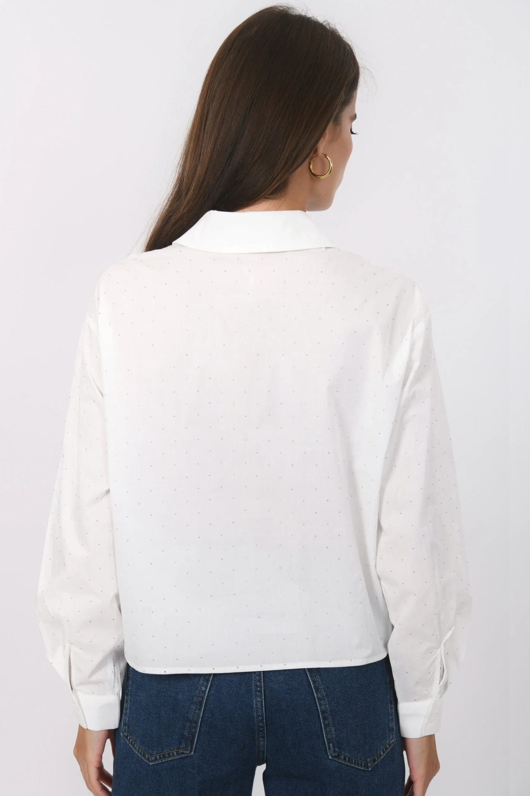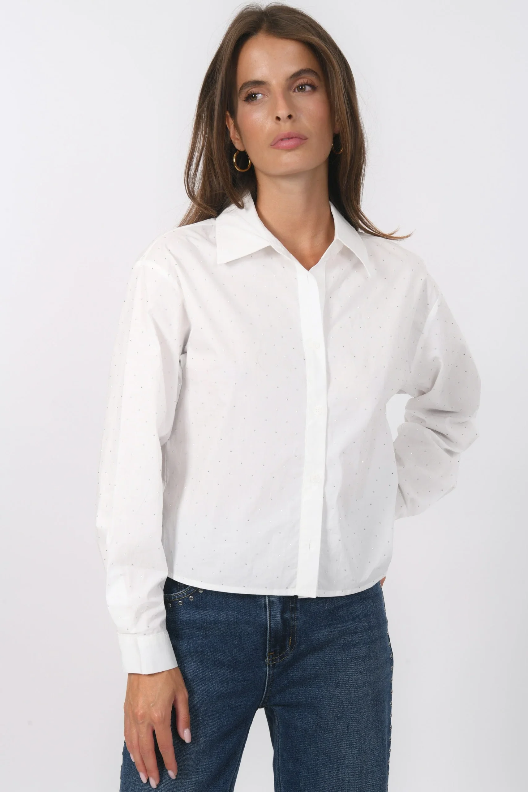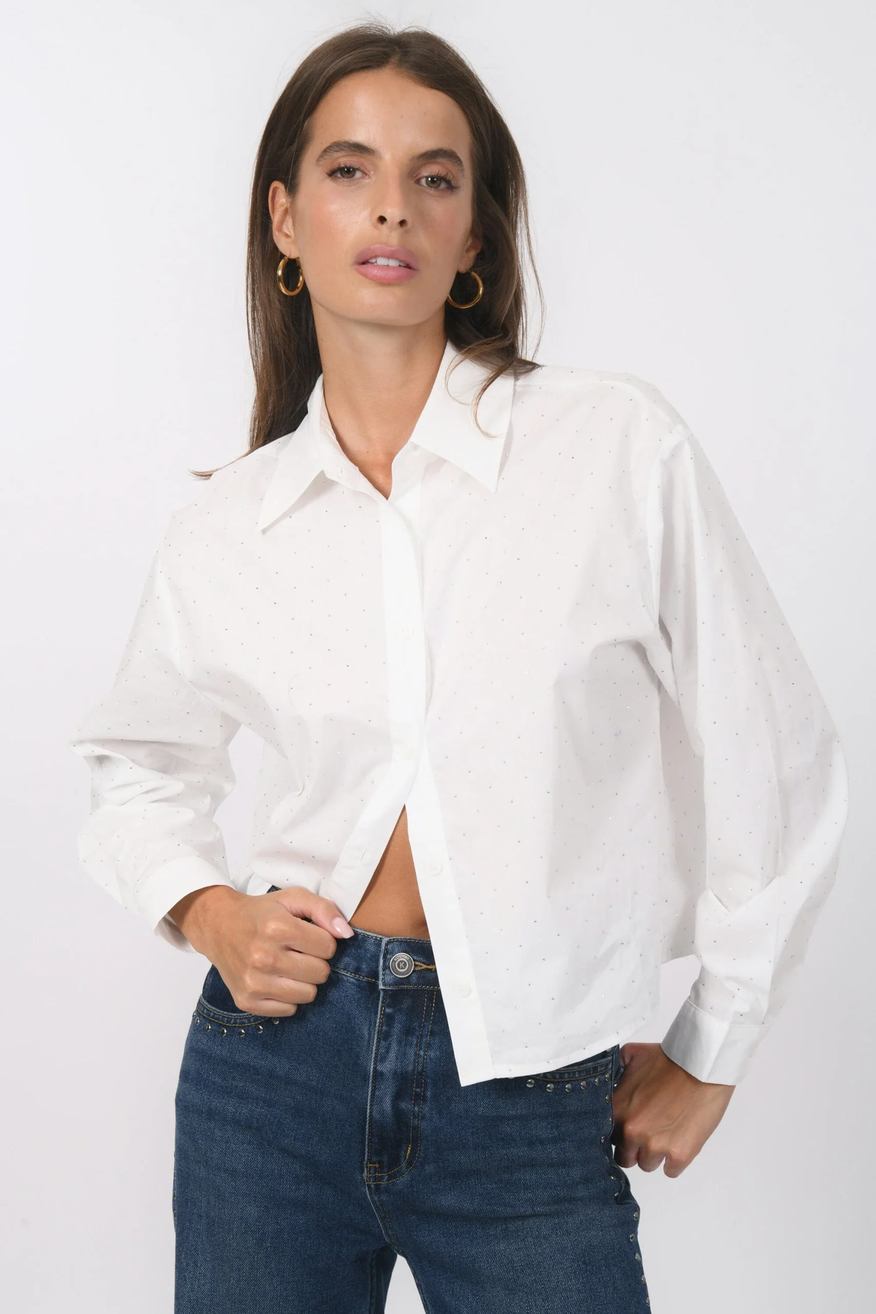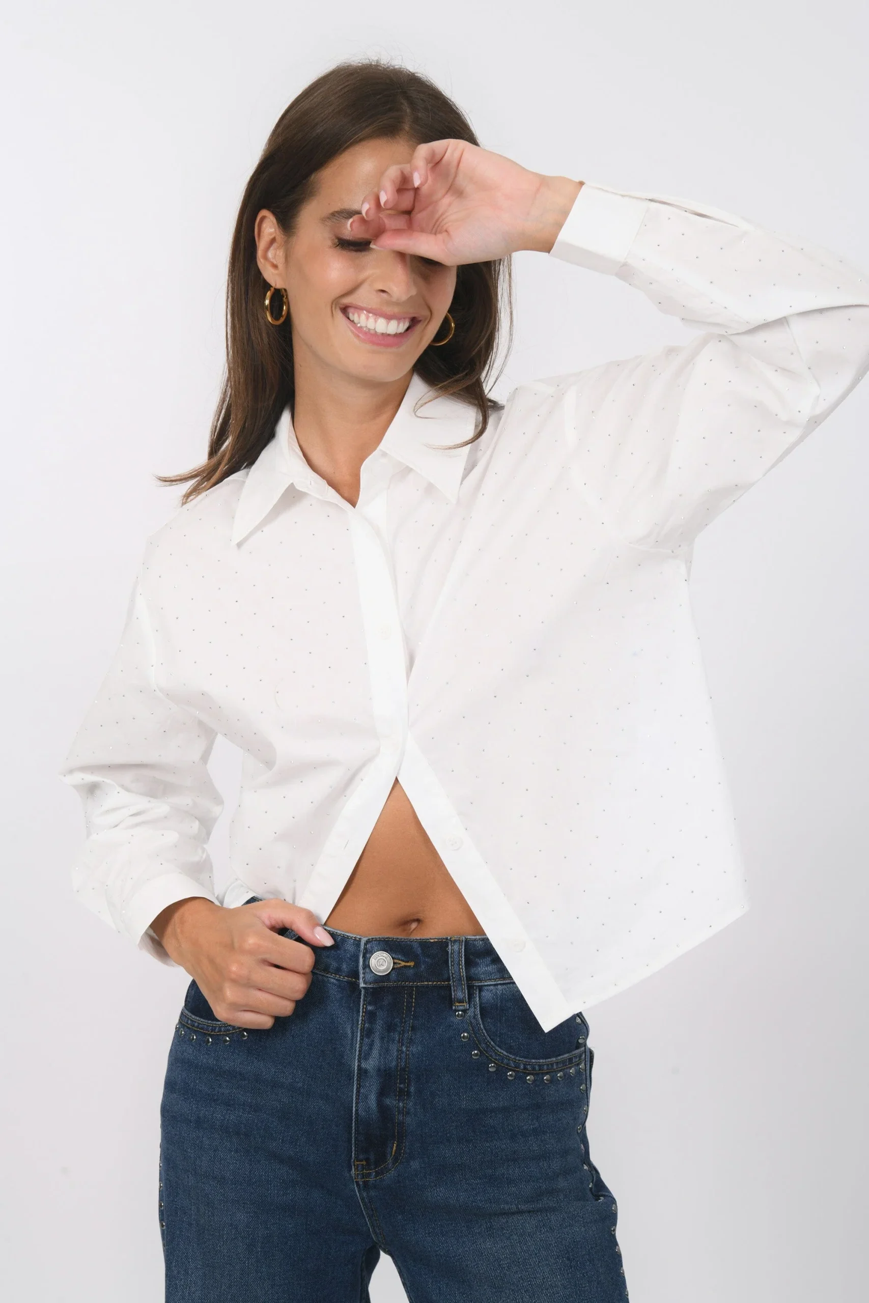 Bassette, la chemise version cropped et scintillante100% coton, entièrement recouvert de petits cristauxCol chemise, boutonnage apparent Manches longues, poignet fermé par un boutonCoupe droiteLongueur 52cm en T36 Inès mesure 1m71 et porte une taille 0