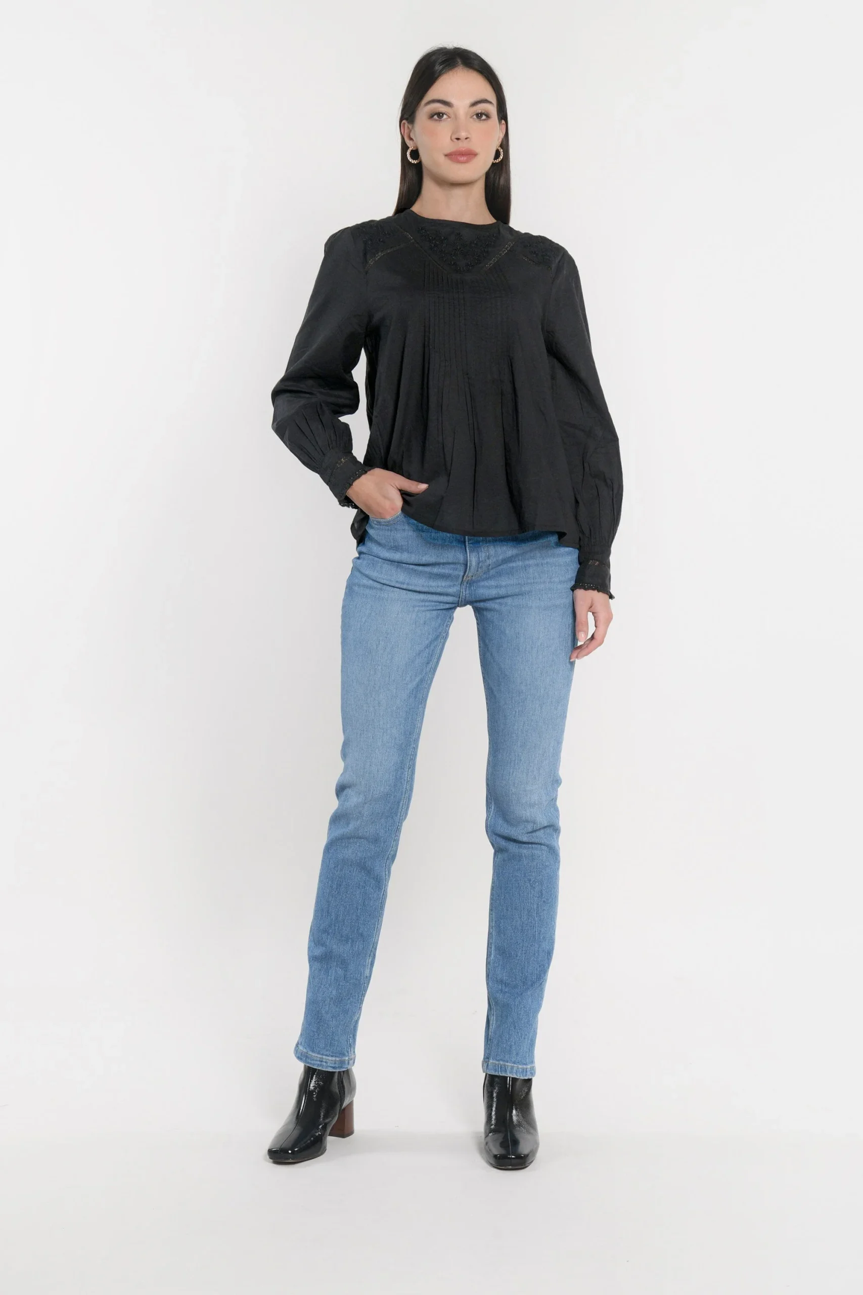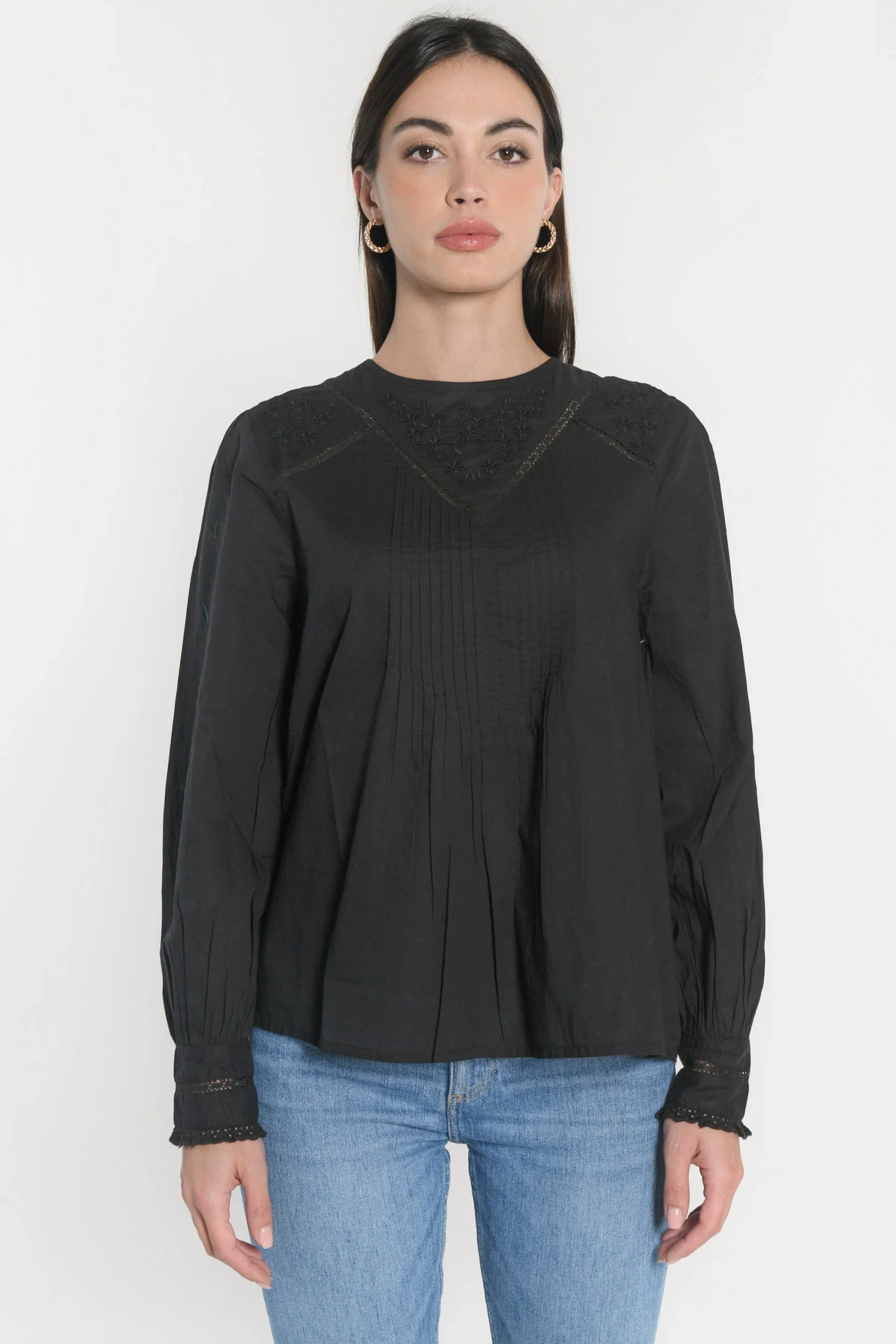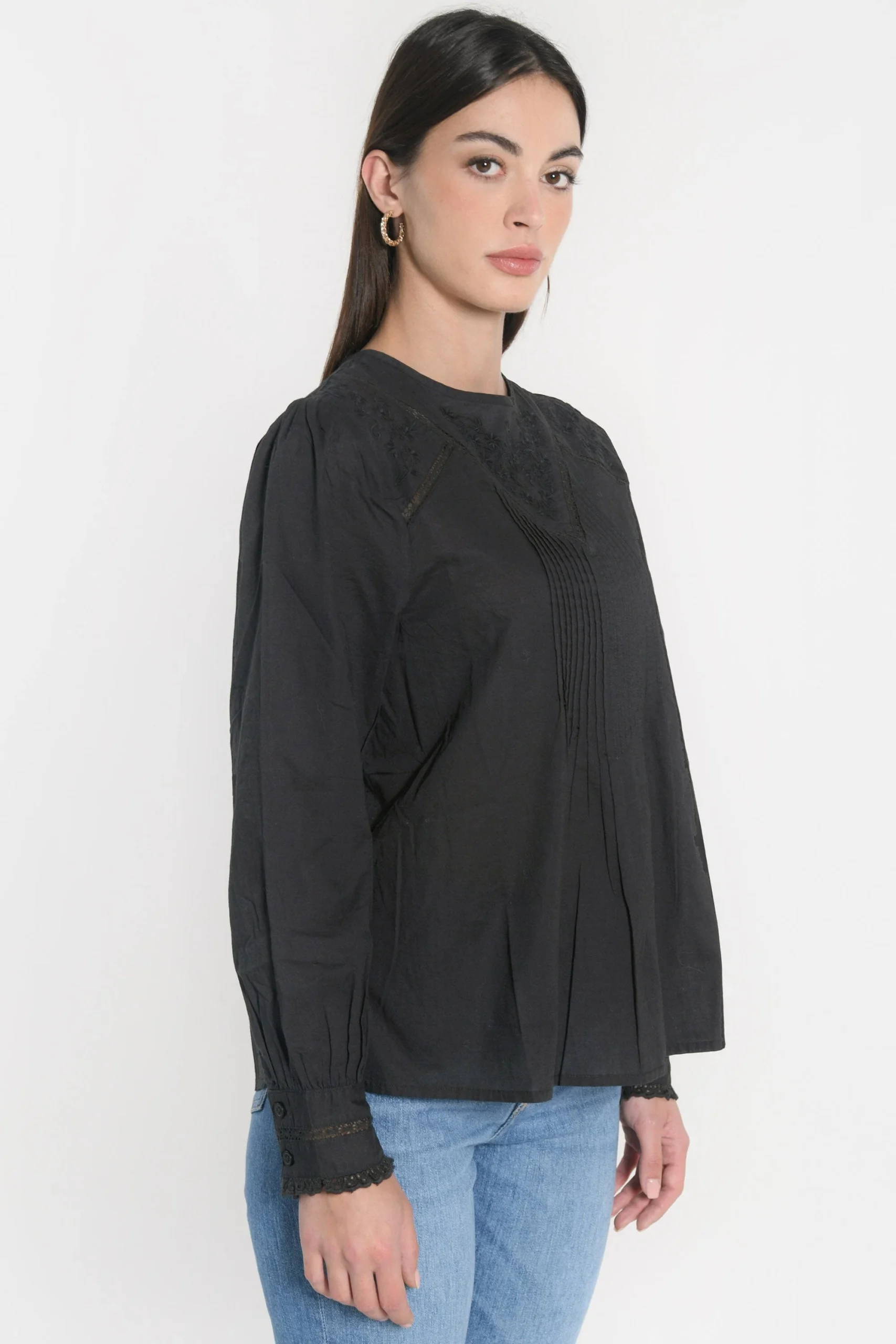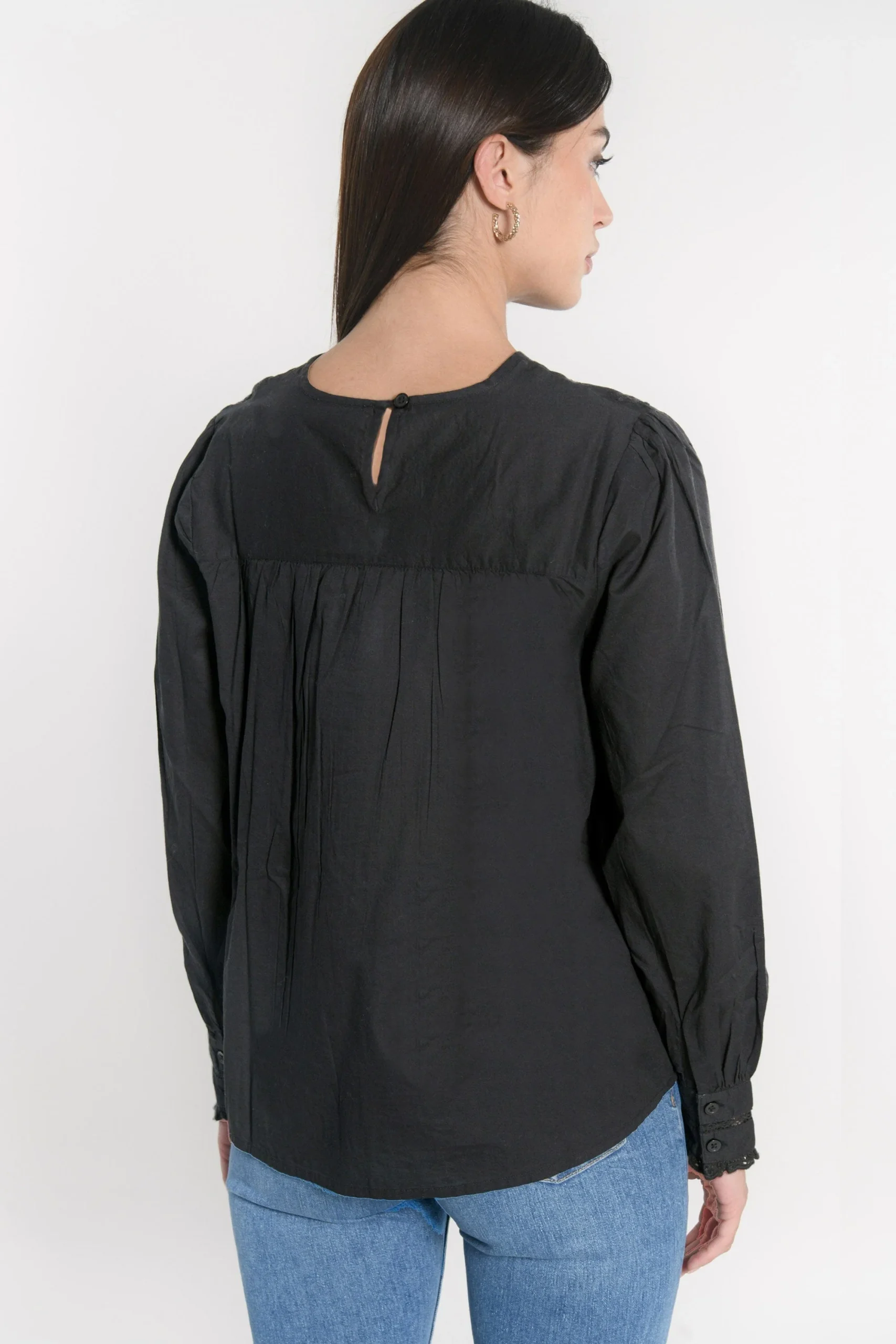 Blouse unie en cotonEncolure ronde avec goutte au dos fermée par un boutonPlastron de dentelle bordé de jour échellePlis sur la poitrineDécoupe dos d’où partent des plis pour un belle ampleurManches longues amples avec poignet fermé par un boutonLongueur 62cm en T0