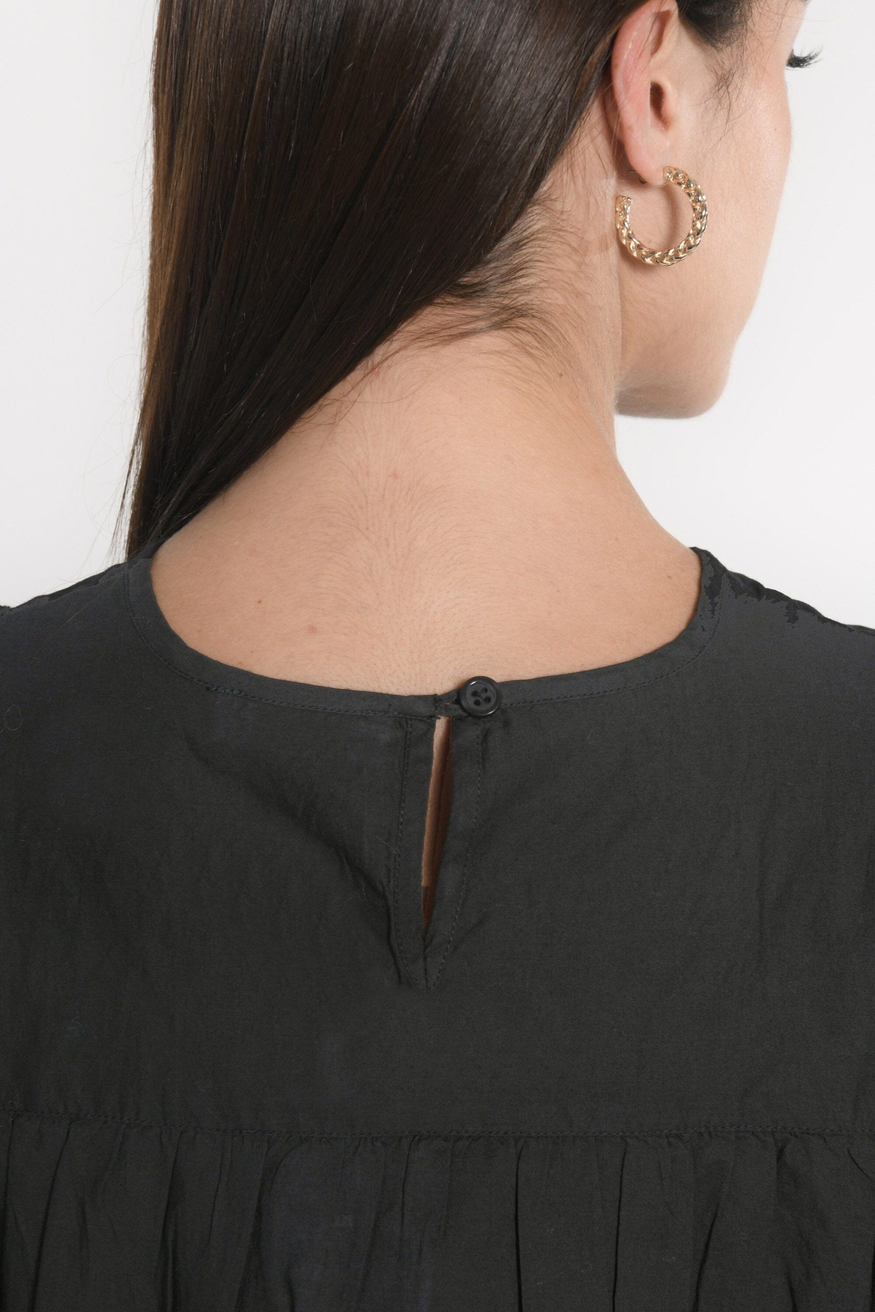 Encolure ronde avec goutte au dos fermée par un bouton