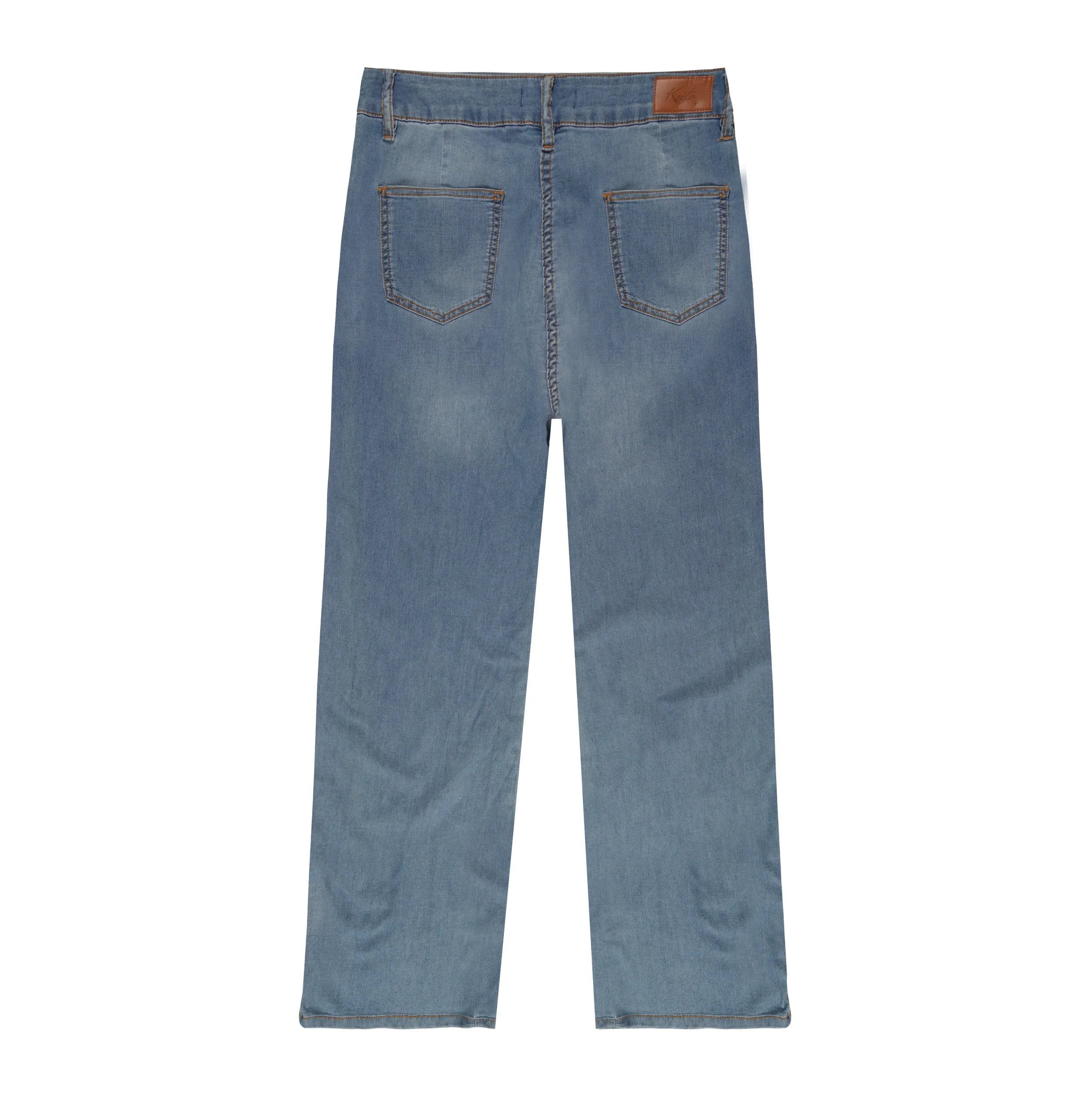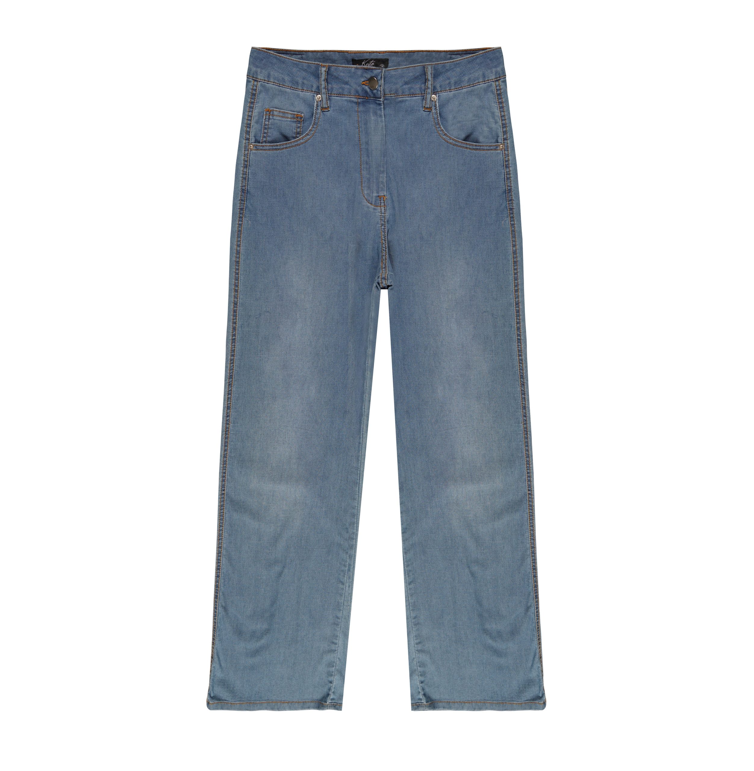 Pantalon jean 5 poches, coupe droite, avec jacron en simili cuir sur la ceinture dos, en tissu léger avec élasthanne, pour votre confort estivale quotidien.