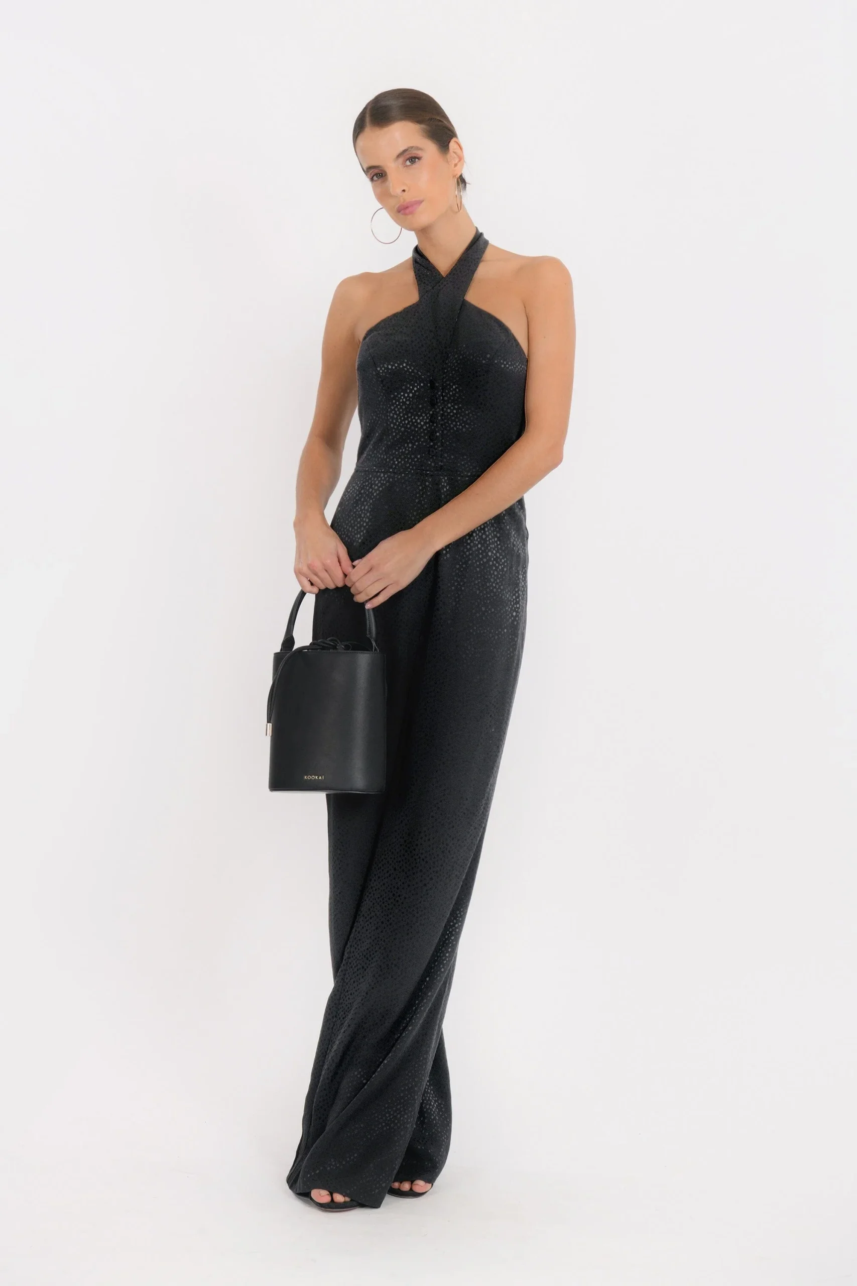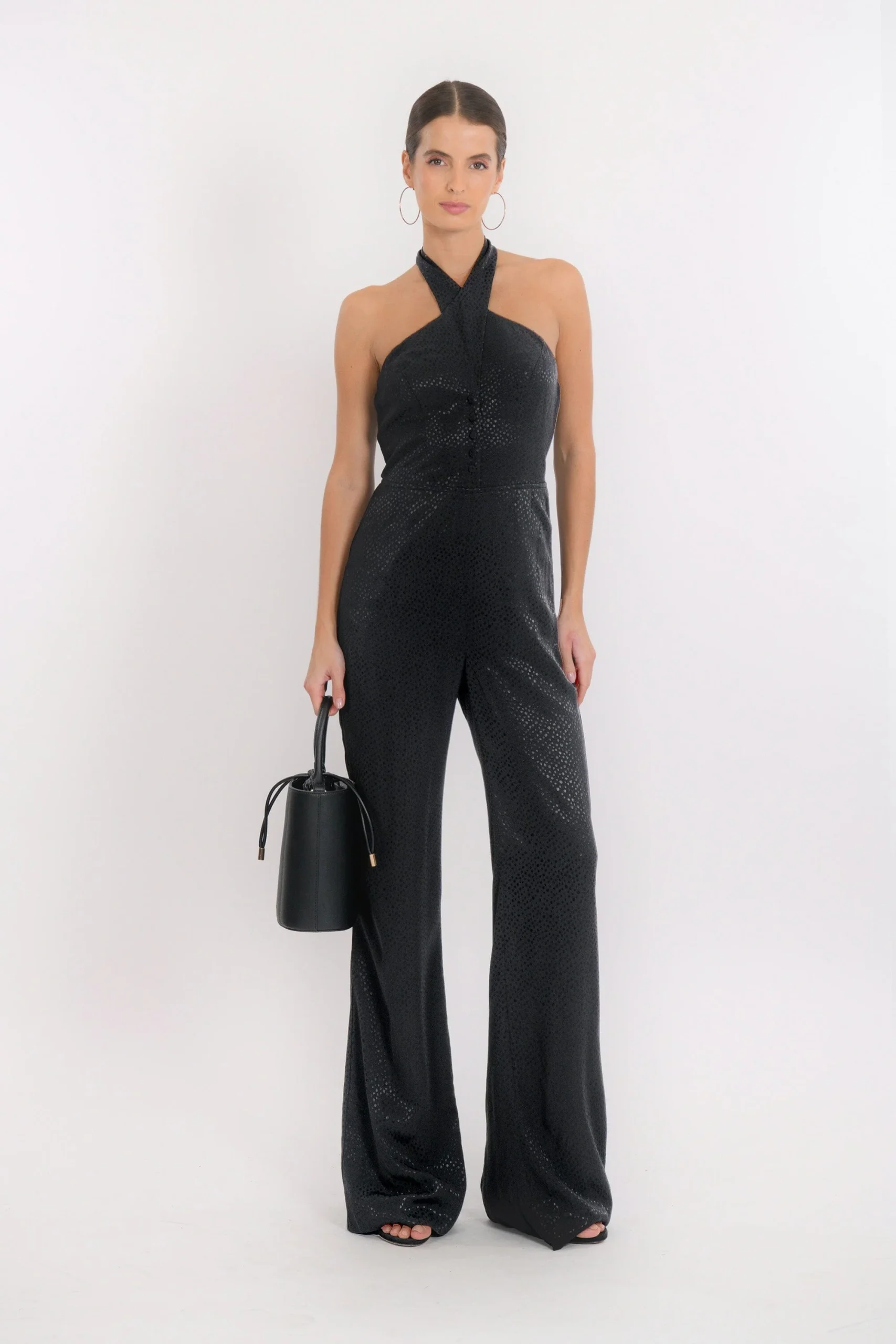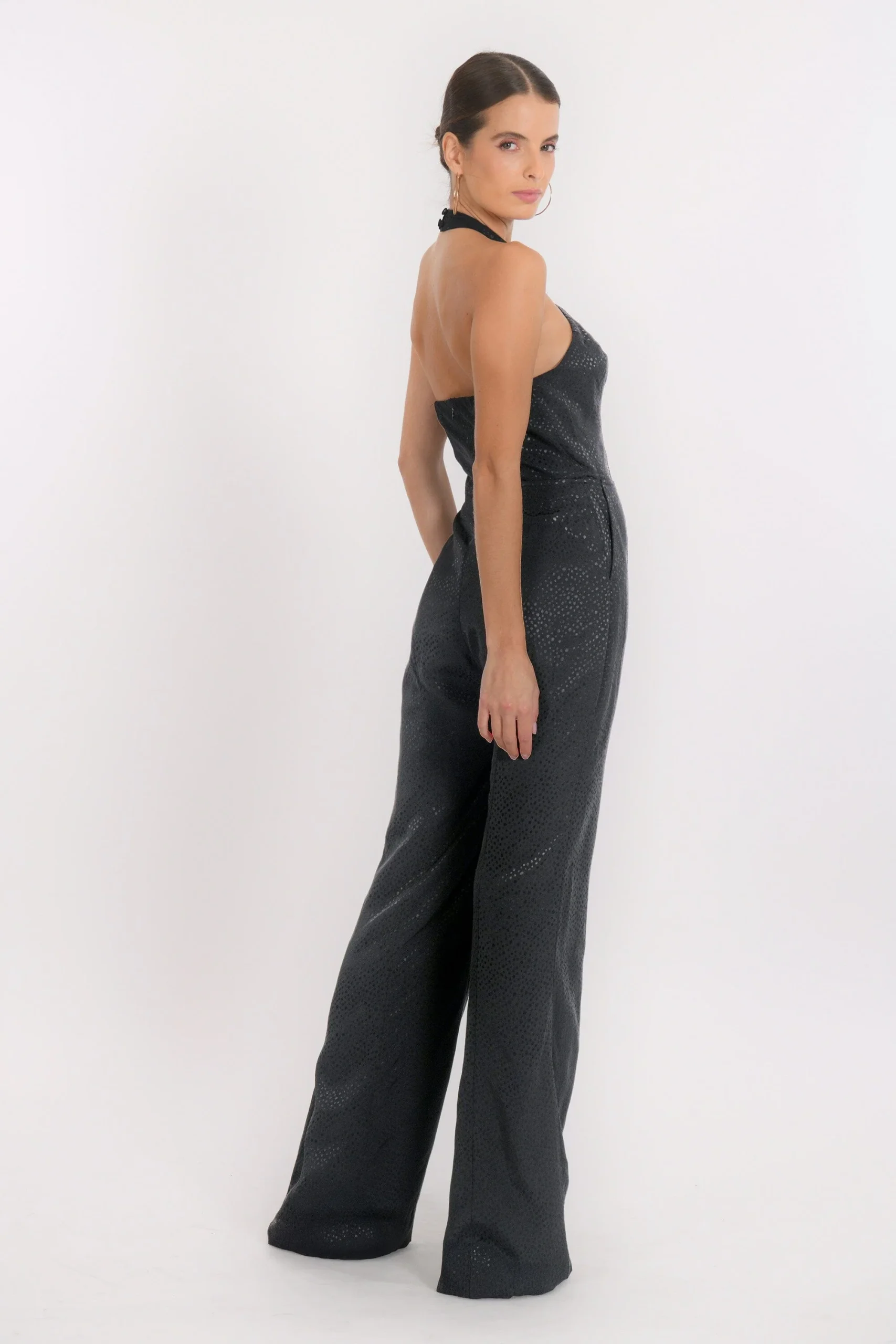 Moderne et sophistiquée, voici la combinaison BakerEn viscose, tissu fluide et douxHaut façon bustier dos-nu, boutonné milieu devant, élastiqué au dosBas pantalon large, deux poches Inès mesure 1m71 et porte une taille 36