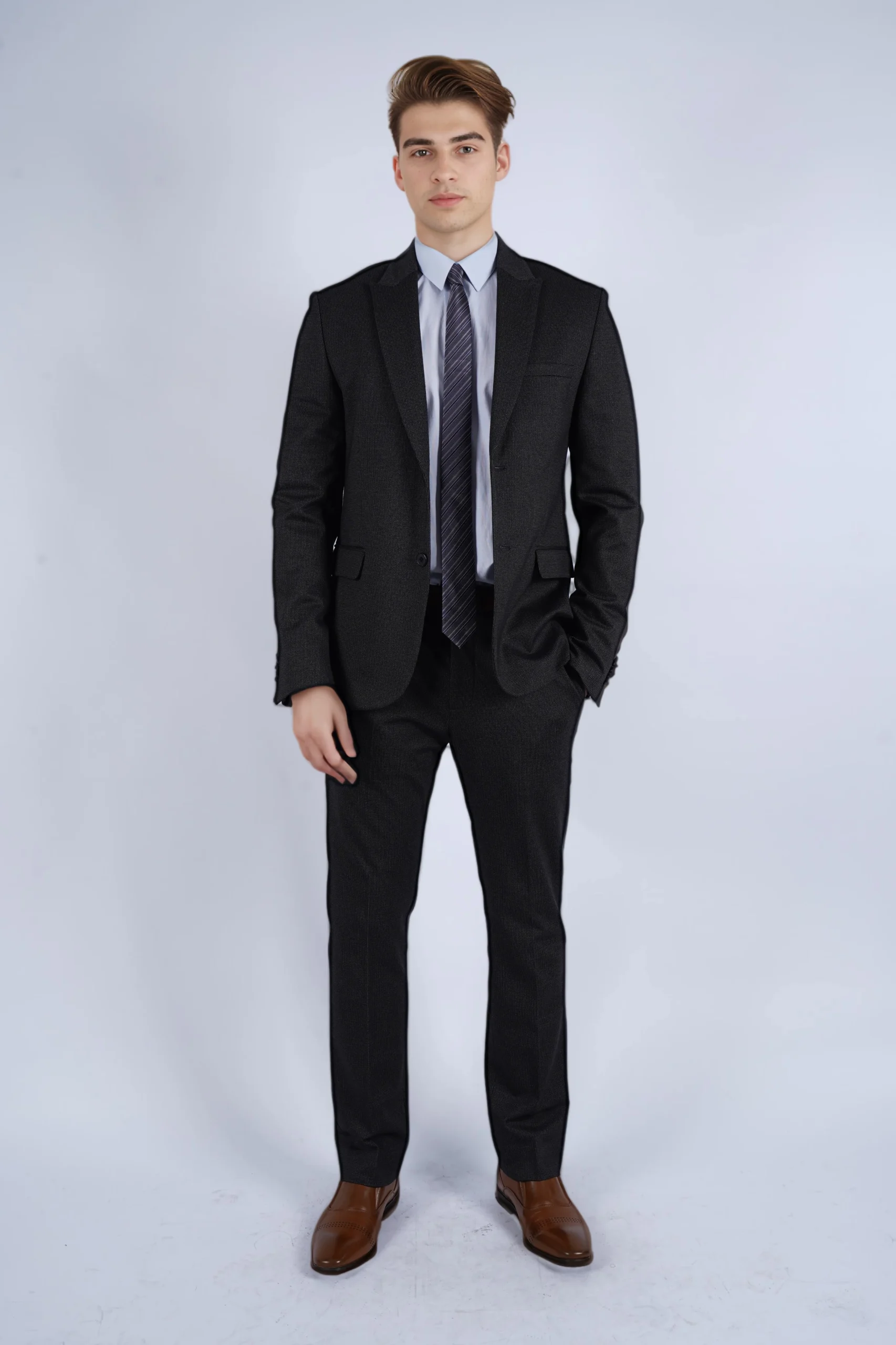 * Costume casual coupe slim, veste a col tailleur pointu, coupe près du corps, a motif carreaux fenêtre discret, pour un look casual chic et moins formel avec deux poches passepoilées à rabat sur le devant, une poche coté cœur barchetta, deux boutons de fermeture droite, 4 Boutons en bas de manches et des fentes d’aisance au dos