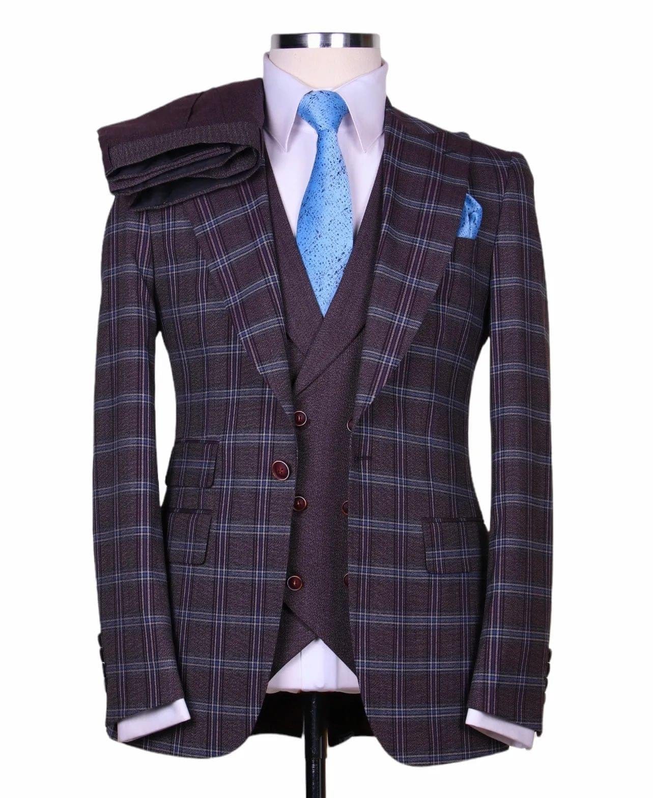 Costume 3 Pièces à Carreaux Bordeaux et Vert