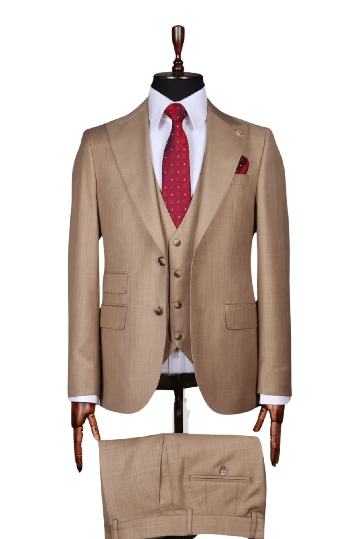 Arrêtez de chercher le bon costume. Ça y est. Avec un costume 3 pièces beige V.I.P, vous serez bien habillé en toute occasion et surtout, vous vous sentirez bien. Fabriqué avec les meilleurs matériaux et une confection de qualité, notre costume 3 pièces fera passer votre style au niveau supérieur.