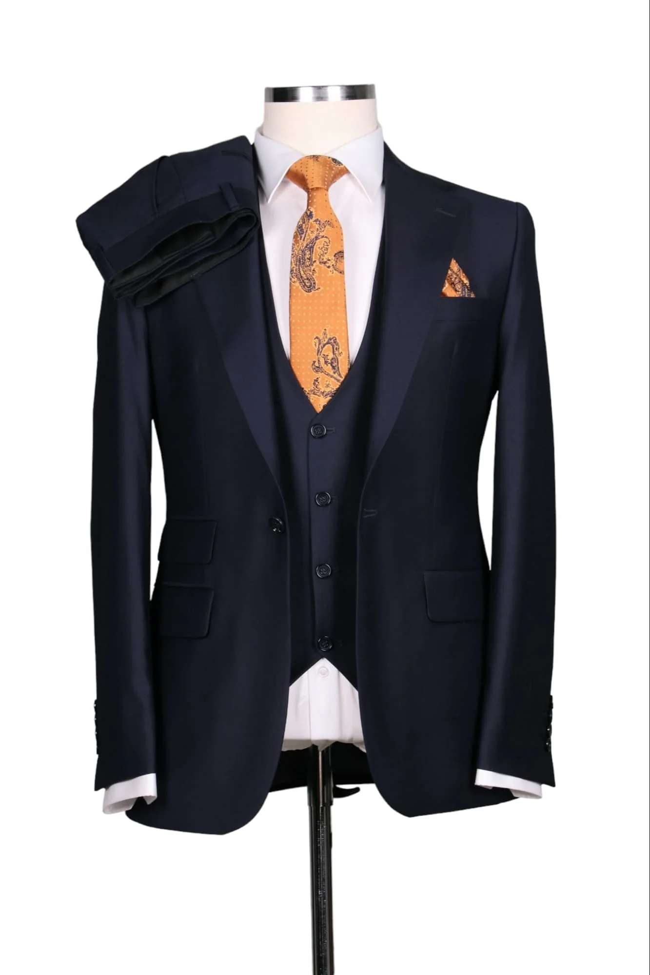 L’élégant costume 3 pièces bleu foncé est un choix sûr pour votre prochaine réunion. La couleur bleu nuit est non seulement élégante, mais également parfaite pour de nombreux types d’industries. Le costume trois pièces comprend une veste impeccablement taillée avec un bouton pour la fermeture, un gilet assorti et un pantalon.