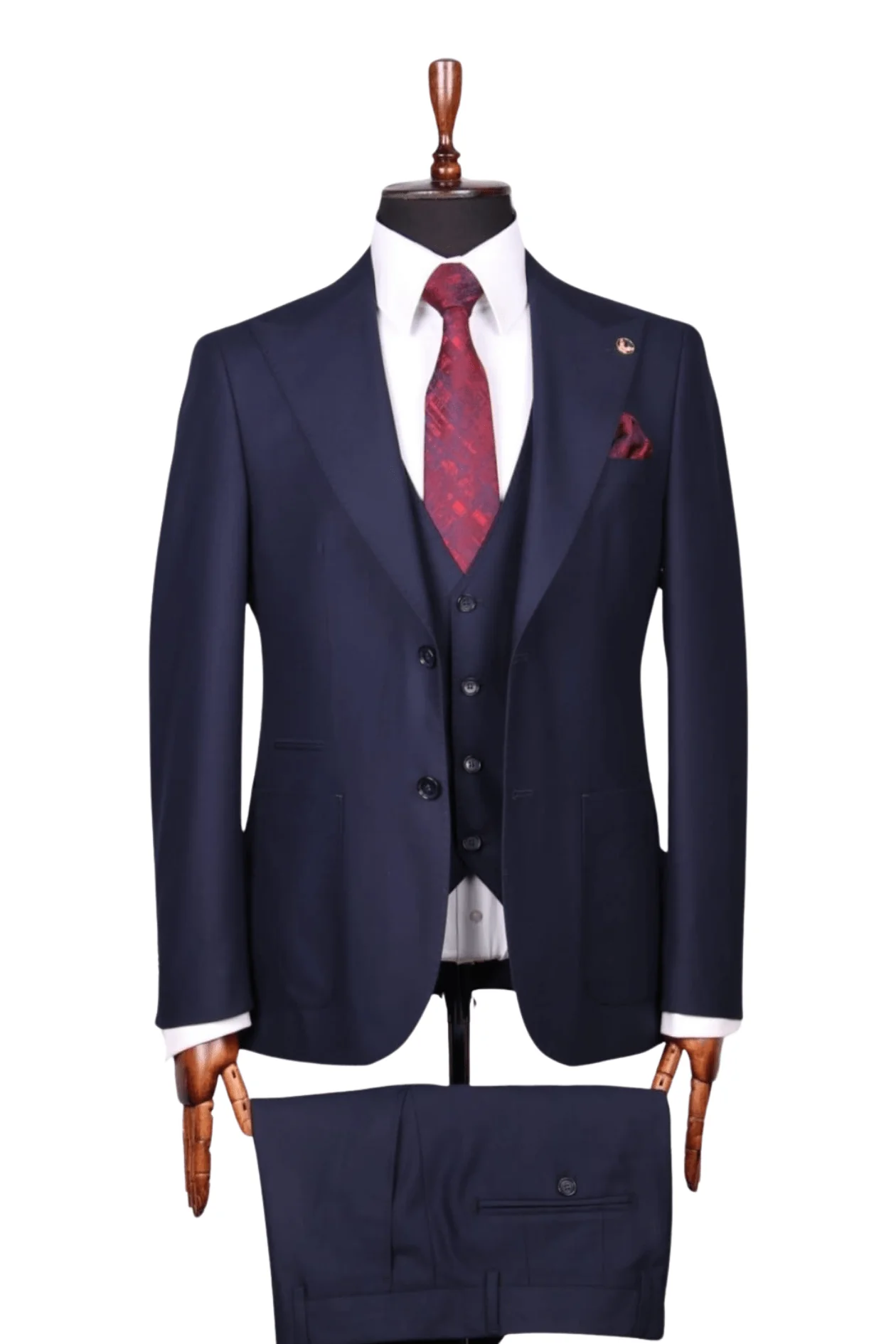 Ce costume est idéal pour les mariages, les réunions d’affaires et les événements formels où une touche d’originalité est appréciée. La combinaison de la couleur bleu de nuit avec les accessoires rouge et violet crée une harmonie visuelle unique et captivante.