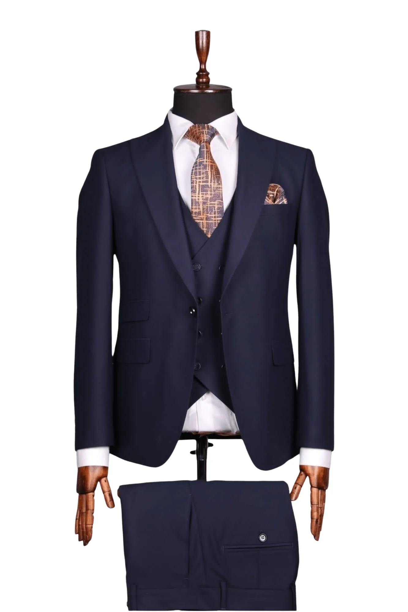 L’élégant costume 3 pièces bleu foncé est un choix sûr pour votre prochaine réunion. La couleur bleu nuit est non seulement élégante, mais également parfaite pour de nombreux types d’industries. Le costume trois pièces comprend une veste impeccablement taillée avec un bouton pour la fermeture, un gilet assorti et un pantalon.