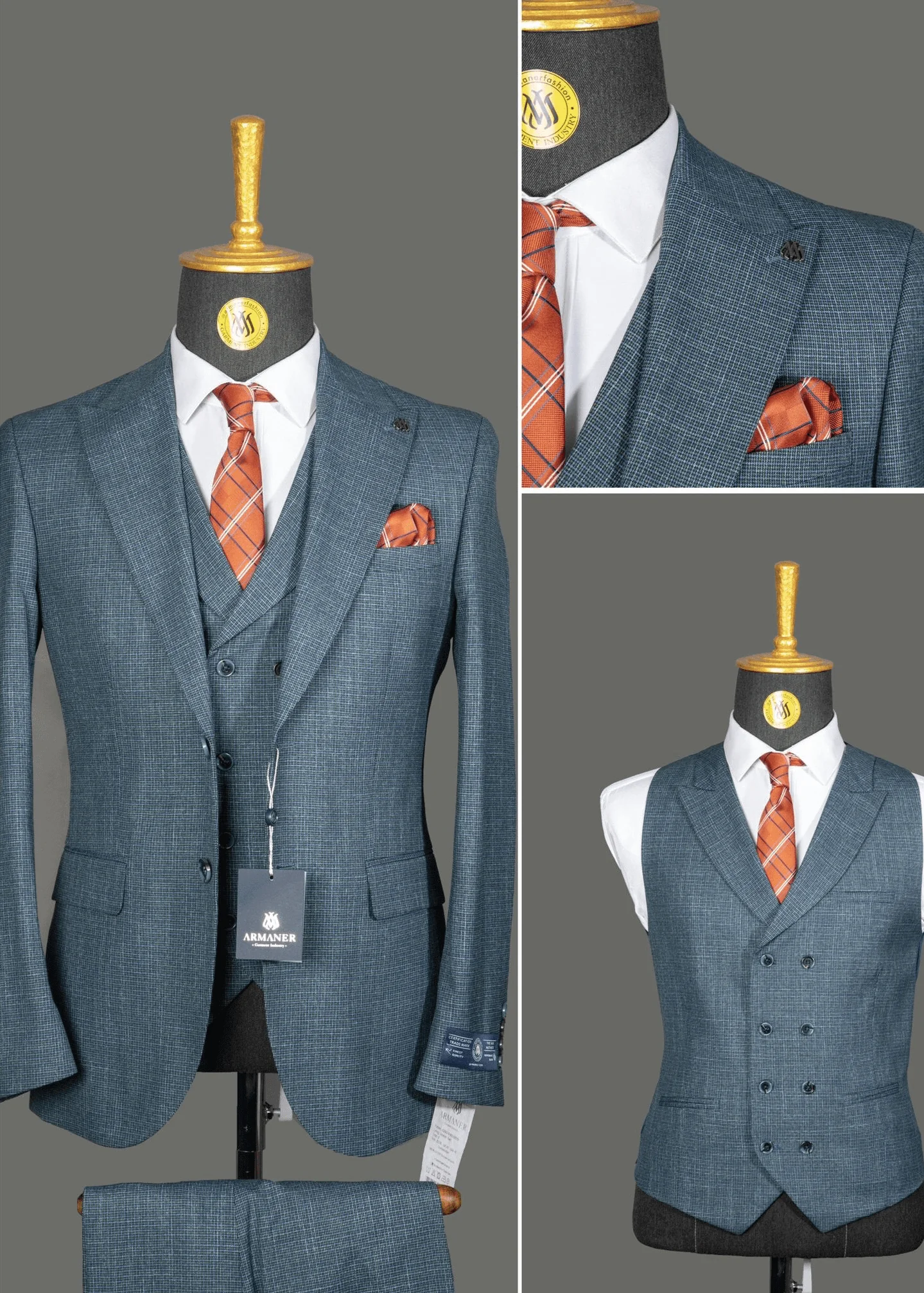 Costume 3 Pièces à Carreaux Gris et Bleu 3
