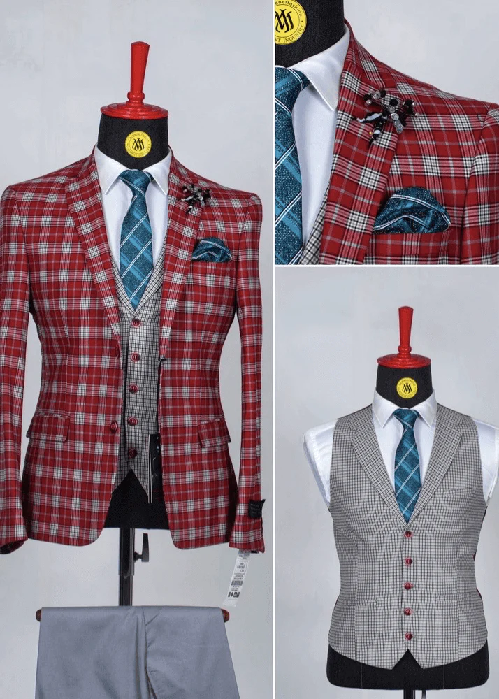 Costume 3 Pièces à Carreaux Bordeaux et Vert
