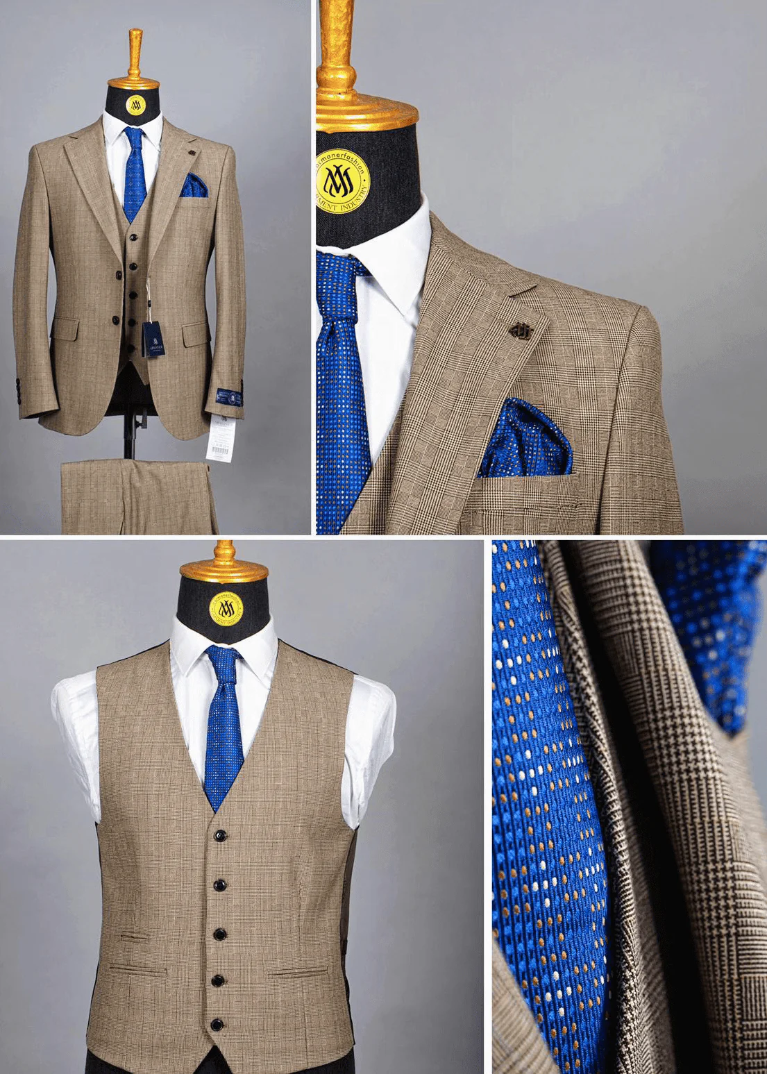 Costume 3 Pièces à Carreaux Beige et Marron