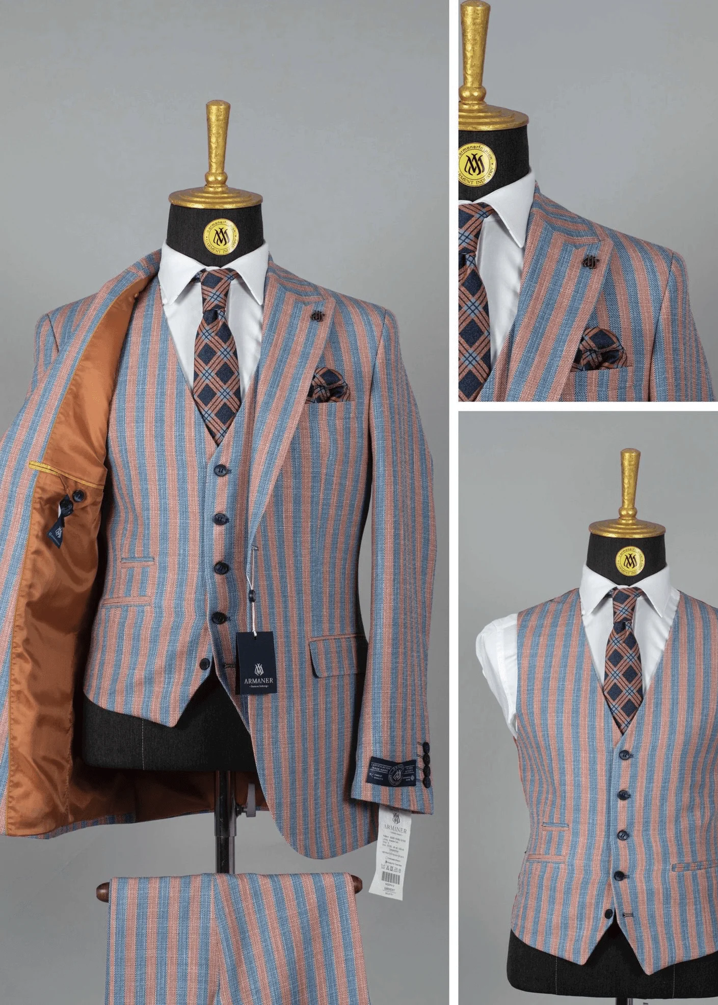 Il n’y a rien de plus élégant qu’un costume bien taillé. Notre élégant vêtement en laine présente une élégante coupe slim à double fente dans le dos et deux poches à l’intérieur. Notre costume 3 pièces à motif rayé orange et bleu se démarque encore plus que les autres costumes noirs unis.