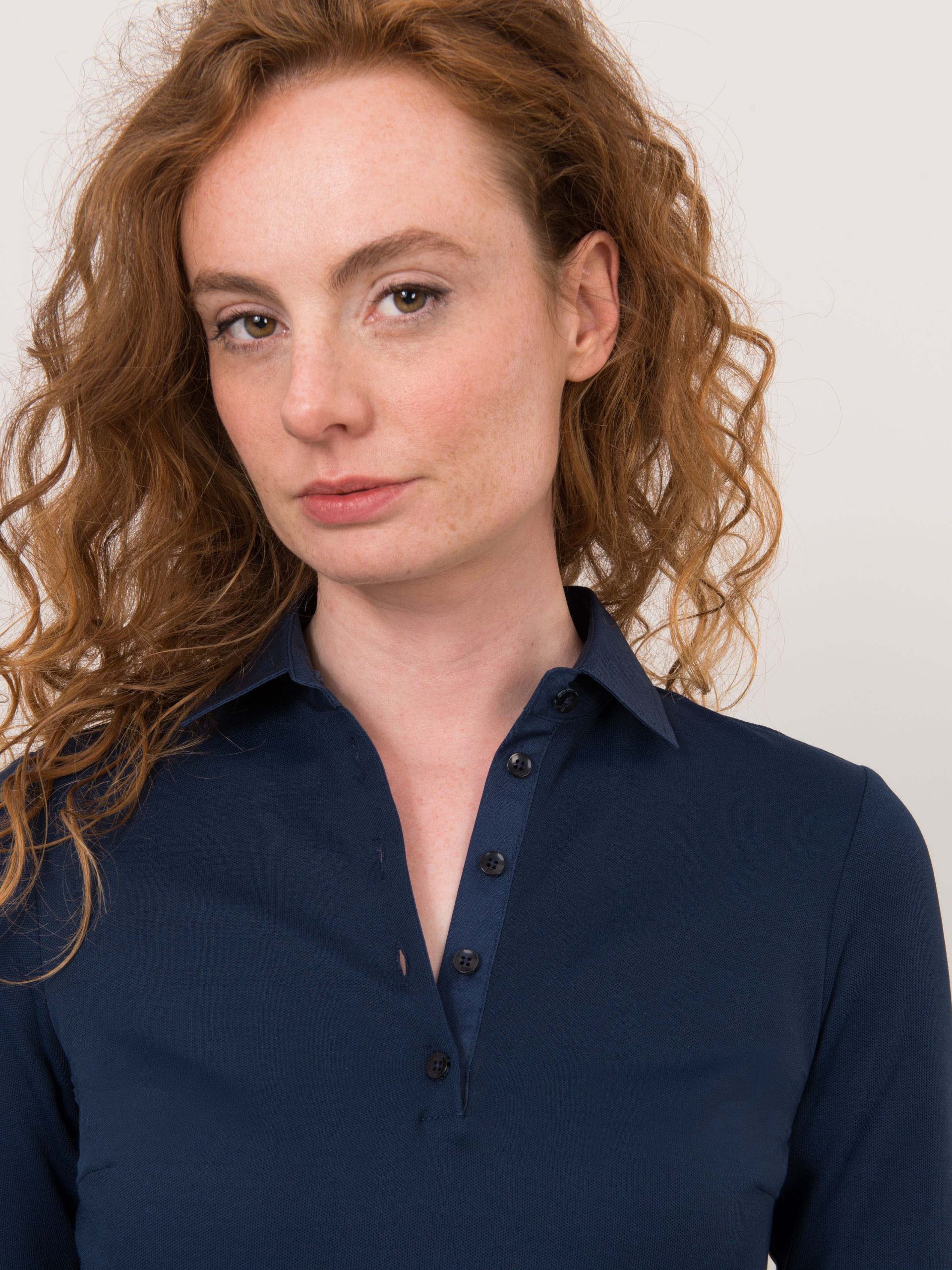 Longsleeve Polo Elena is a modern interpretation of the classic polo shirt, especially created for waitresses. By using woven fabric for the cuffs and collar, this shirt is both sporty and classic at the same time. The high quality polo-piqué fabric is made from Bio-cotton and recycled PET bottles.
