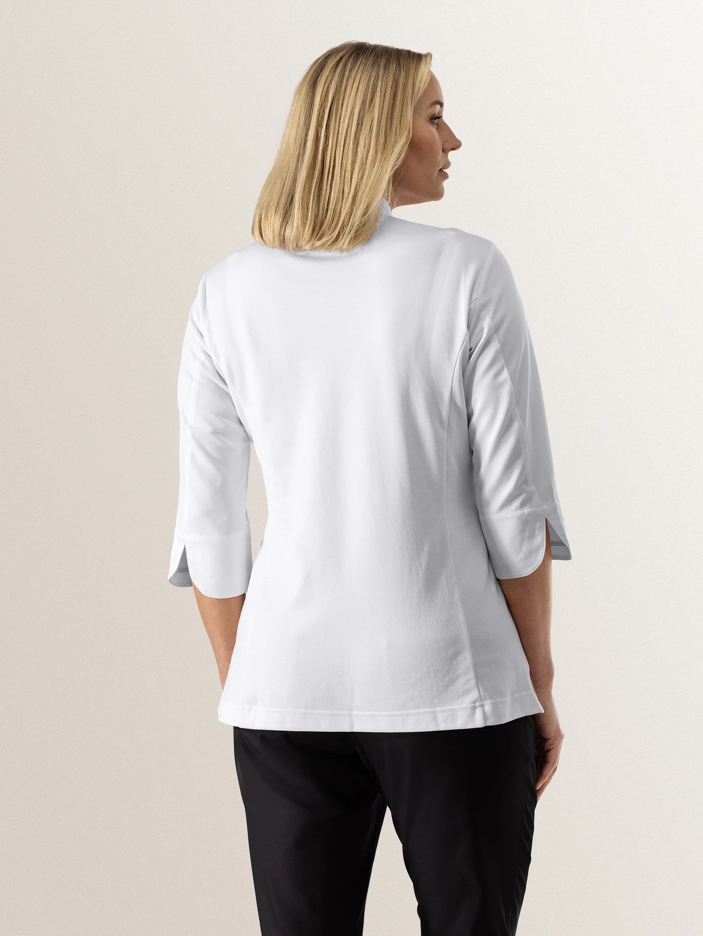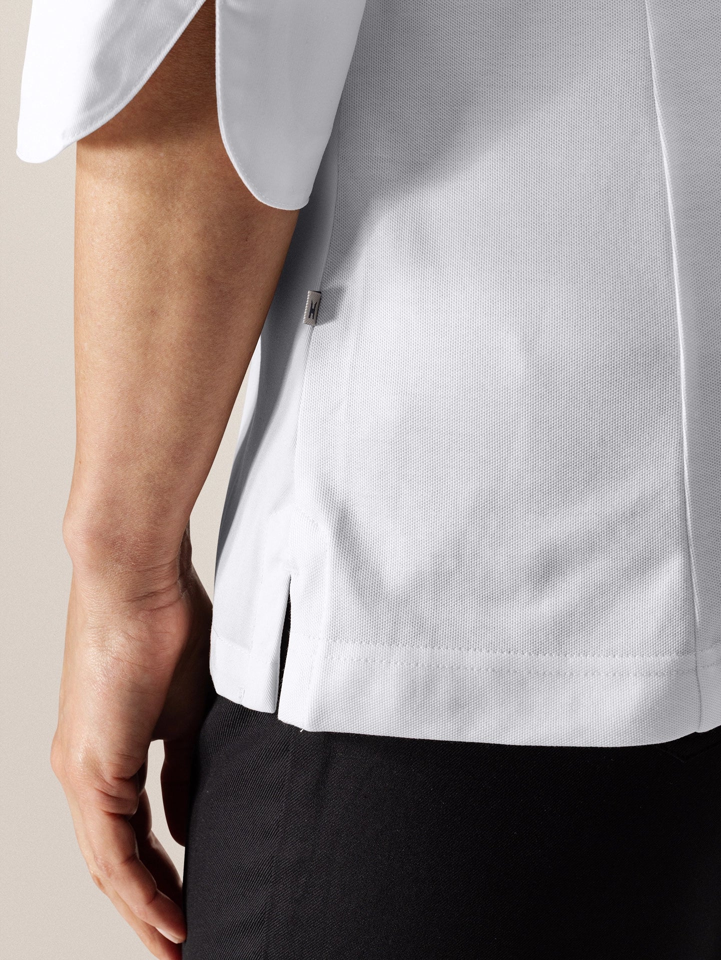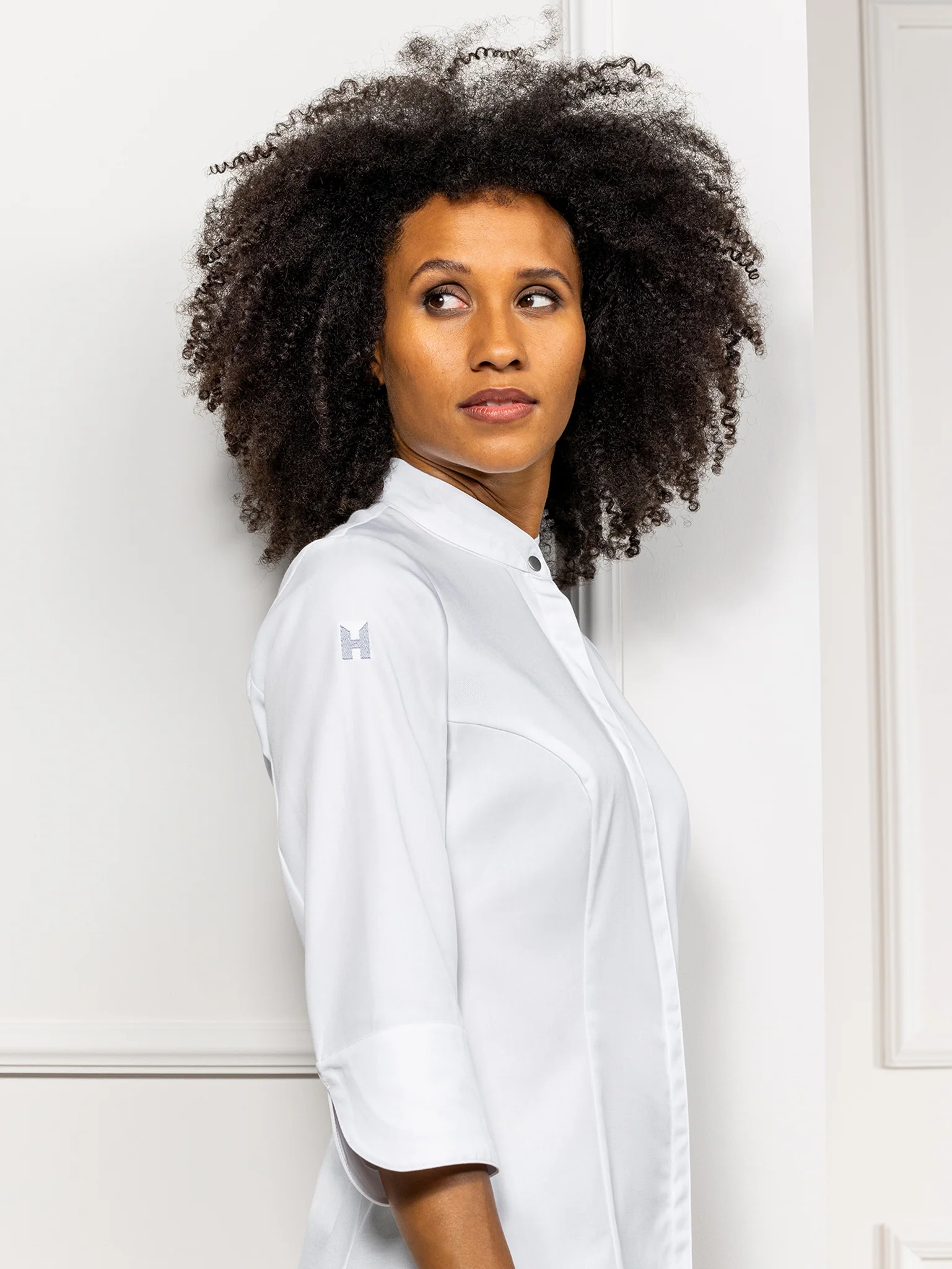 Made from Tencel fabric, this knitted chef jacket for females has optimal moisture regulation. With the 3/4 sleeves and stretch fabric on the back of the white jacket, chefs are able to work with optimal freedom of movement.
