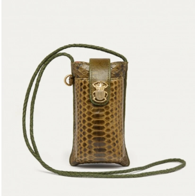 Cet étui en python et cuir suédé conçue afin de transporter votre téléphone est réalisée à la main. Le double Marcus est doté de deux compartiments. La poche principale vous permettra d’accueillir votre smartphone et la poche avant vos lunettes. Ces deux poches se ferment à l’aide d’un rabat aimanté, orné d’un scarabée doré. À l’arrière, 3 fentes vous permettront d’y ranger vos différentes cartes.