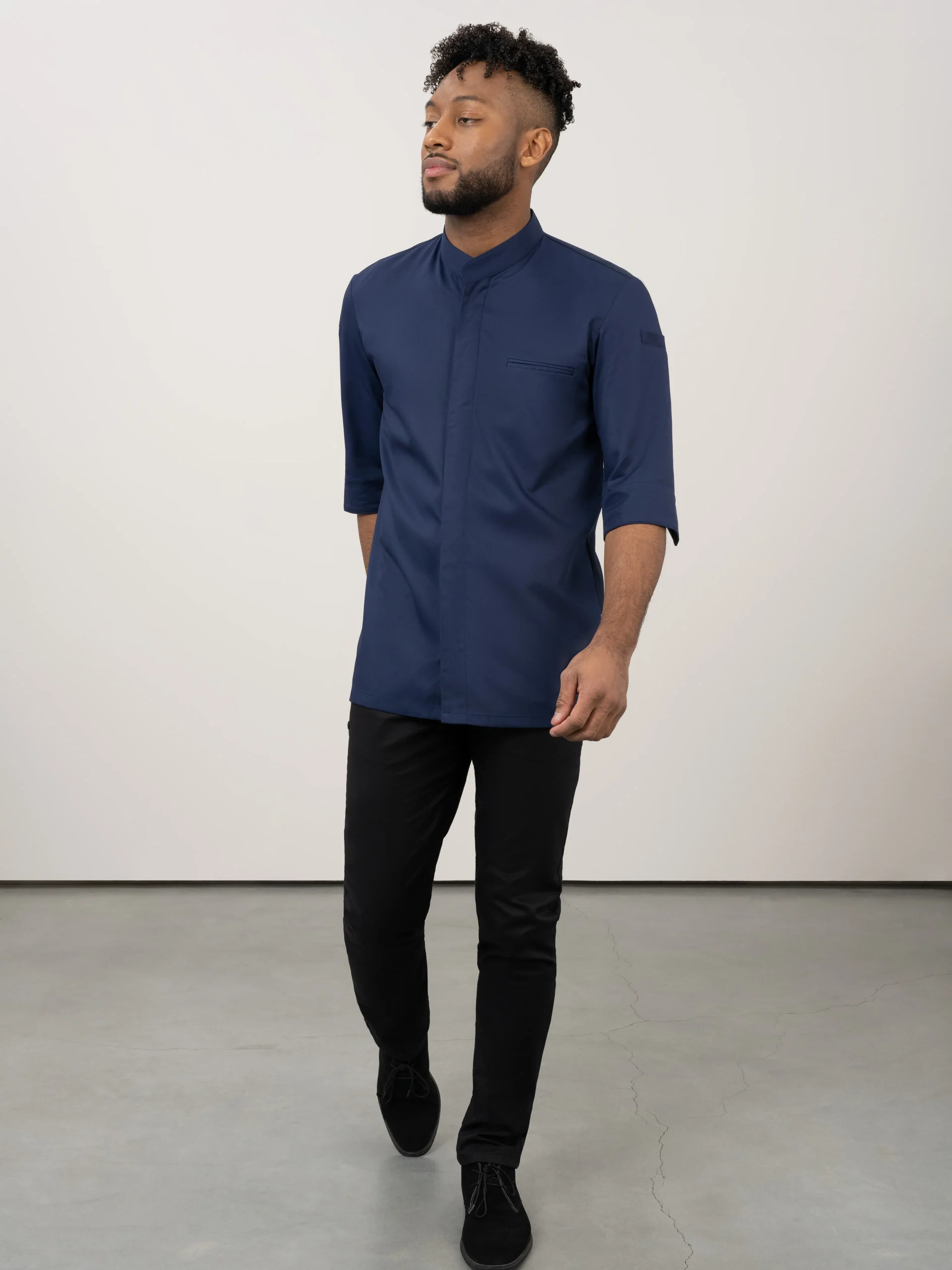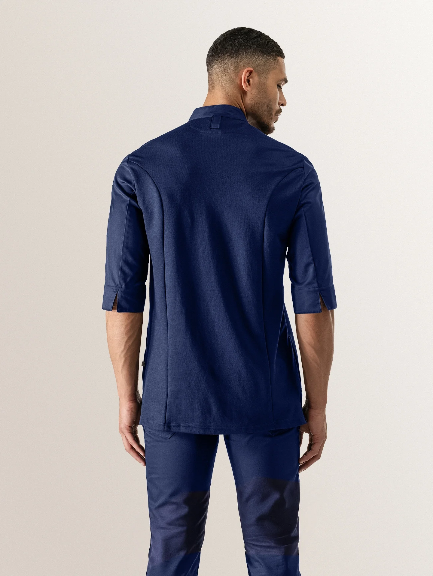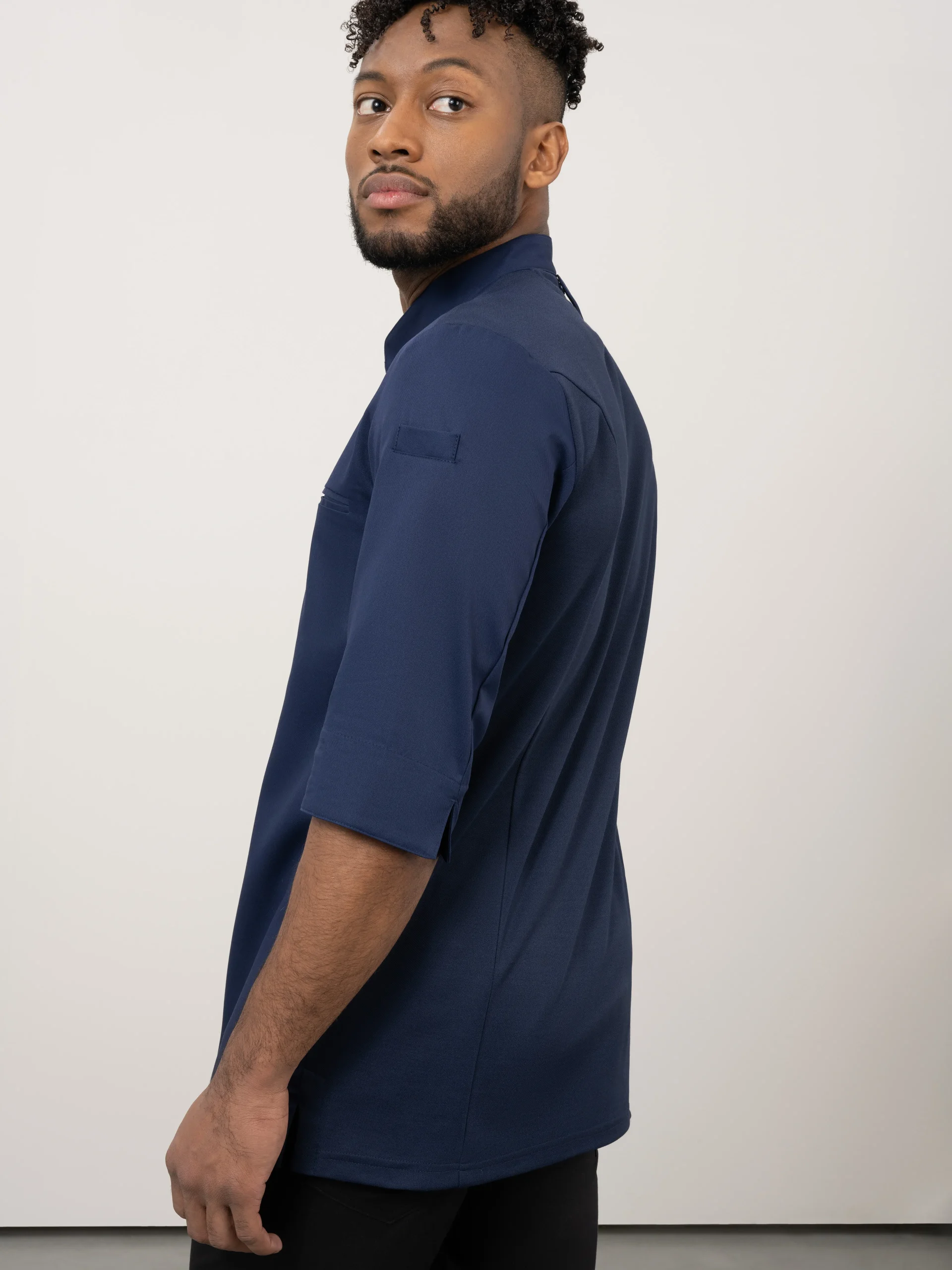 A luxurious blue chef jacket with a slim cut, made from very soft fabric. With its 3/4 sleeves it’s a very cool chef jacket, perfect to wear in hot environments. The unique stretch fabric on the back of the chef jacket is elastic in all directions.