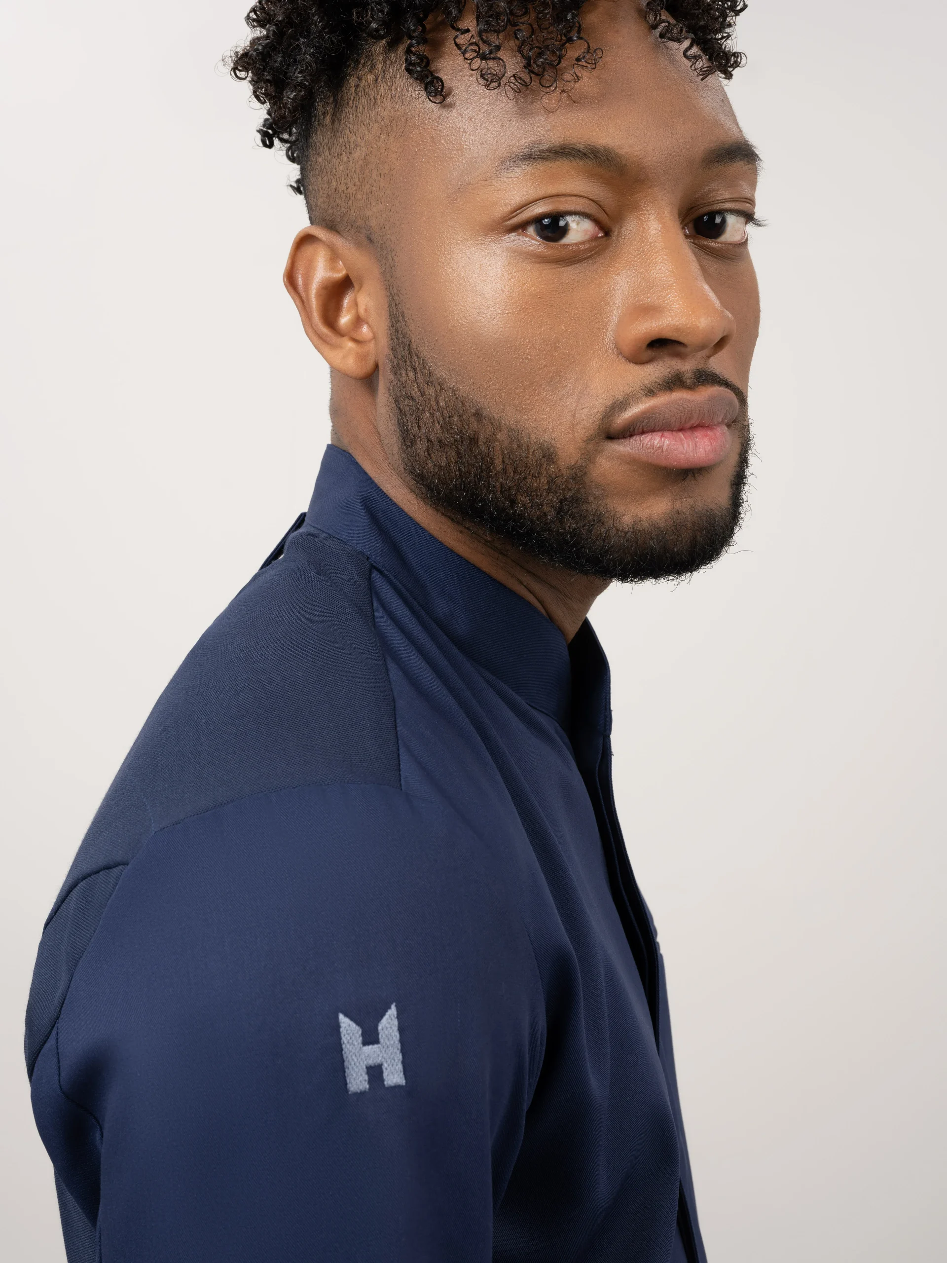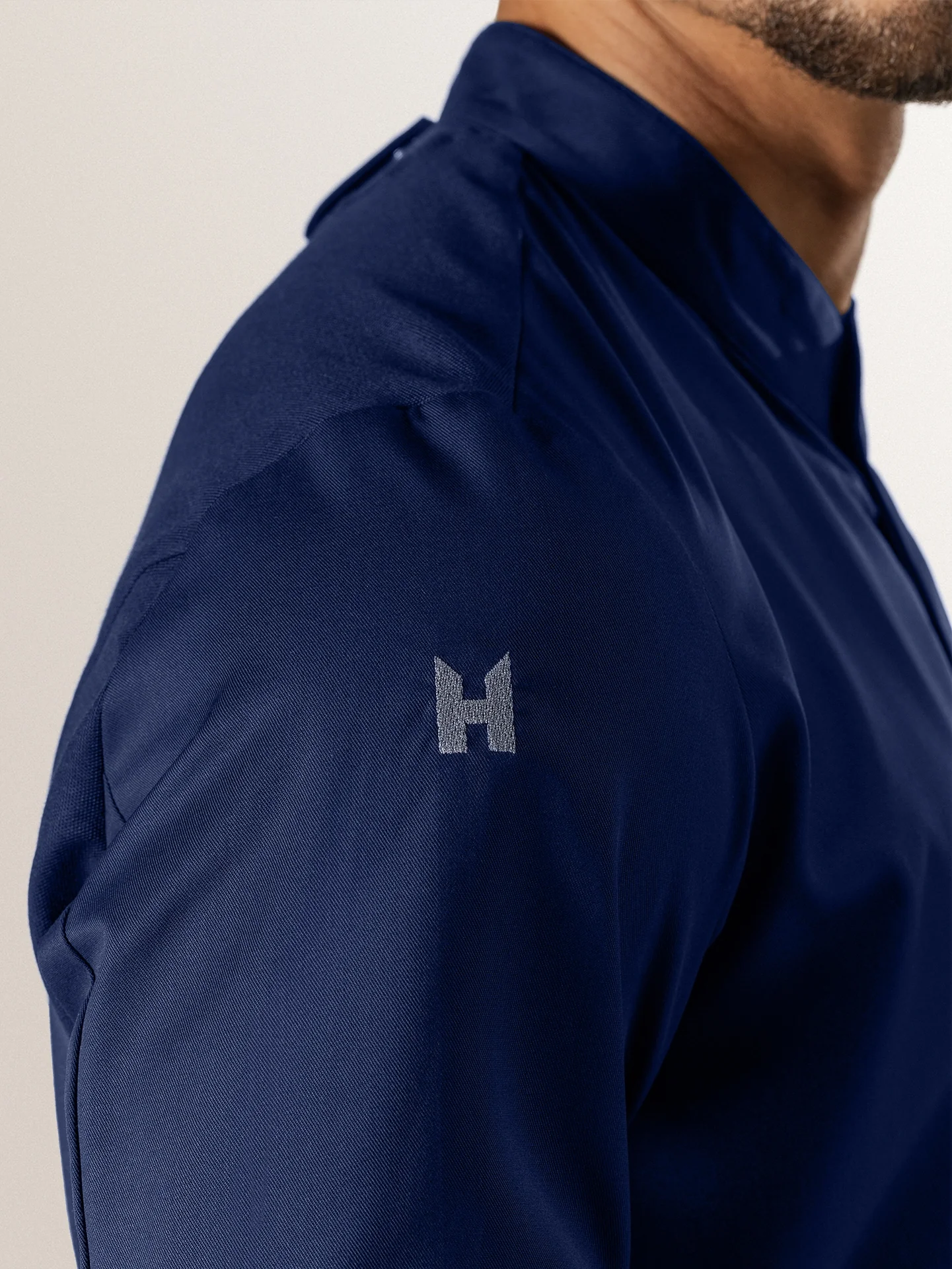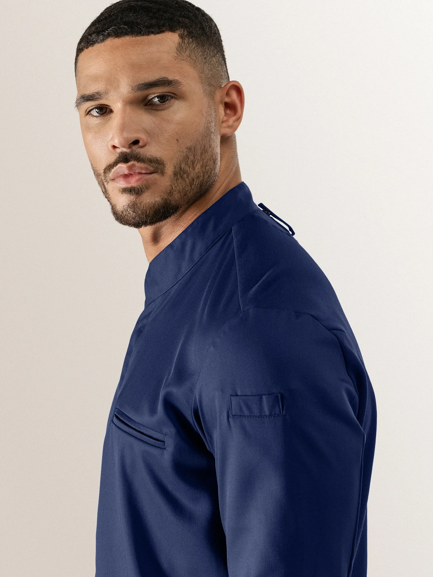 A luxurious blue chef jacket with a slim cut, made from very soft fabric. With its 3/4 sleeves it’s a very cool chef jacket, perfect to wear in hot environments. The unique stretch fabric on the back of the chef jacket is elastic in all directions.