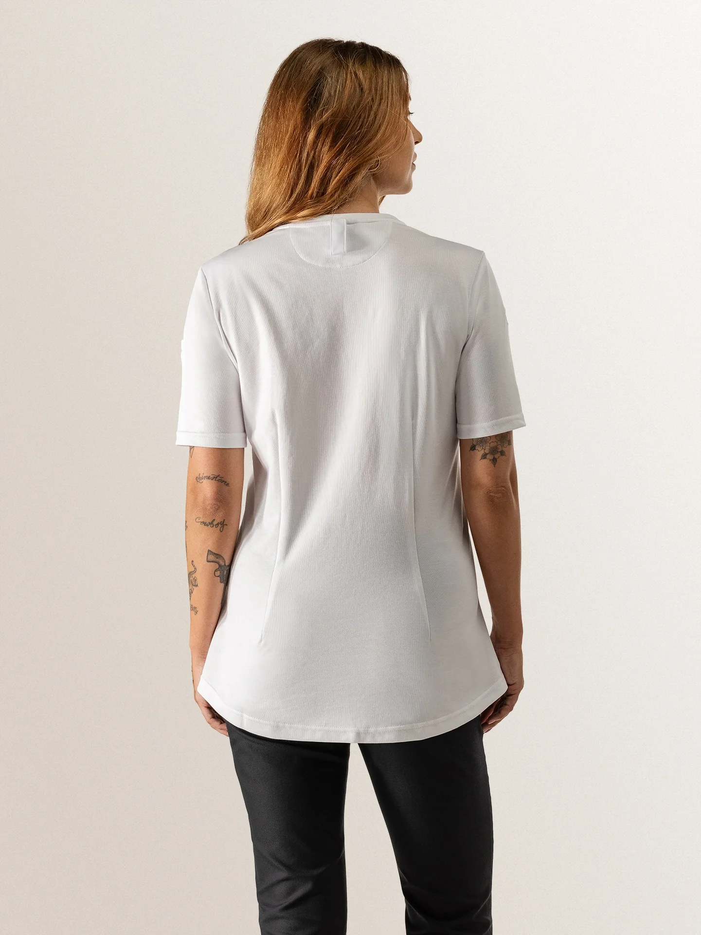 A short sleeve slim fit white t-shirt with excellent moisture regulation, made to suit females in both kitchen and service. It has stretch fabric on the back for optimal freedom of movement.