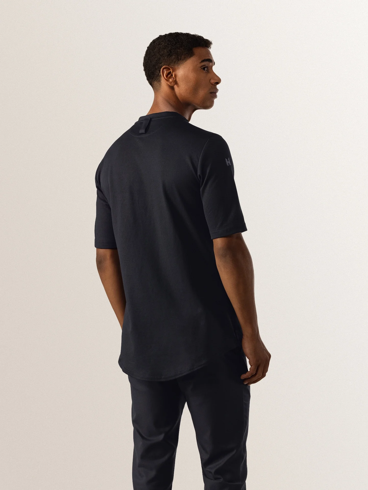 A short sleeve slim fit black t-shirt with excellent moisture regulation, made to suit men in both kitchen and service. It features stretch fabric on the back for optimal freedom of movement.