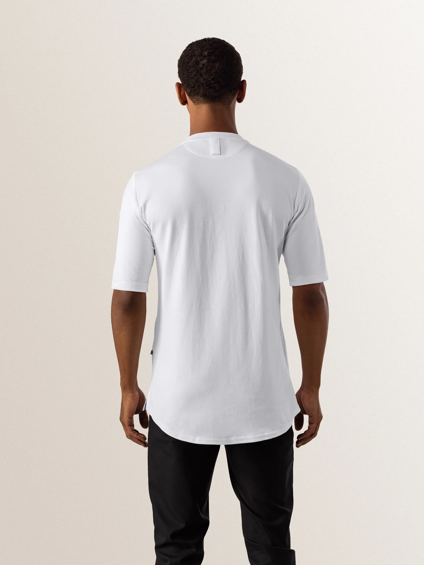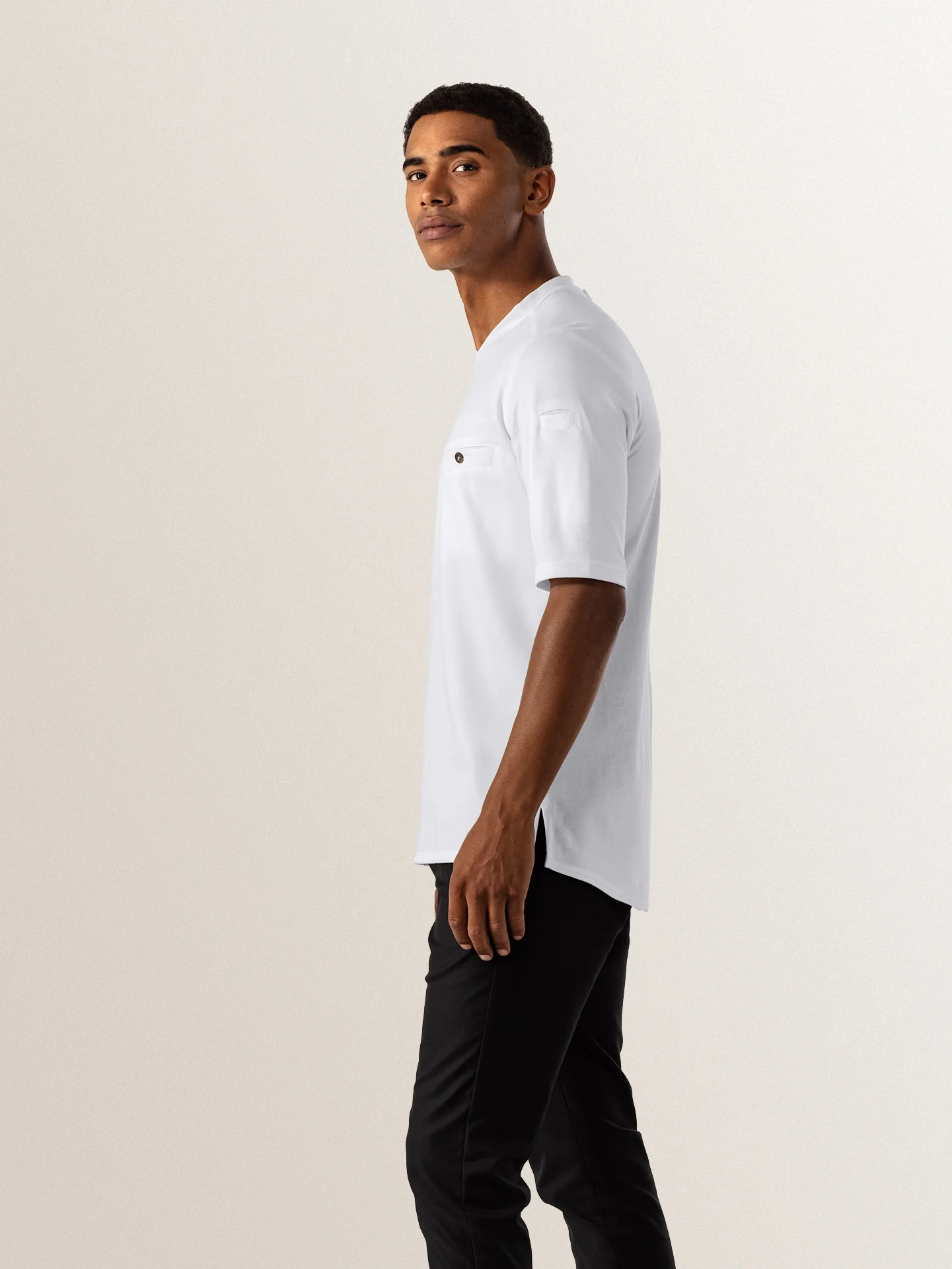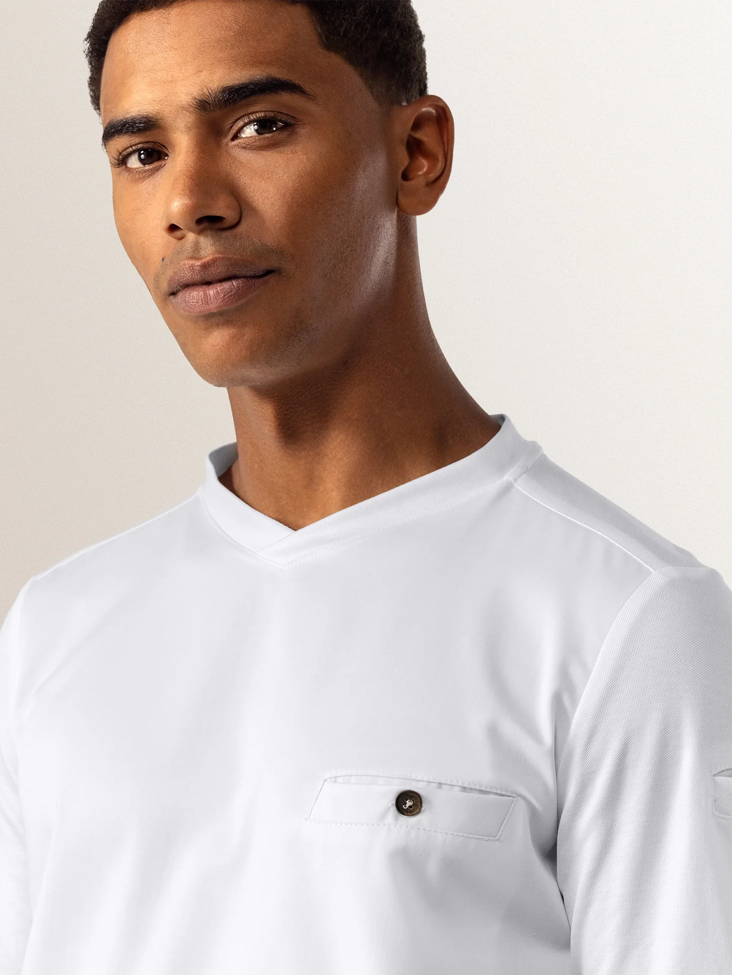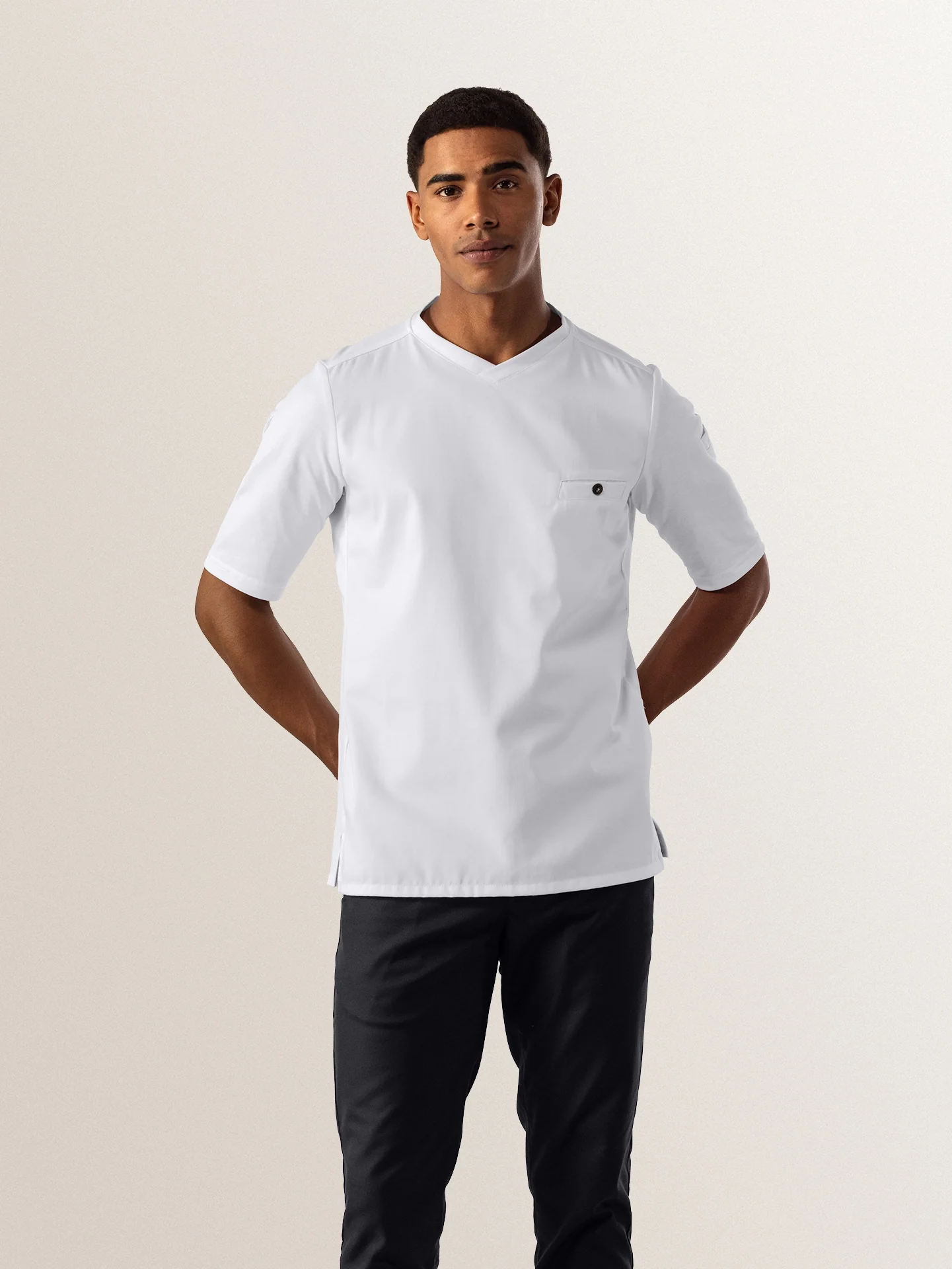 A short sleeve slim fit white t-shirt with excellent moisture regulation, made to suit men in both kitchen and service. It features stretch fabric on the back for optimal freedom of movement.