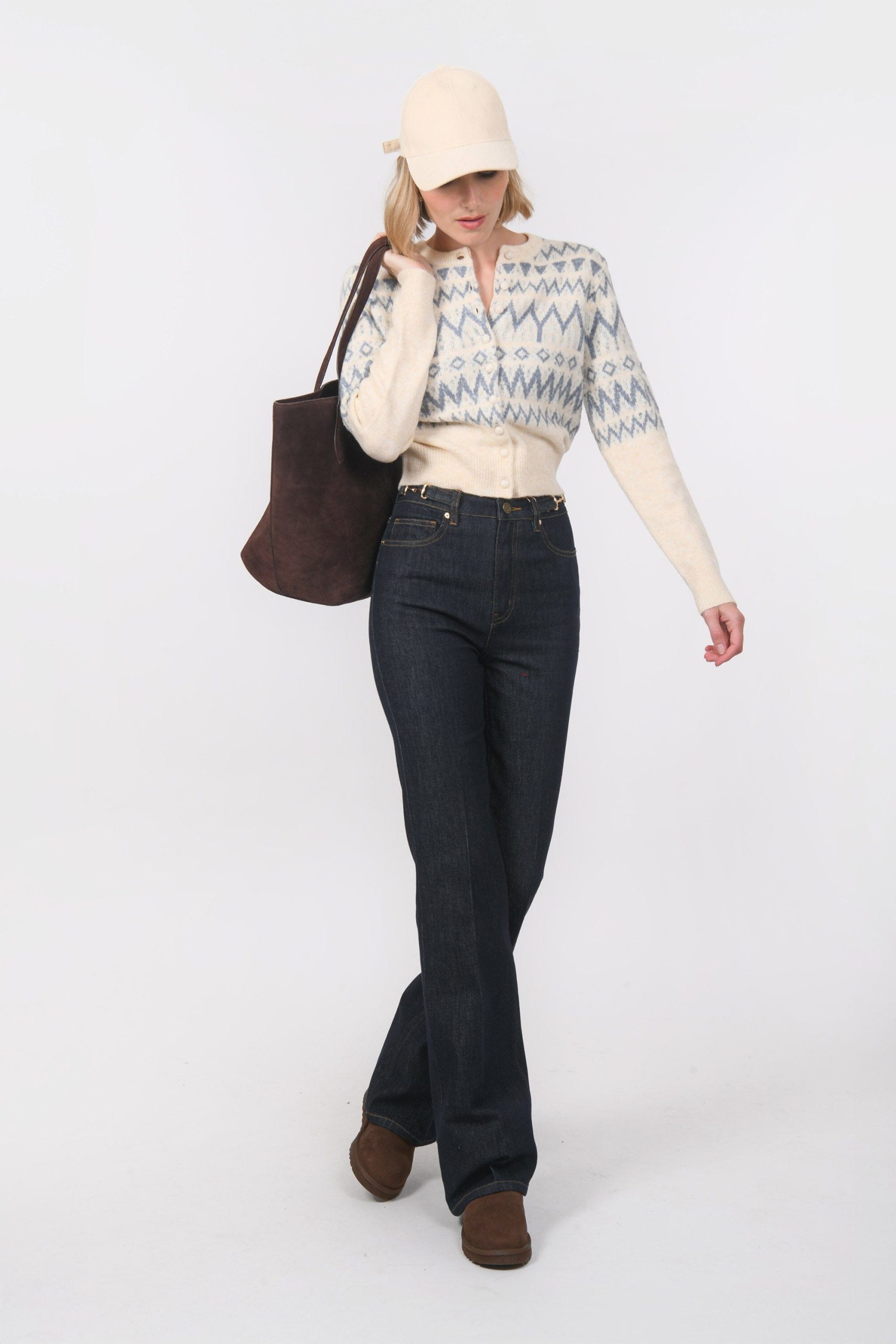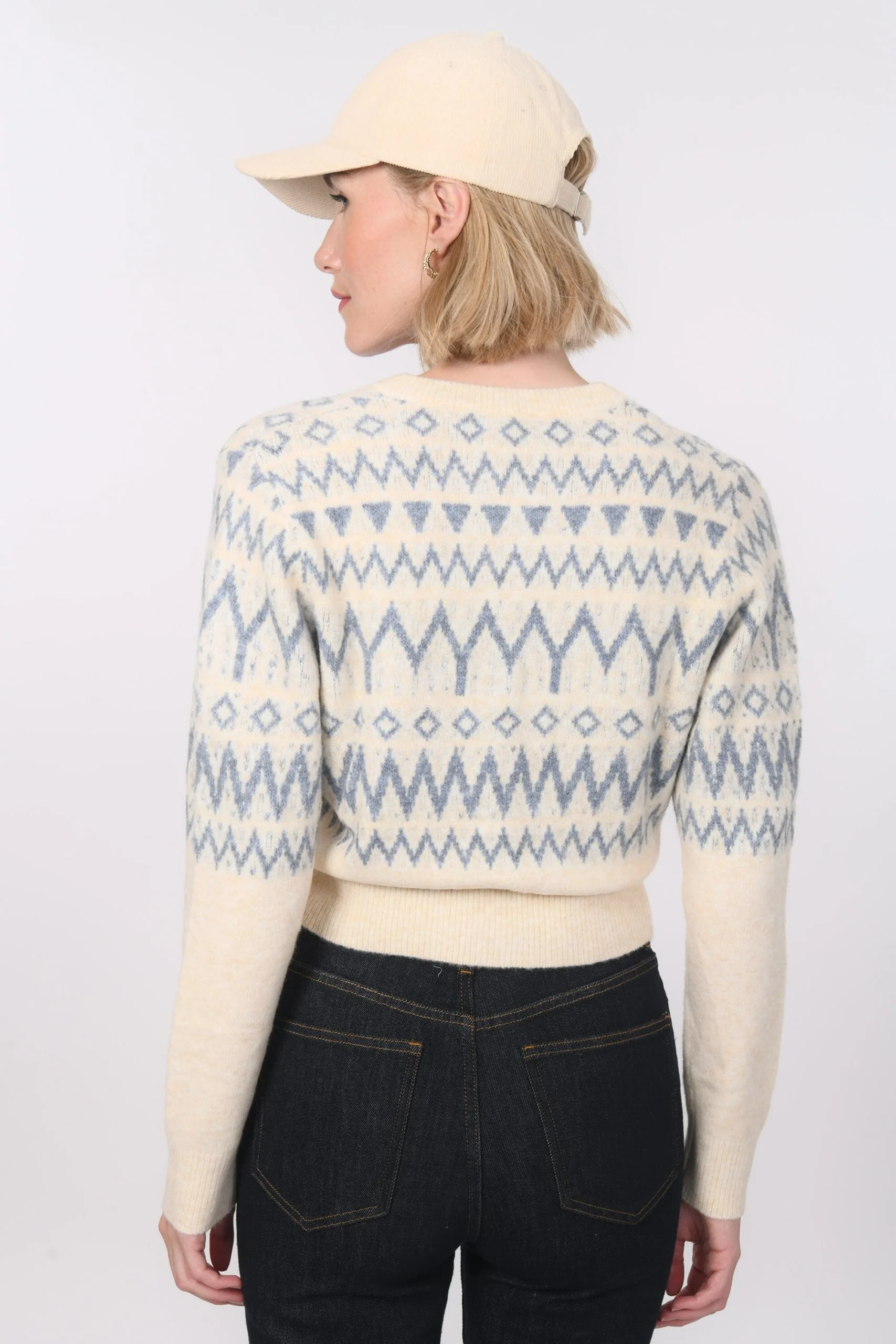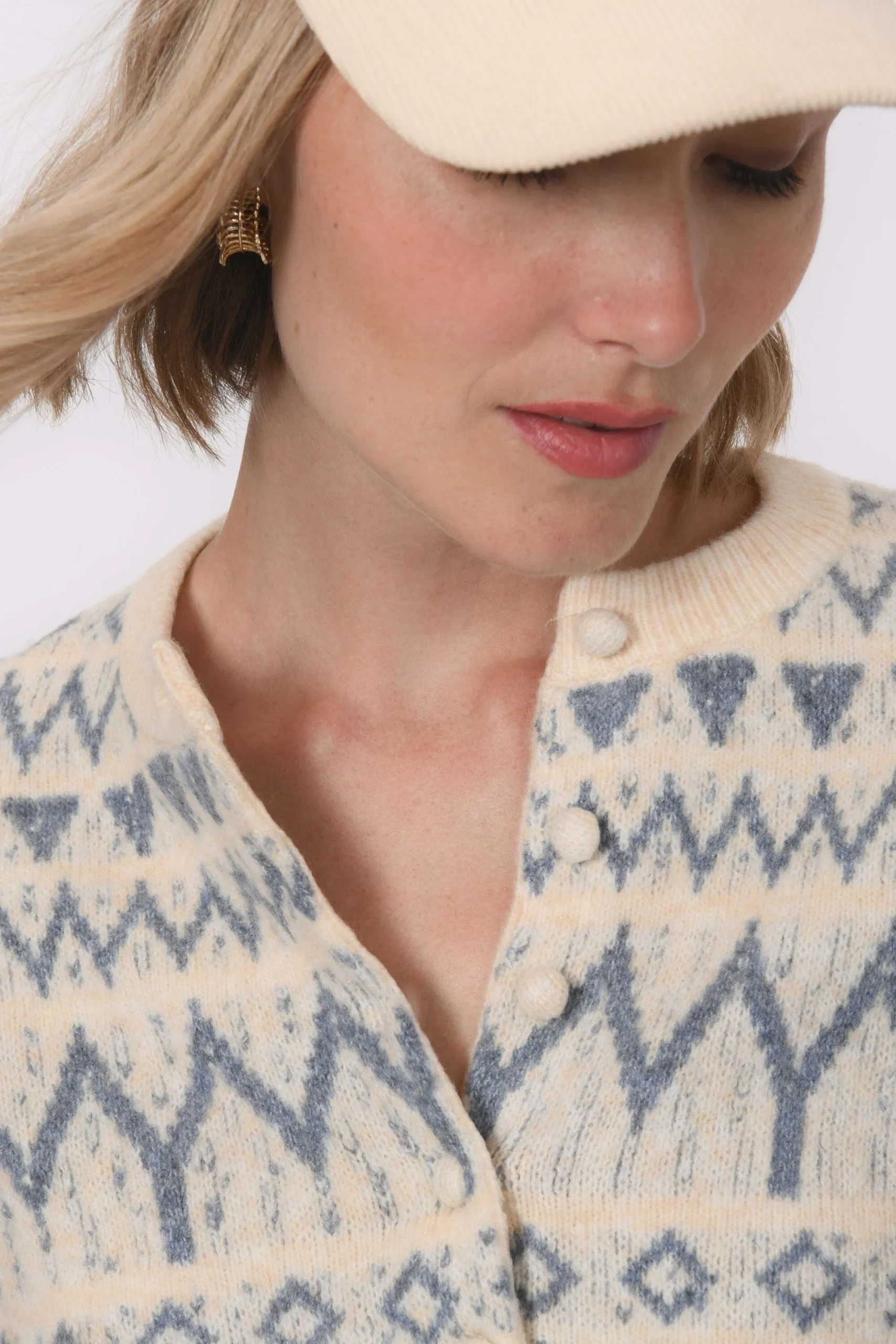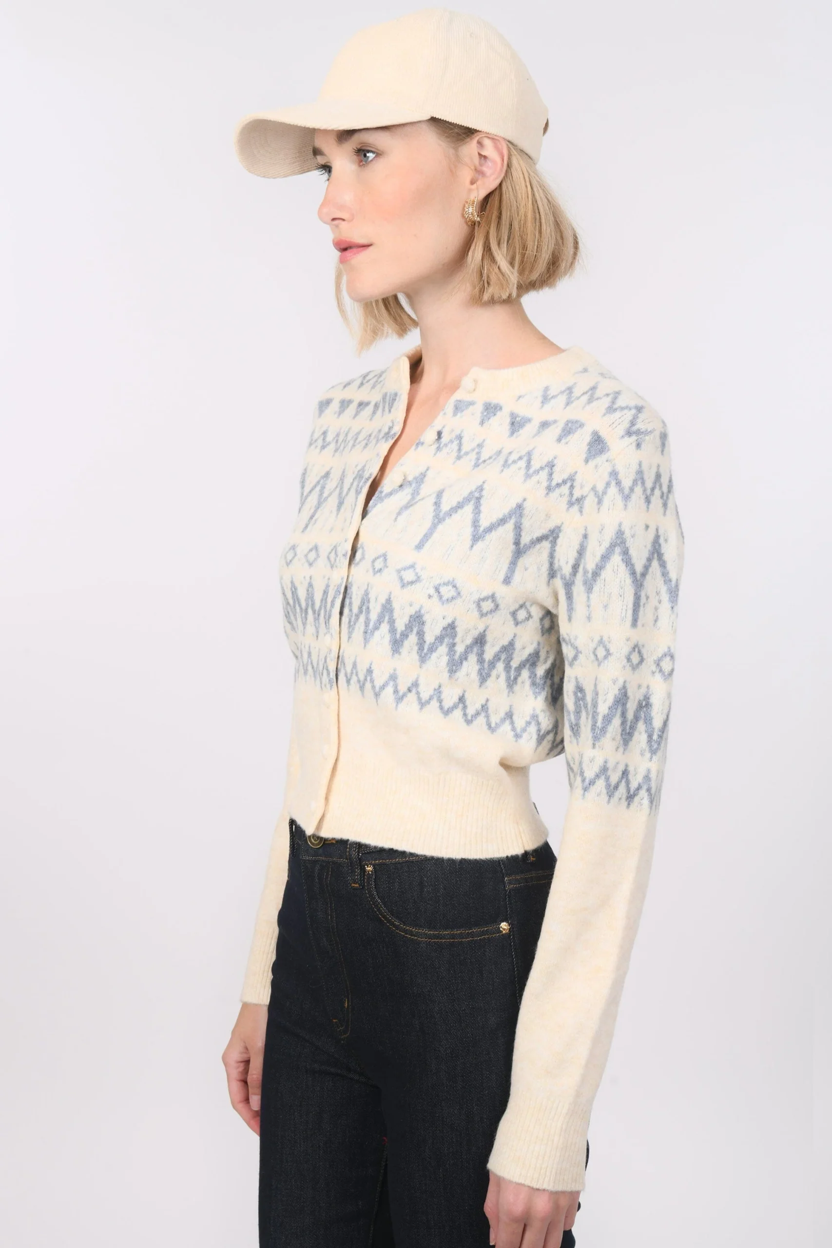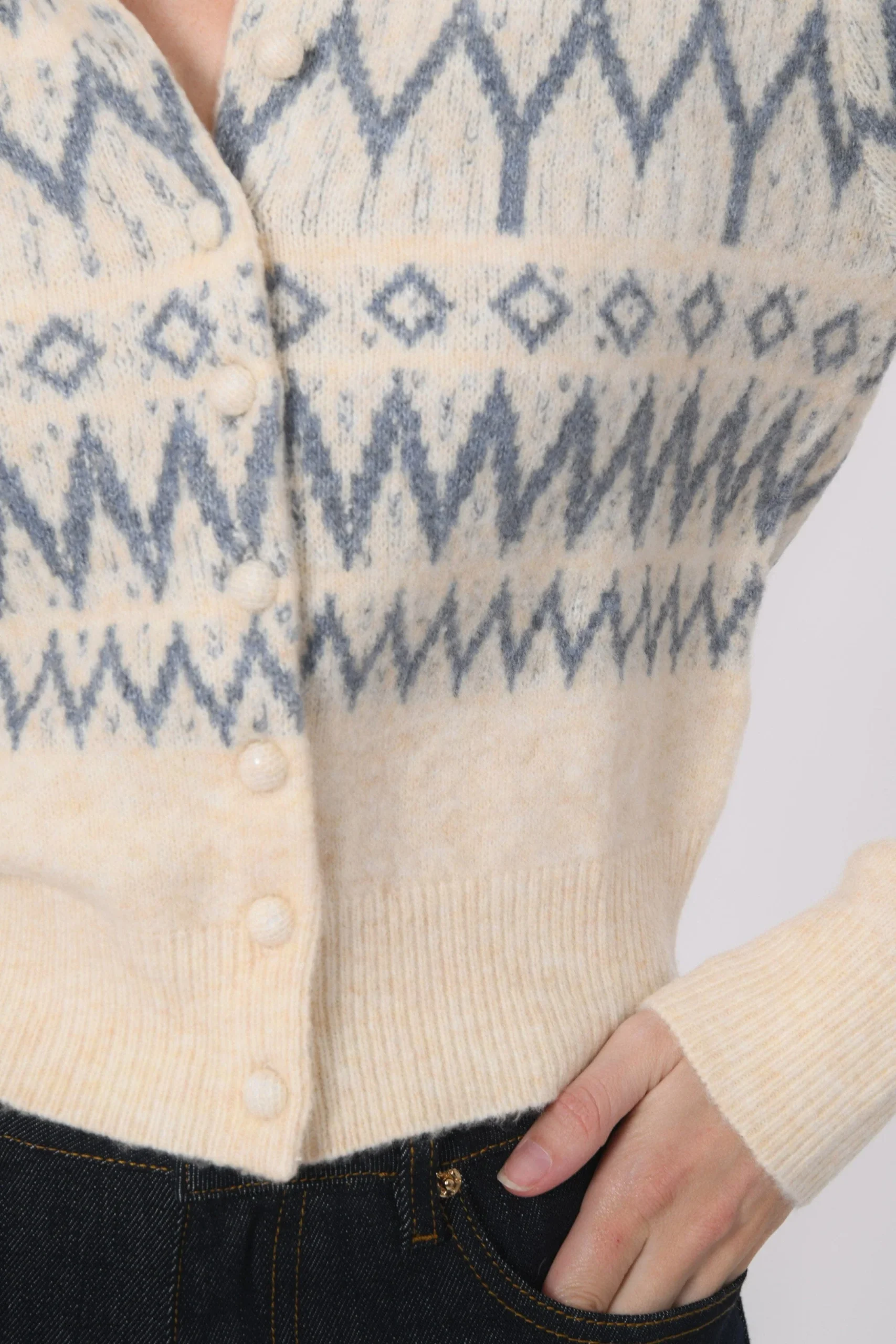 On affronte l’hiver avec douceur dans le gilet BeccyMaille moelleuse contenant de la laineGrand motif géométrique Encolure rondeJoli détail du boutonnage apparent avec boutons recouvertsBord côte sur le col, les poignets et le basLongueur 50cm en T0 Océane mesure 1m77 et porte une taille 0