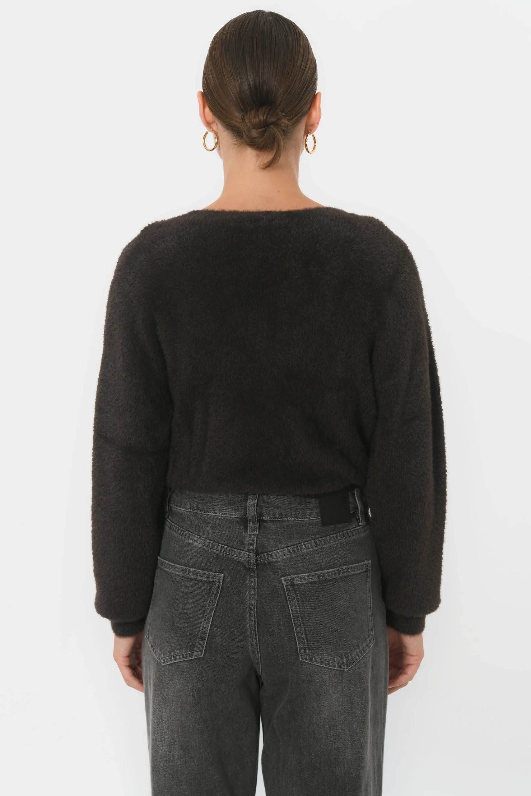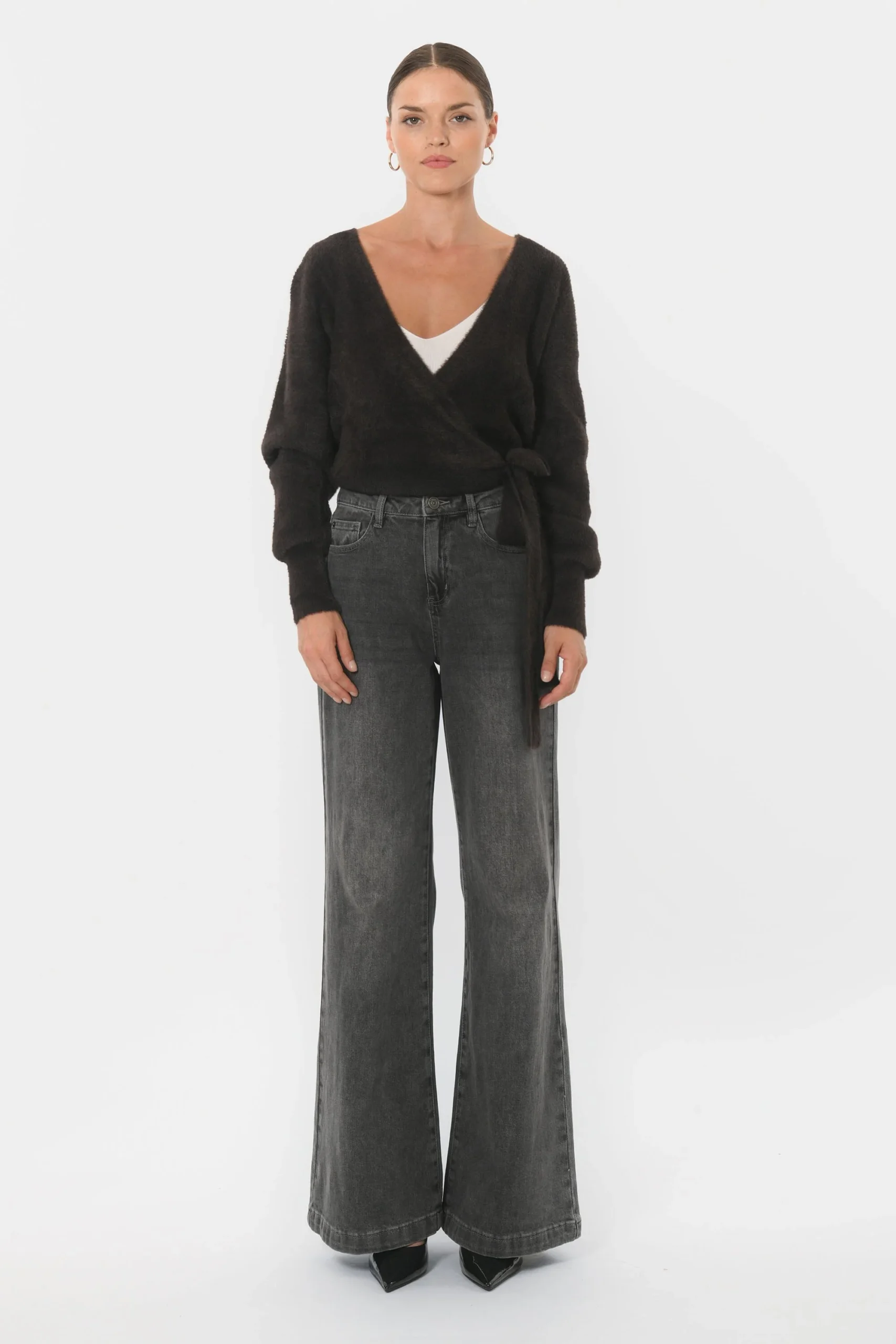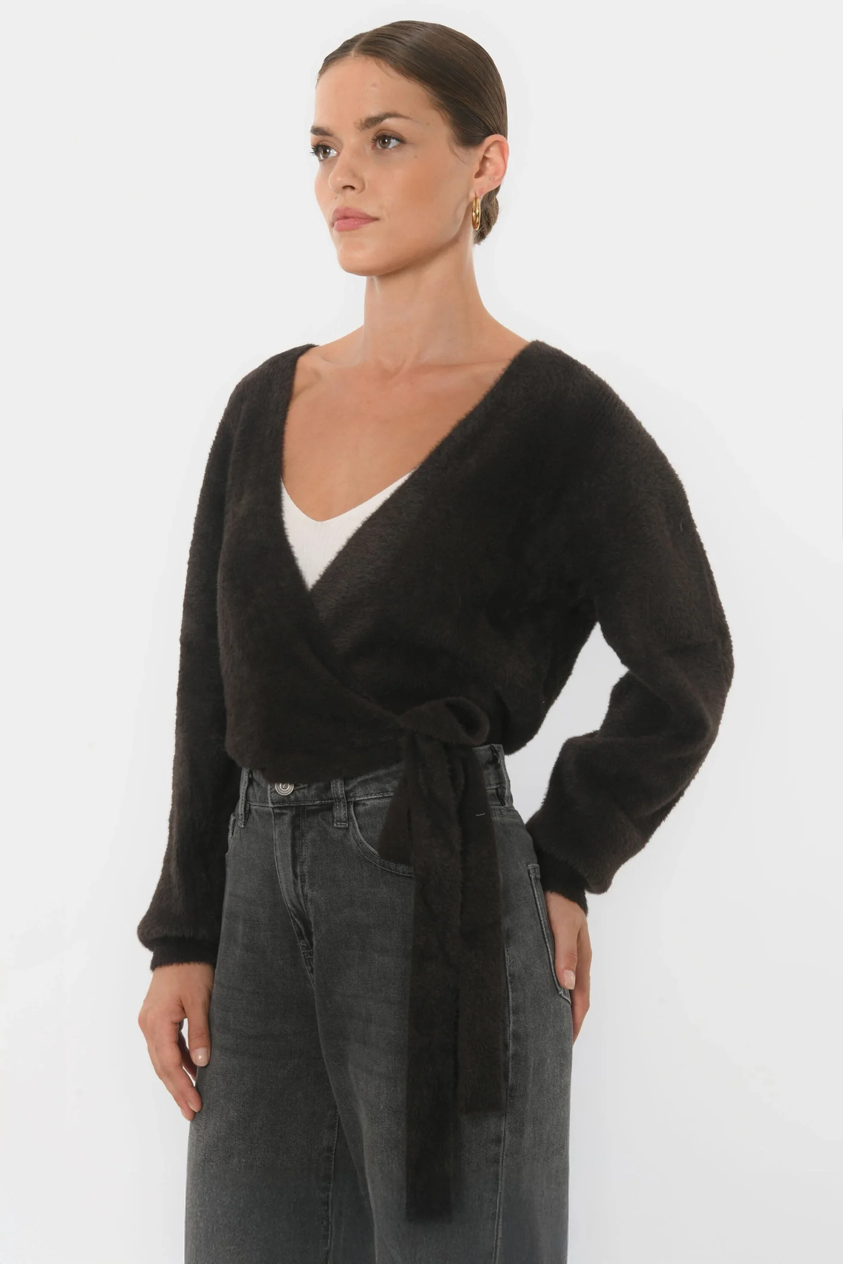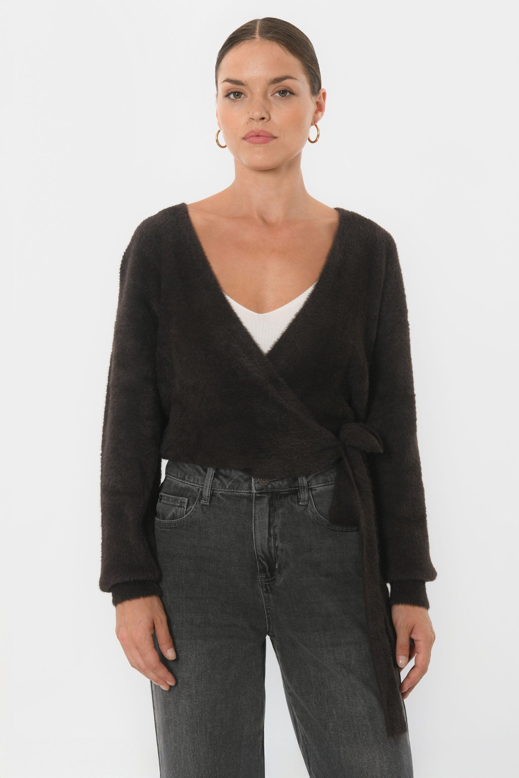 Le gilet Belen, un nuage de douceurMaille moelleuse effet fluffyCol croisé, vrai cache cœur avec liens à nouerManches longuesLongueur 55cm en T0 Sasha mesure 1m75 et porte une taille 0
