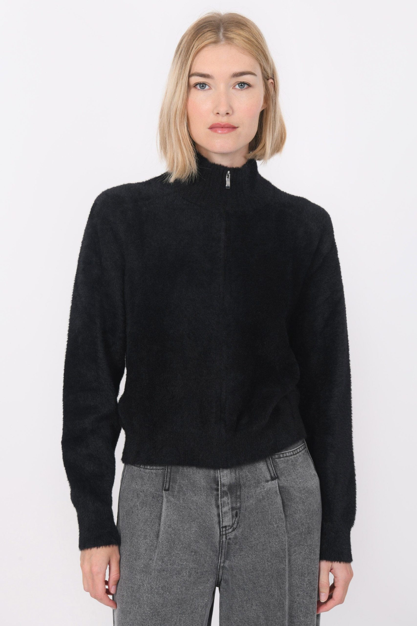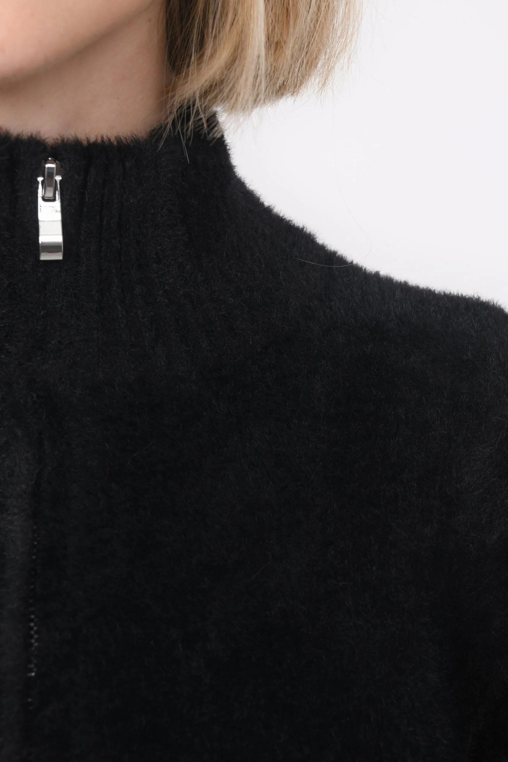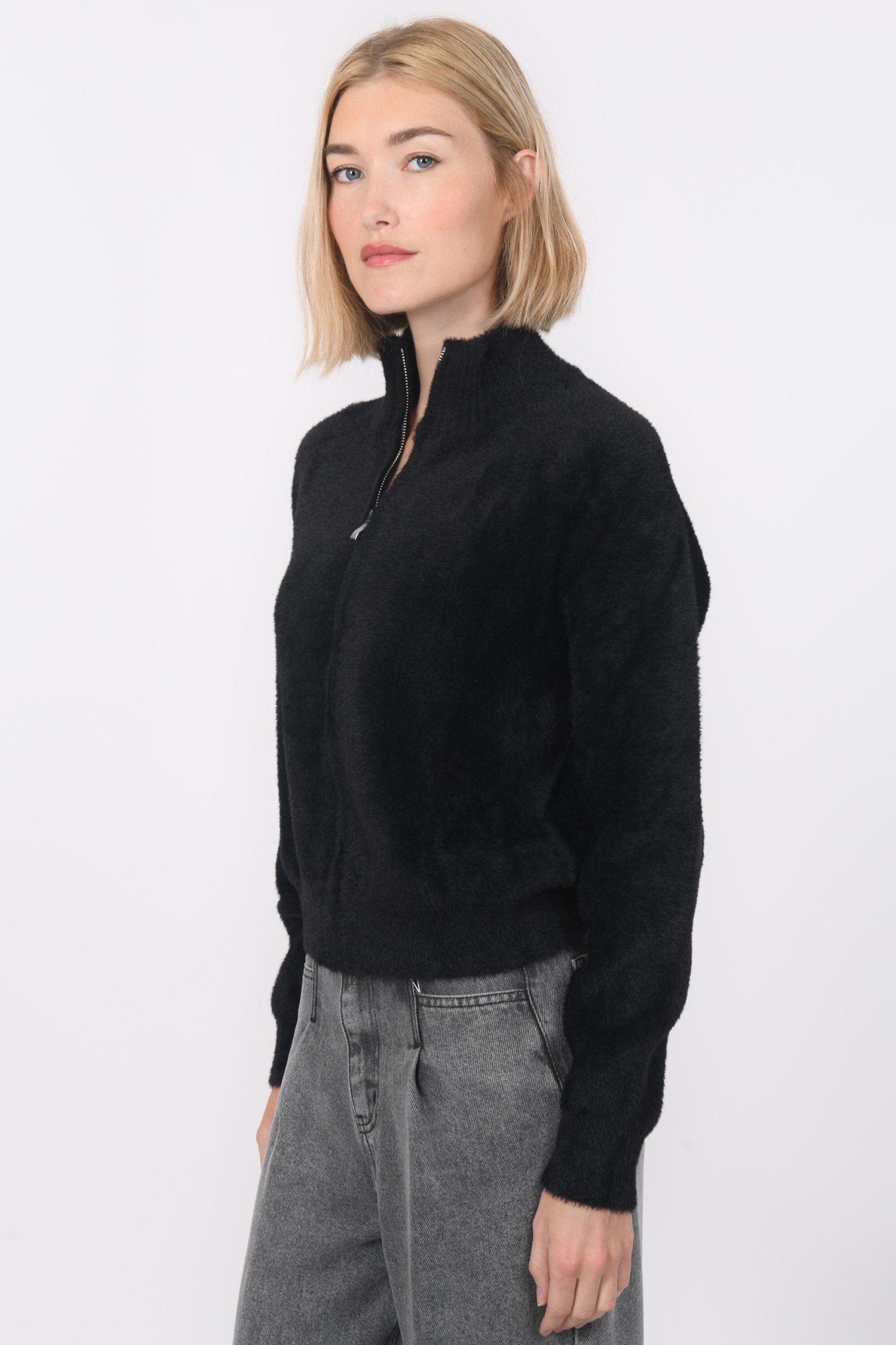 Belen, le gilet doudou à l’esprit camionneurMaille moelleuse effet fluffyCol montant avec grand zip milieu devantEmmanchures raglan Coupe ampleLongueur 57cm en T0 Océane mesure 1m77 et porte une taille 0