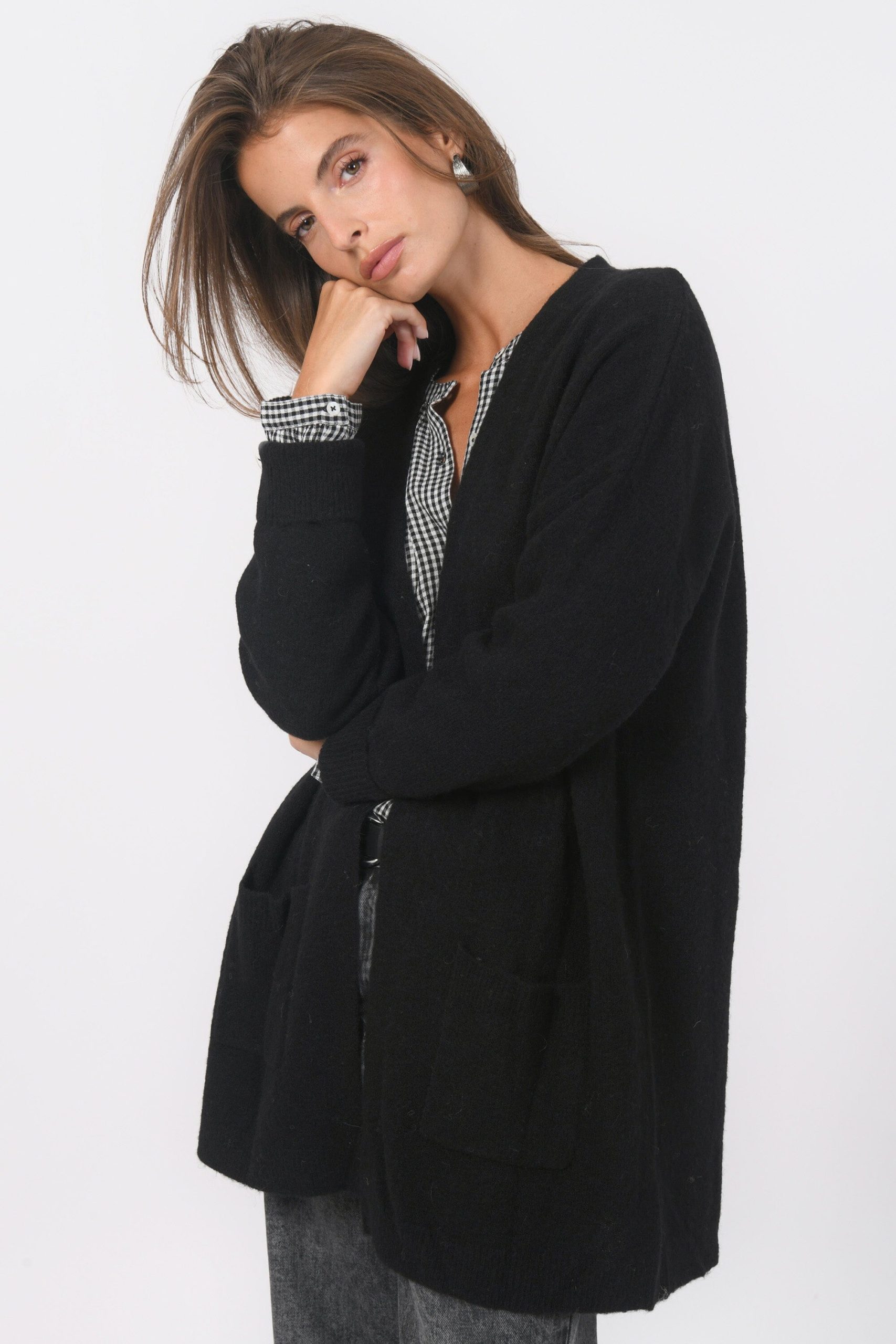 Bruno, le gilet doudou dans lequel s’envelopperMaille chinée contenant de l’alpaga et de la laine, moelleuse et chaudeGilet mi-long bord à bordDeux poches plaquéesLongueur 80cm en T0 Inès mesure 1m71 et porte une taille 0