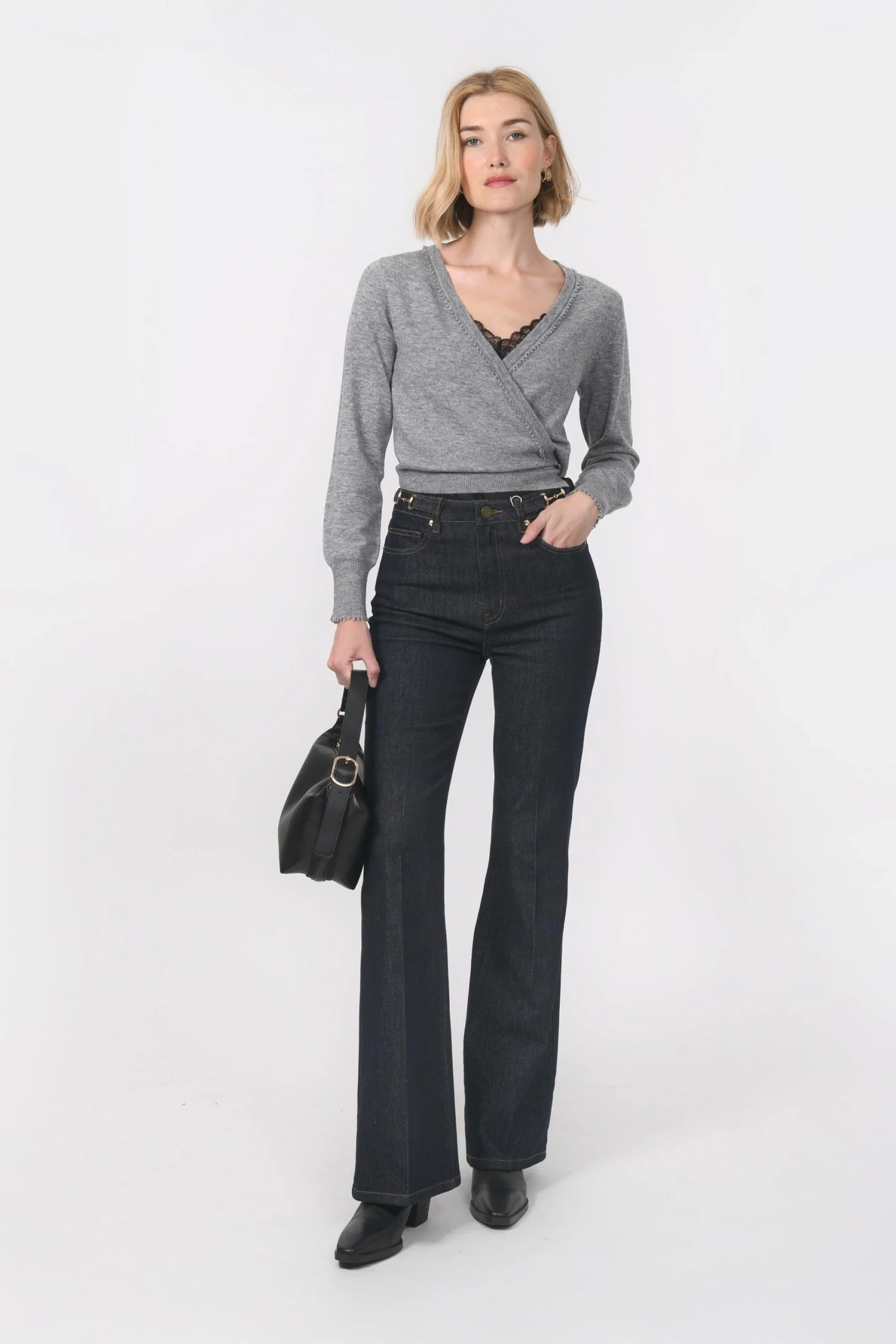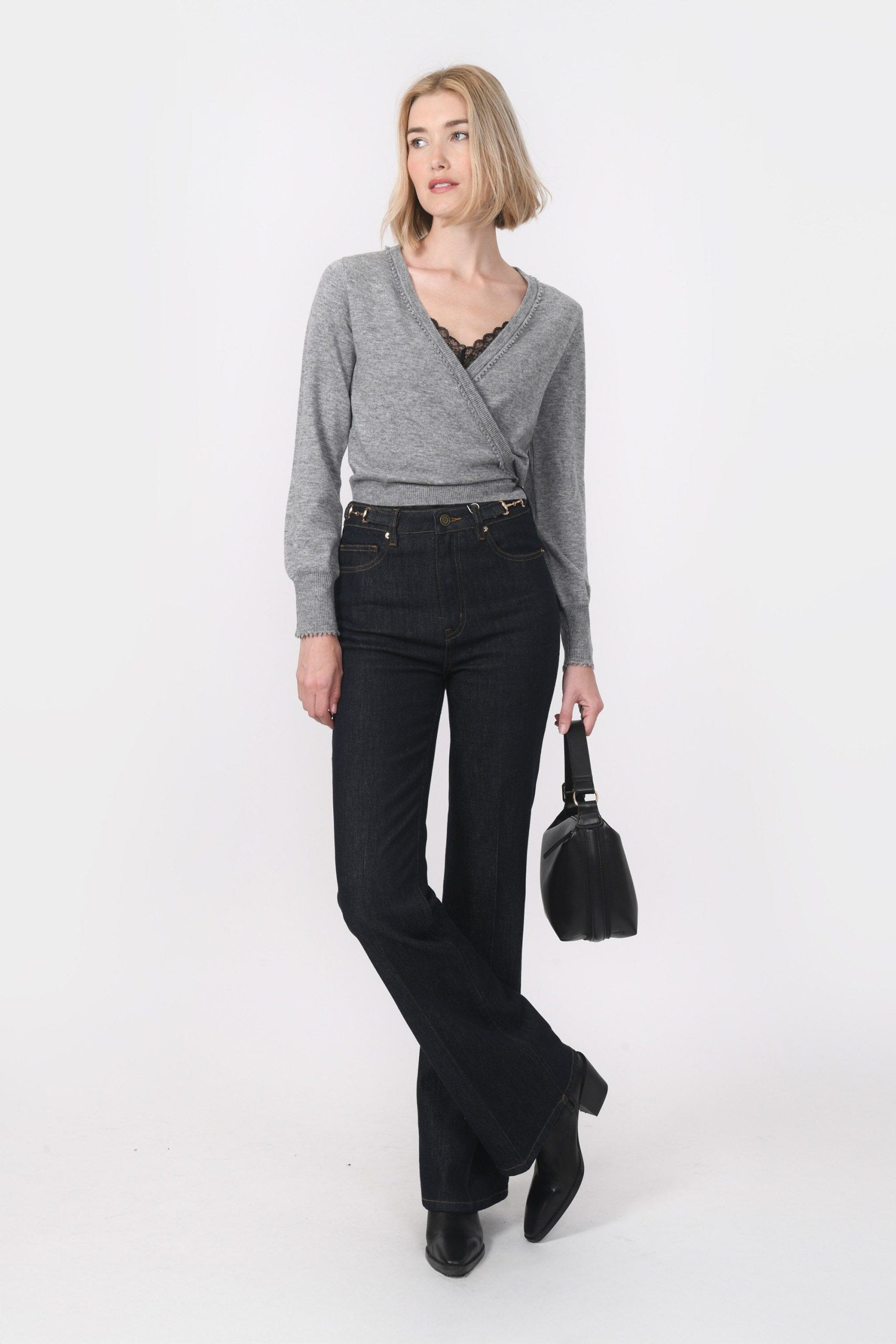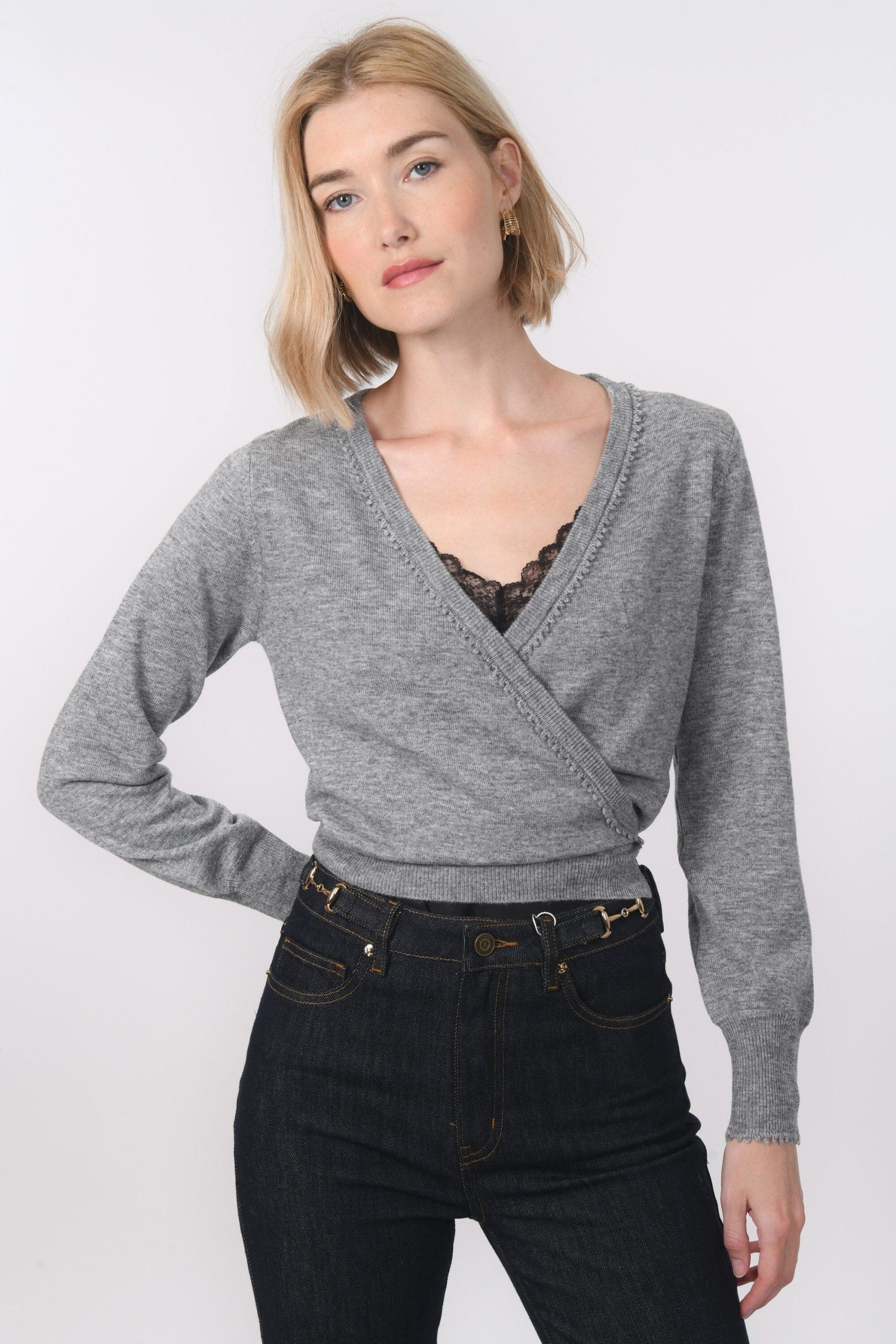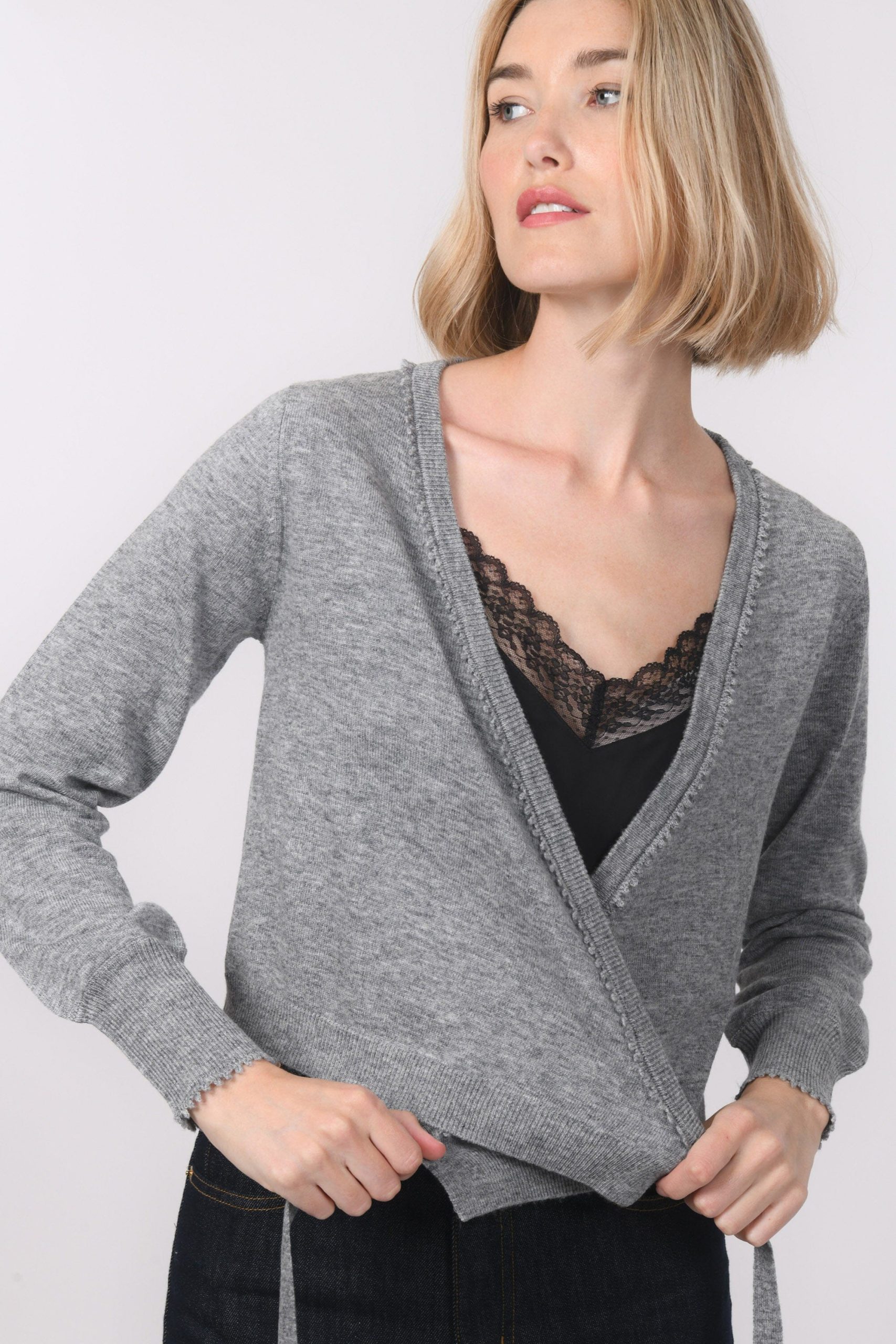 Beaucoup de douceur pour le gilet BacotEn laine mélangée, maille fine et douceEncolure croisée, bordée d’un galon fantaisie façon croquetForme cache cœur avec liens à nouerLongueur 49cm en T0 Océane mesure 1m77 et porte une taille 0
