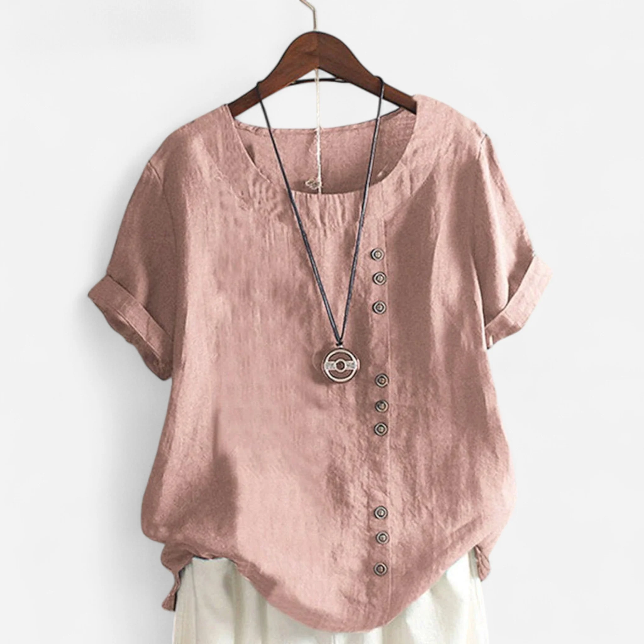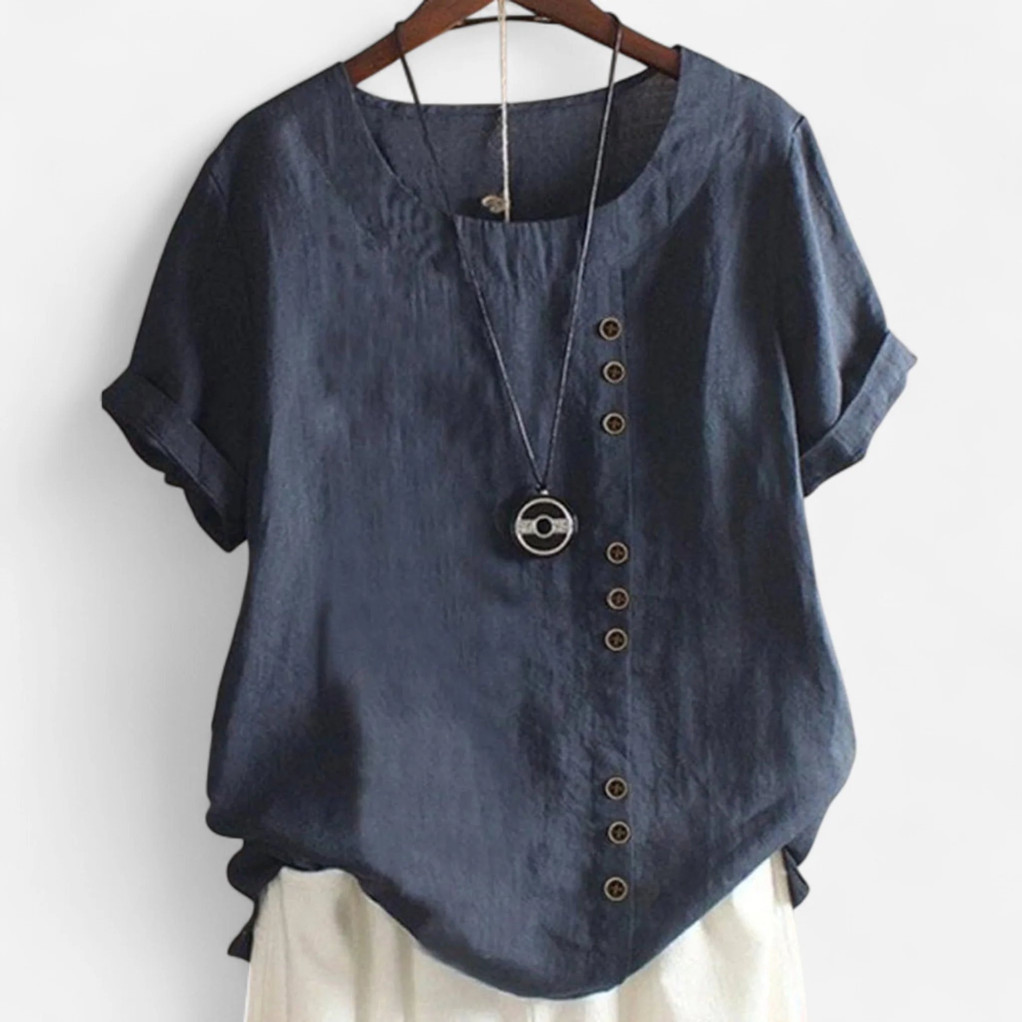 Haut en Lin à Bouton Asymétrique – Coupe Décontractée, Manches Courtes