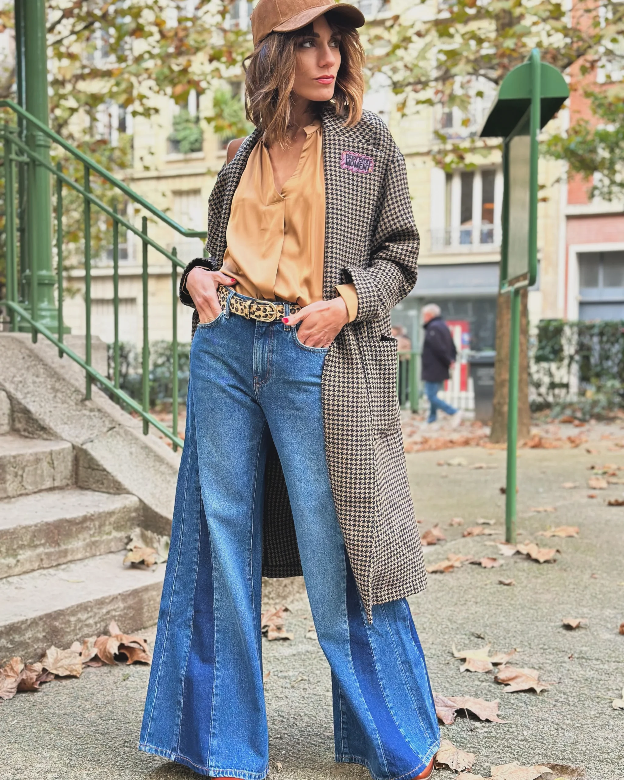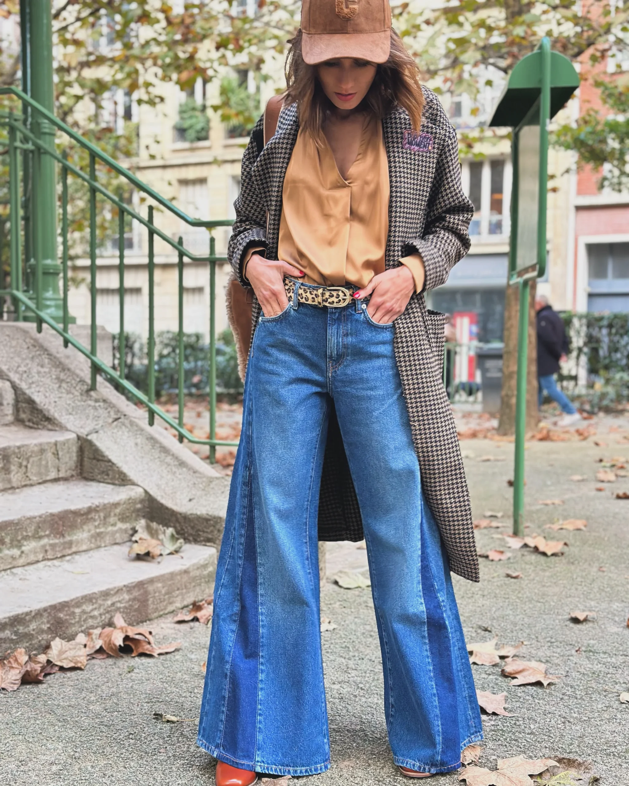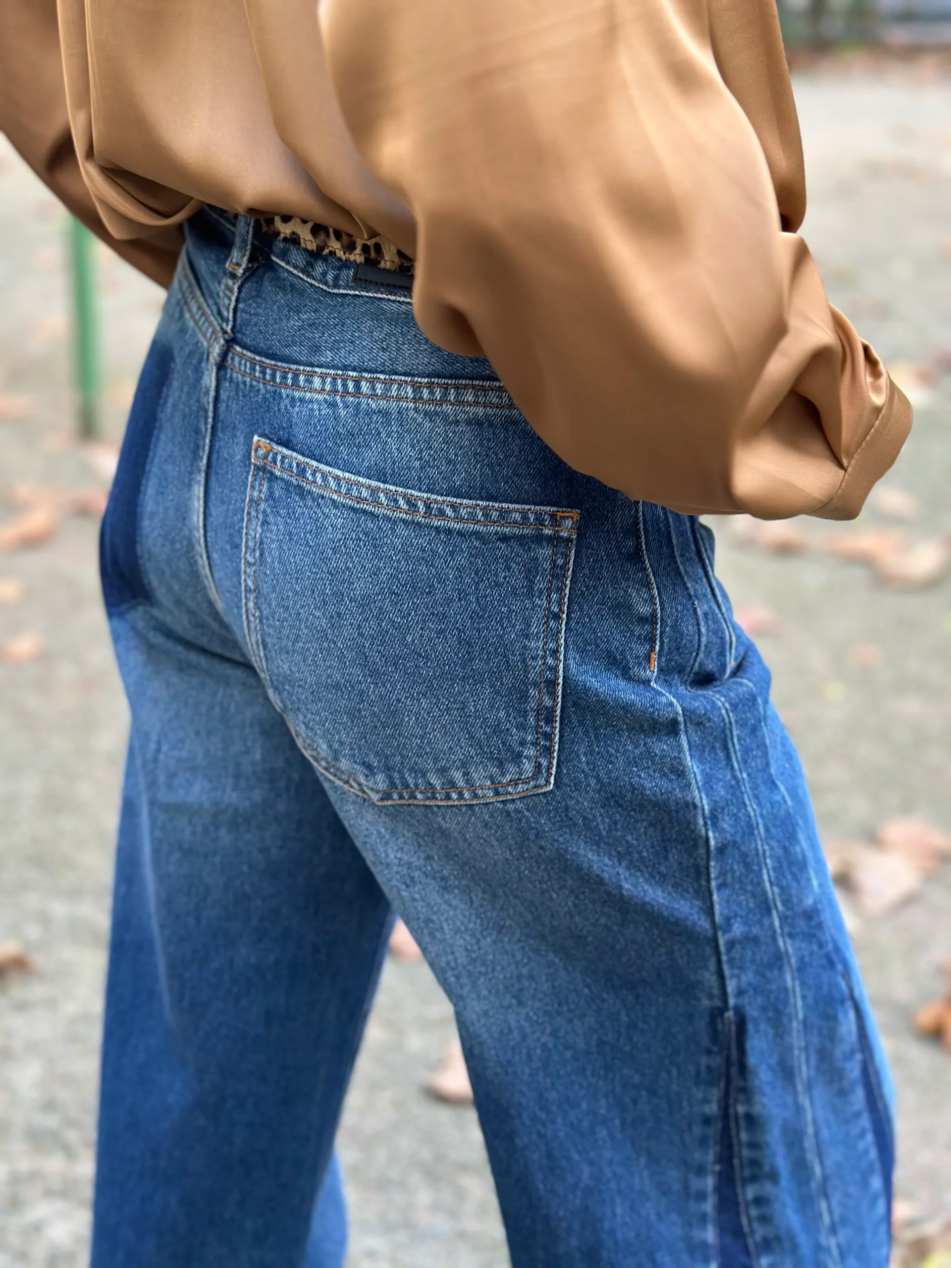 - Double matière : du jean foncé est ajouté sur une poche arrière et sur les jambes pour un effet de style.