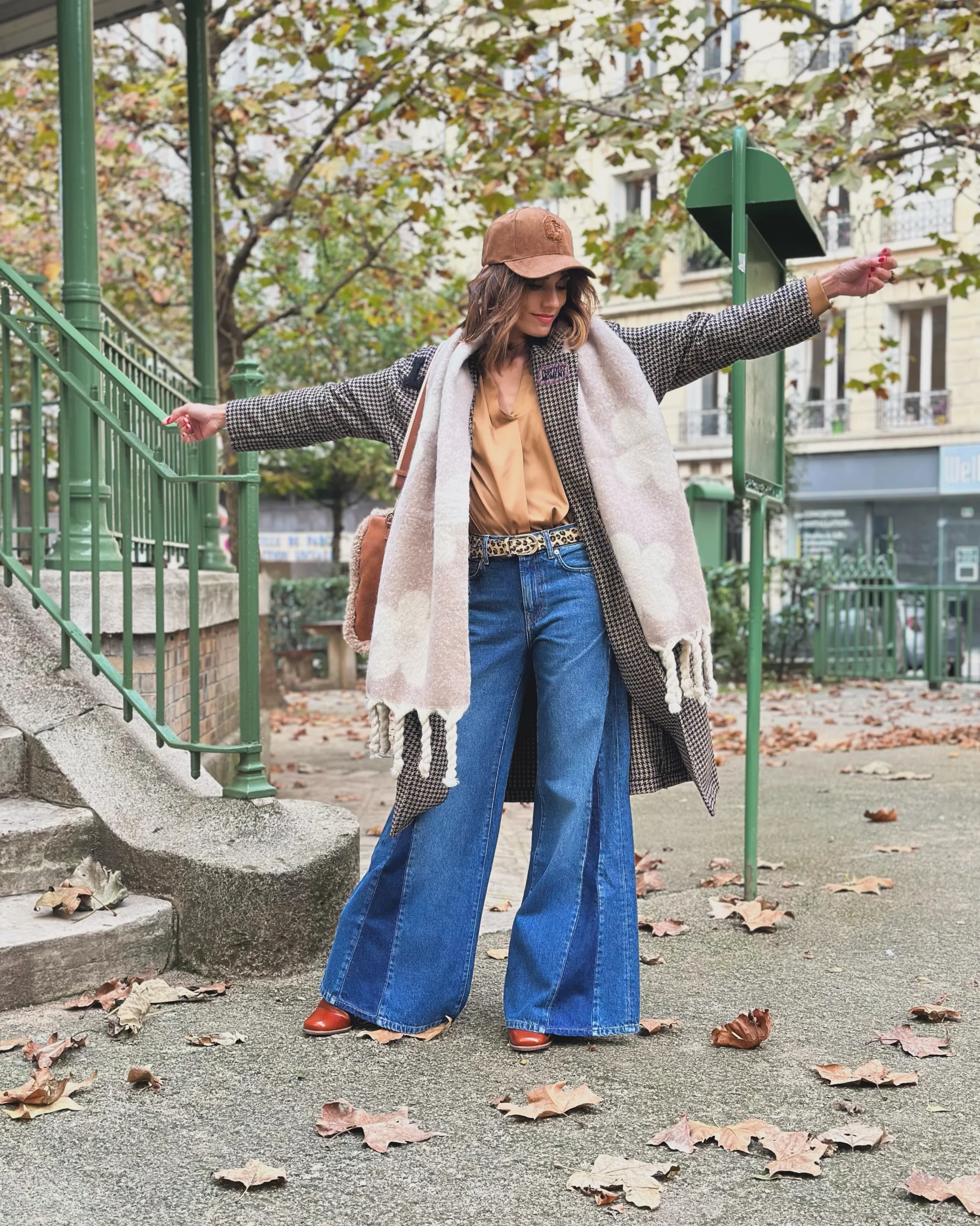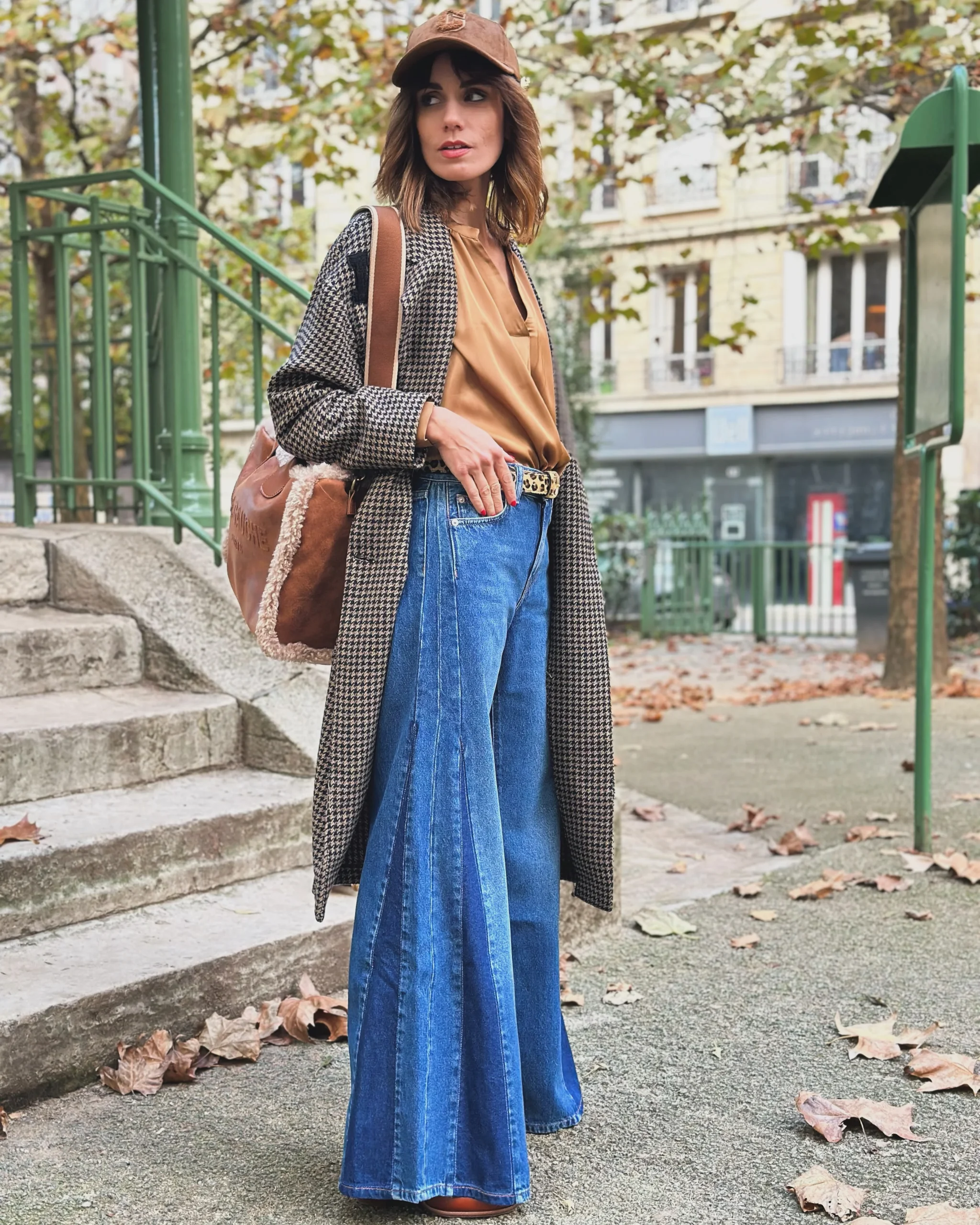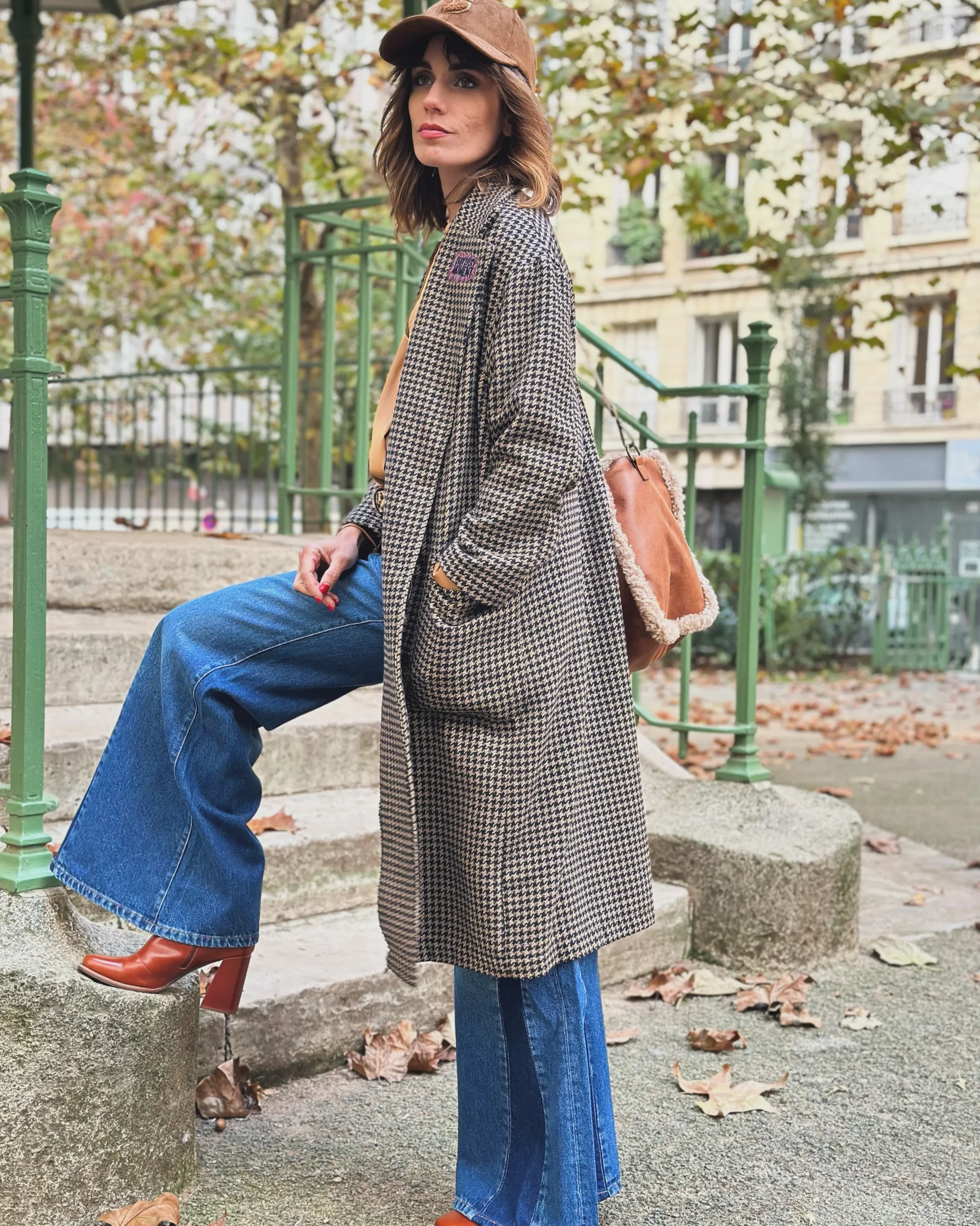 - Double matière : du jean foncé est ajouté sur une poche arrière et sur les jambes pour un effet de style.