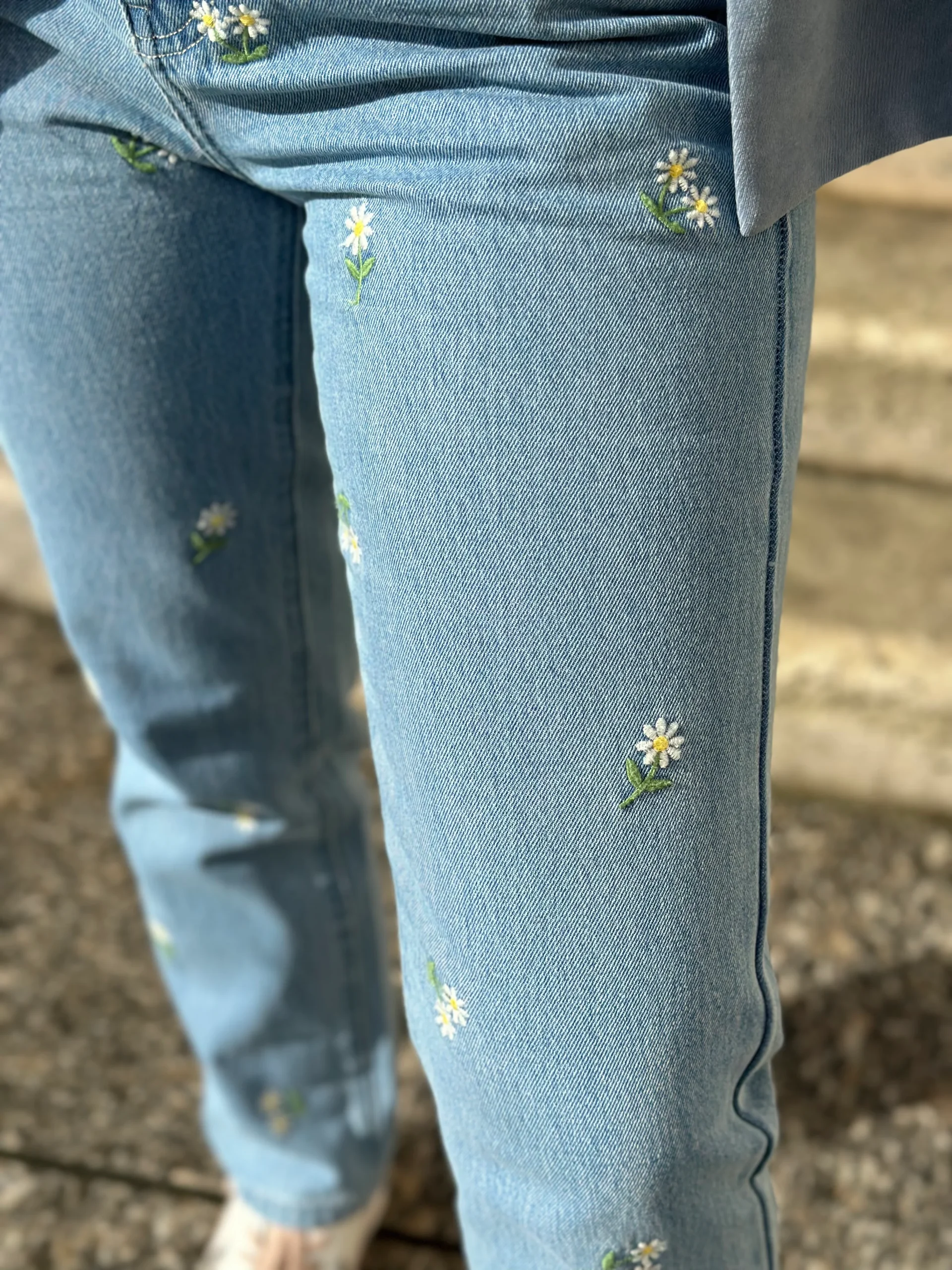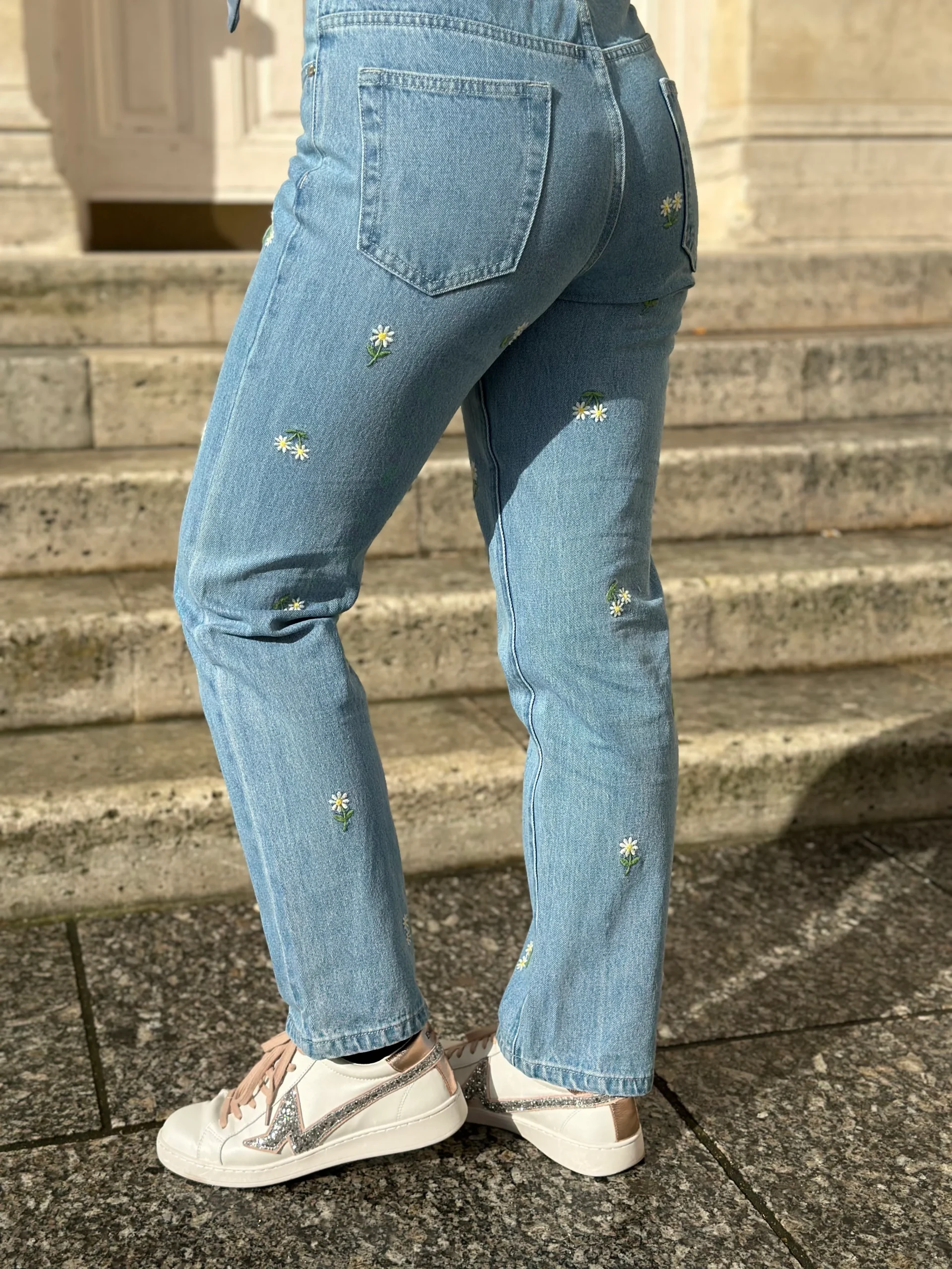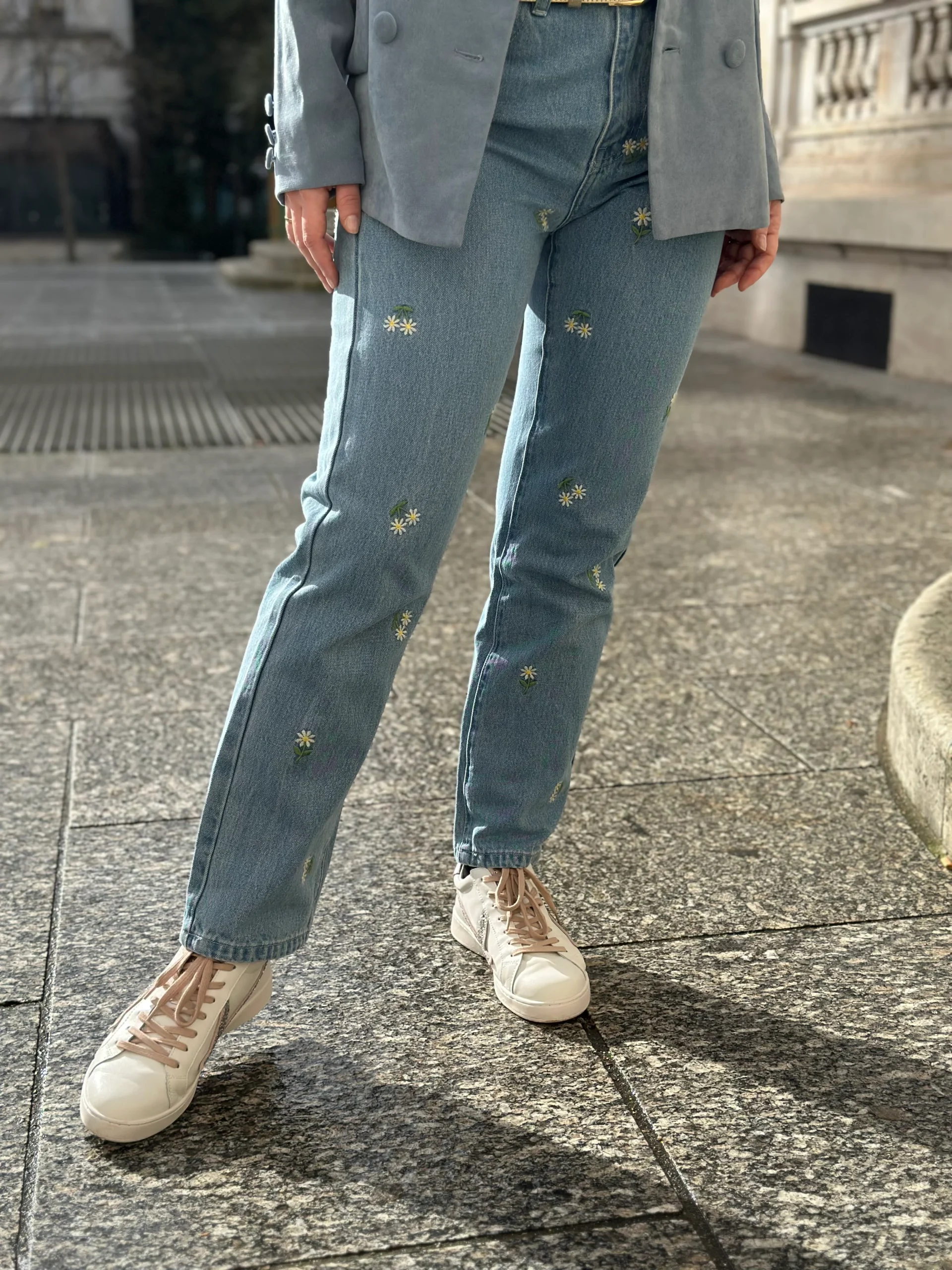Jean taille haute Coupe Droite Décoré de petites marguerites Composition : 100% coton Coloris – Bleu Clair – gagnant des votes sur Instagram ! Merci d’avoir été nombreux à participer aux votes.