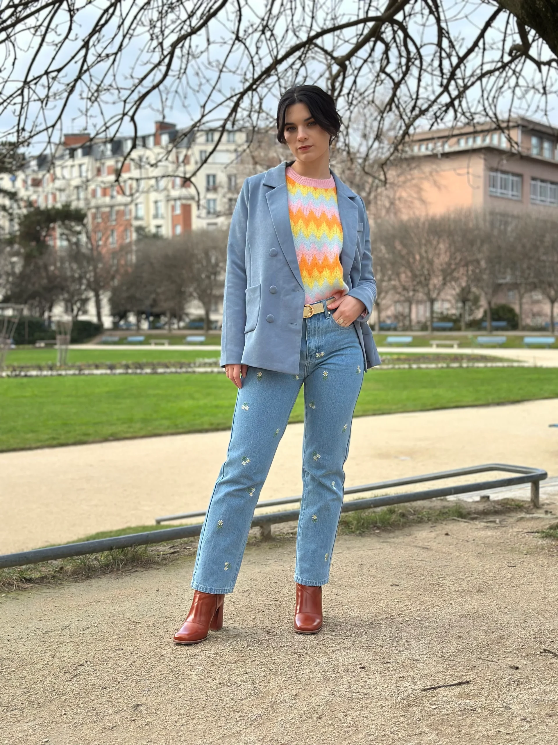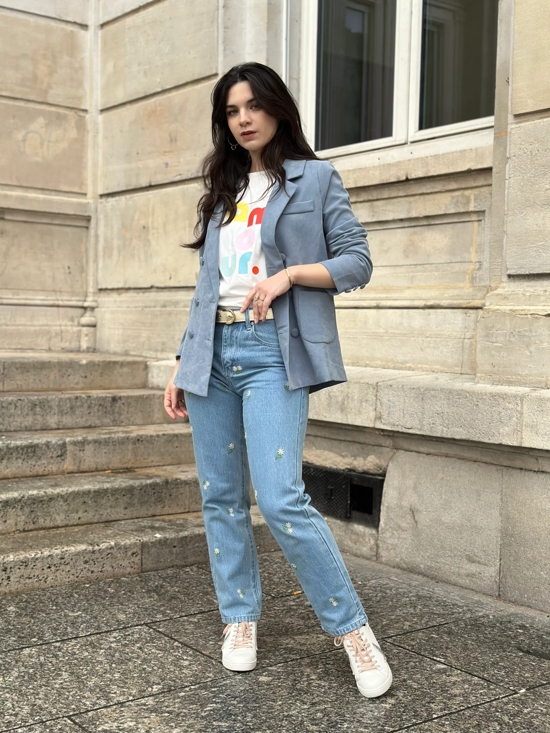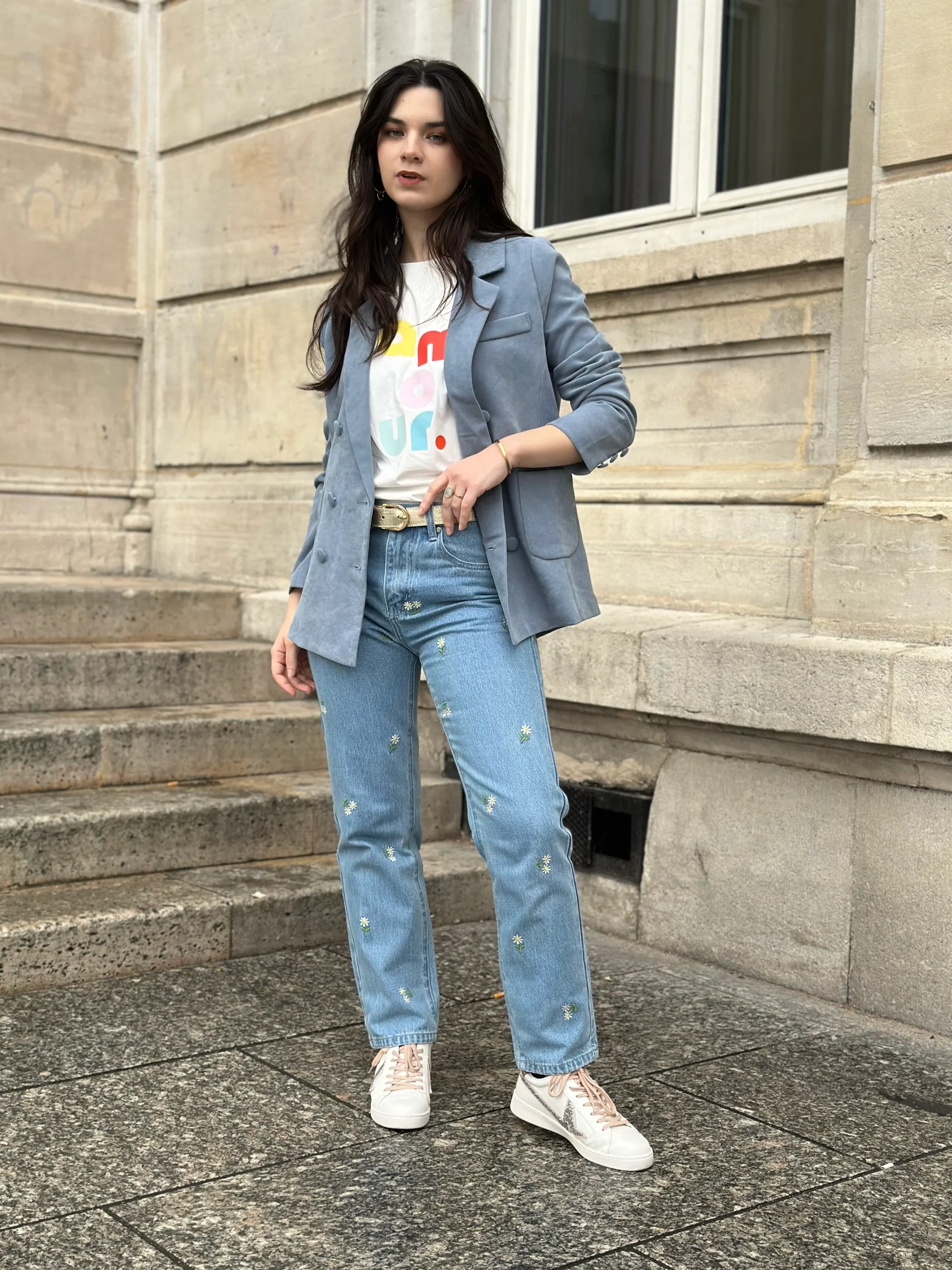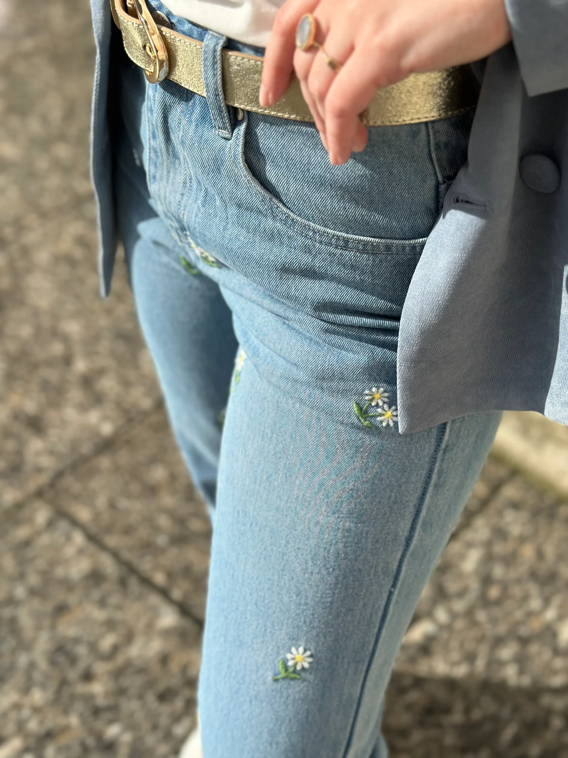 Jean taille haute Coupe Droite Décoré de petites marguerites Composition : 100% coton Coloris – Bleu Clair – gagnant des votes sur Instagram ! Merci d’avoir été nombreux à participer aux votes.