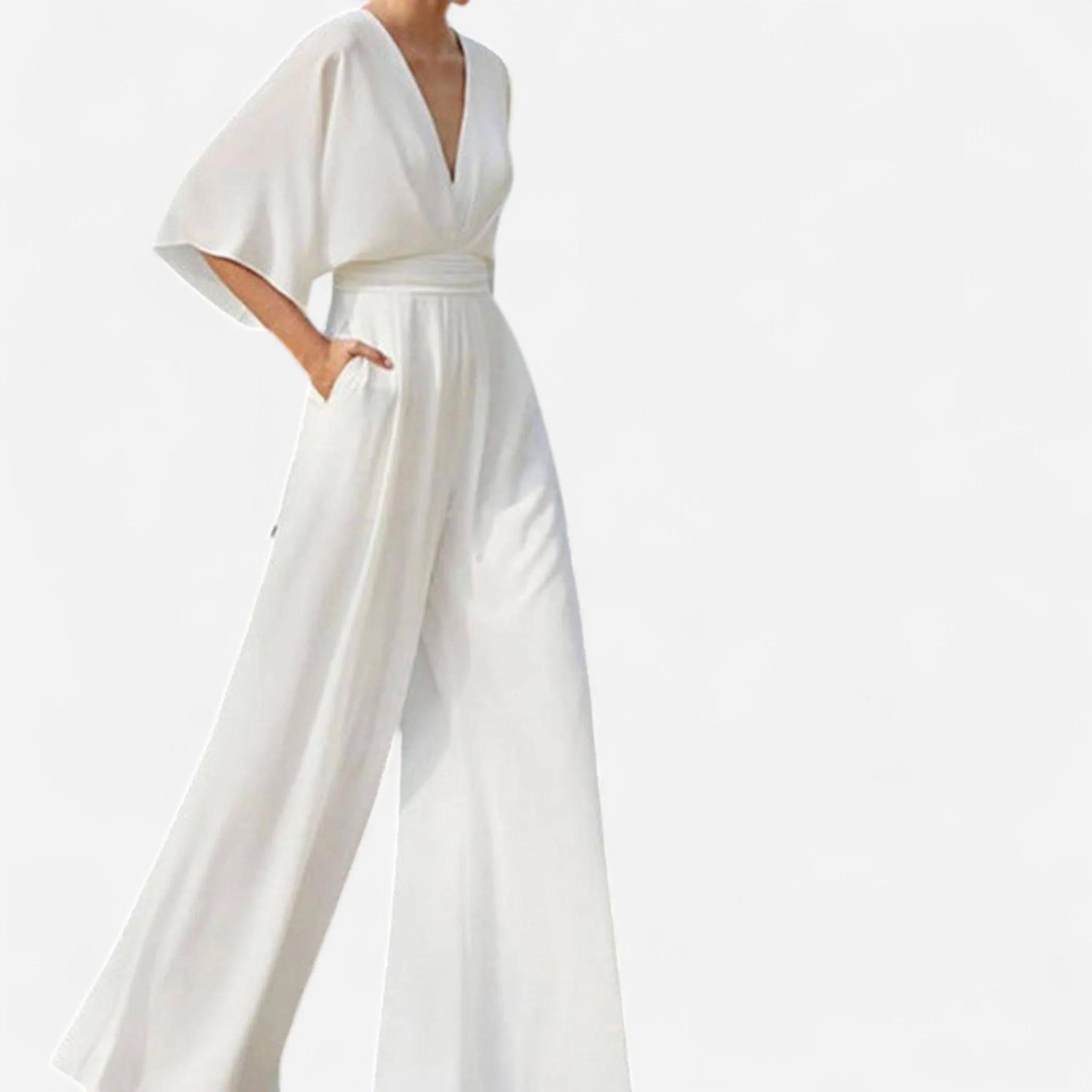 Élevez votre garde-robe avec la combinaison V-Neck Lena—parfaitement stylée avec des accessoires subtils et vos chaussures plates ou à talons préférées !