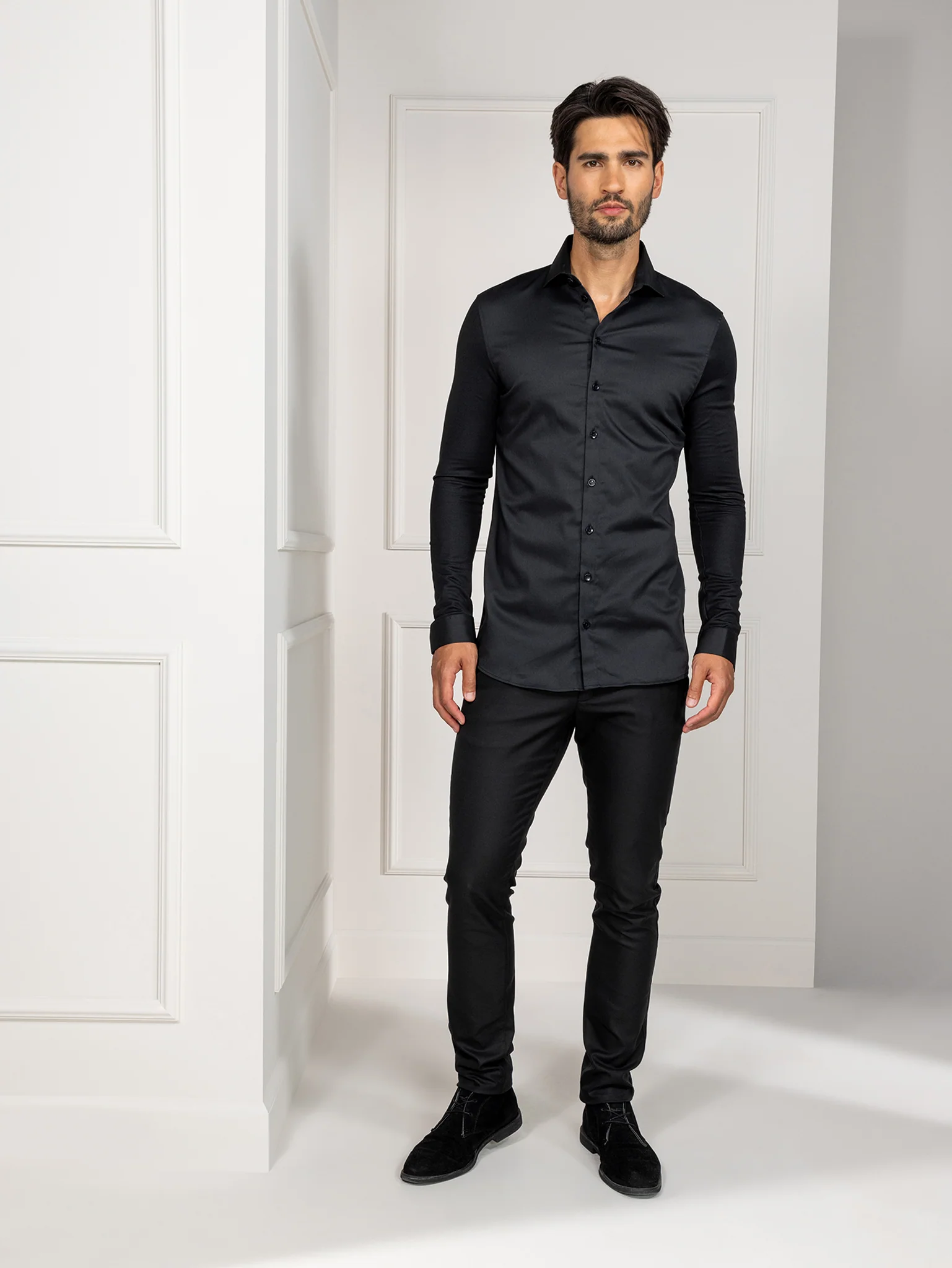 Liam is a slim-fit men’s service shirt with long sleeves and a minimalistic wide spread collar. The front of the shirt is made from a new innovative fabric. This fabric is moist-regulating and feels soft on the skin. The use of stretch, incorporated into the front, back and sleeves, gives the wearer maximum wearing comfort.