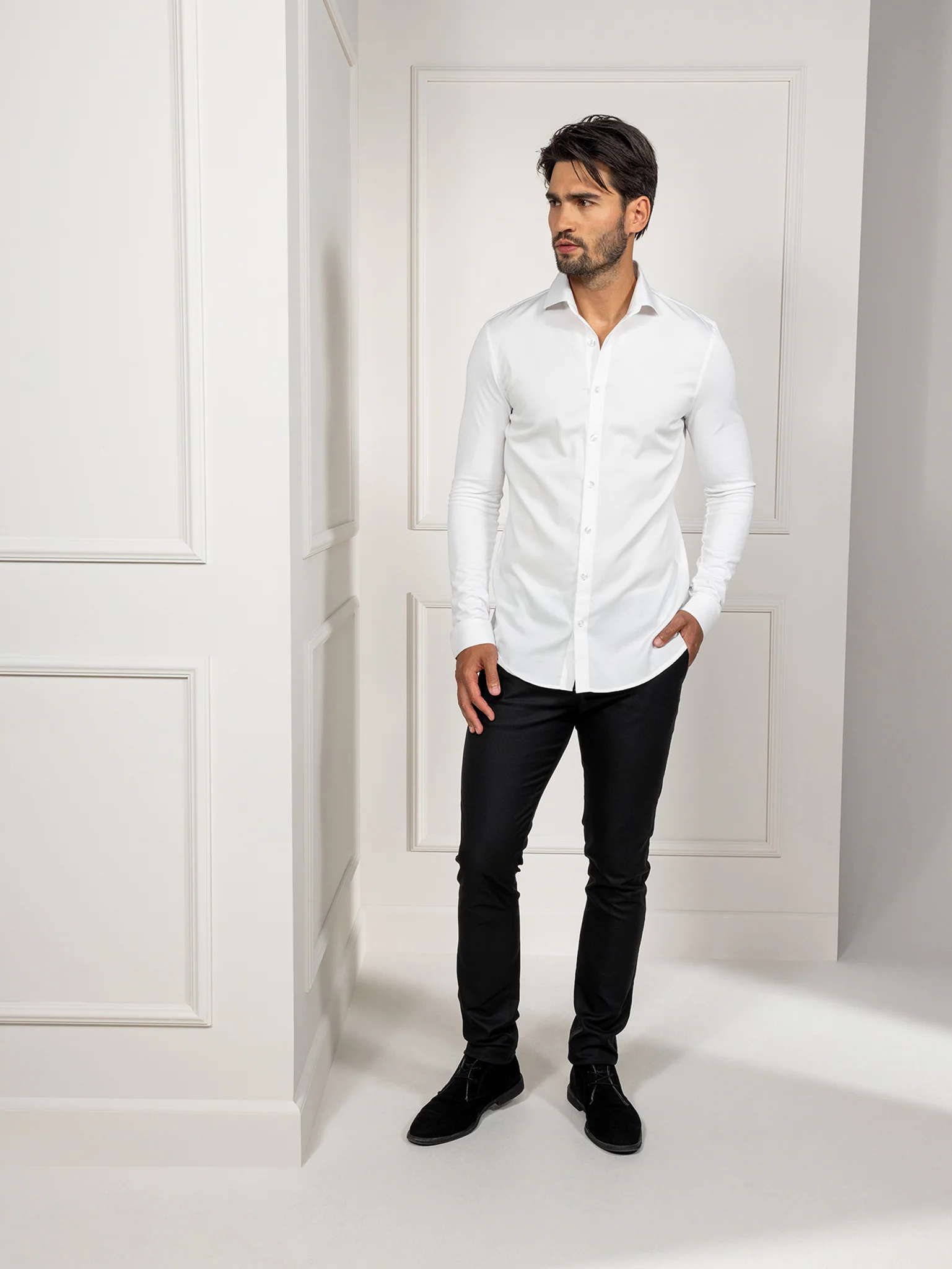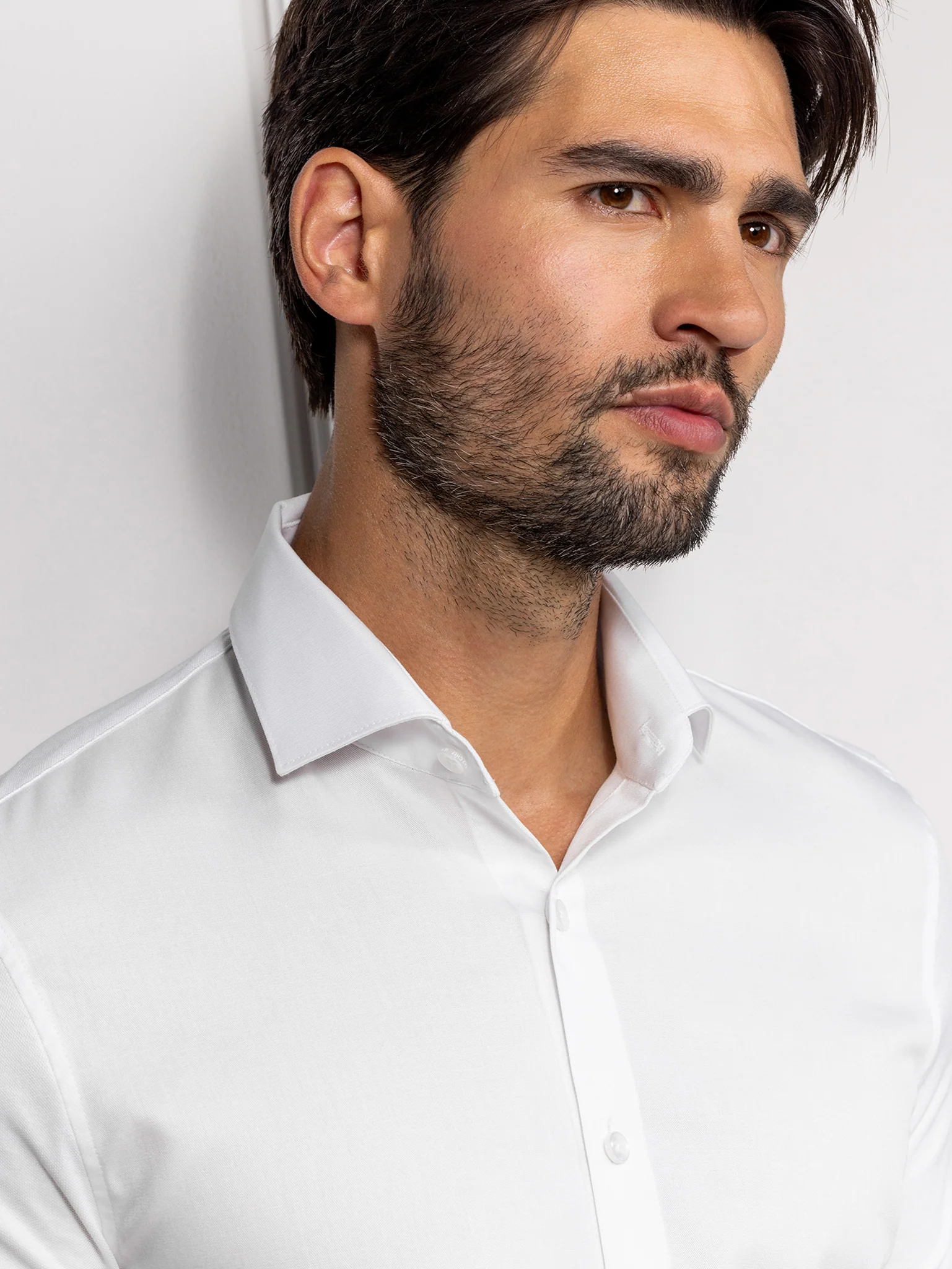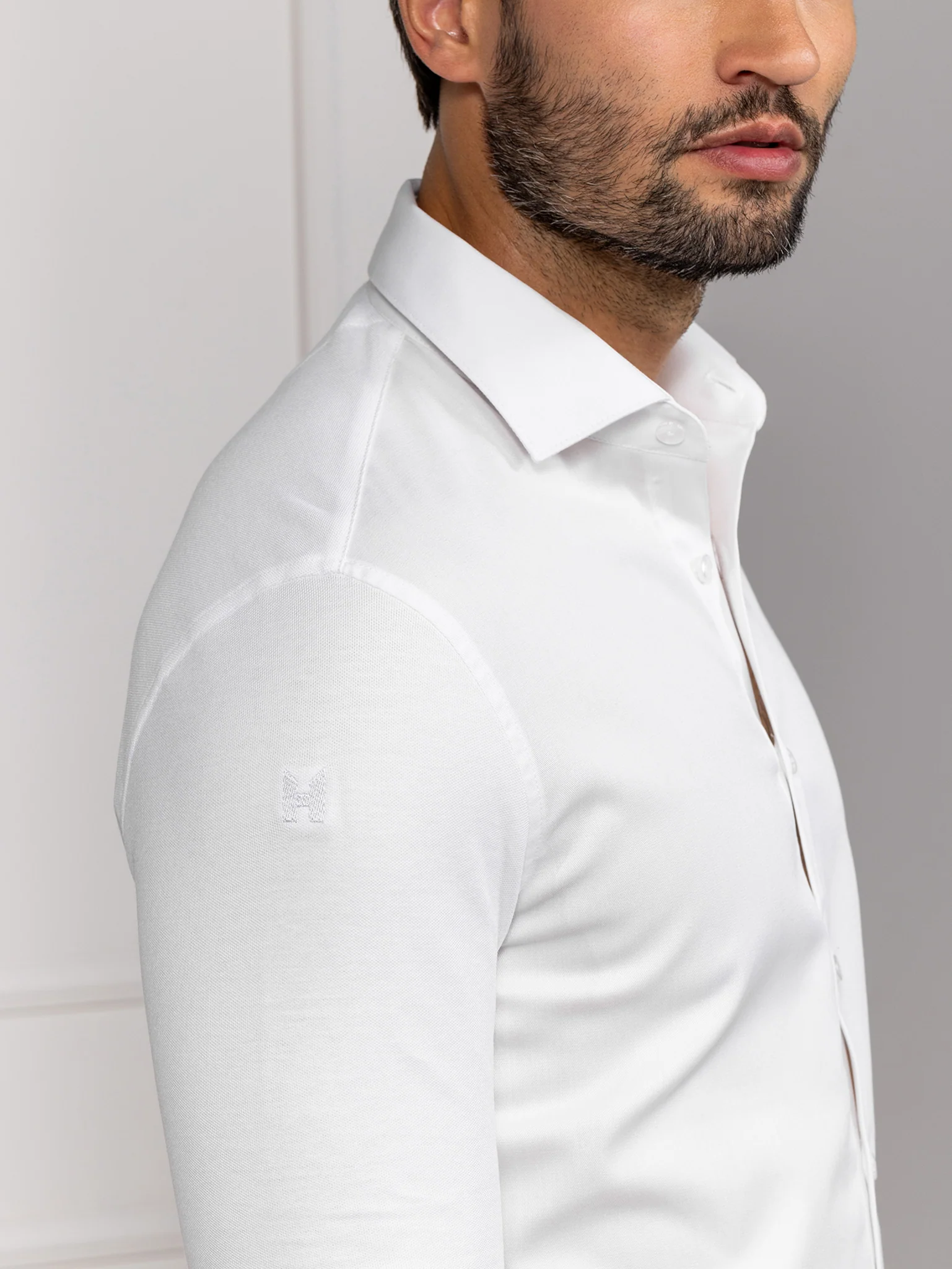 Liam is a slim-fit men’s service shirt with long sleeves and a minimalistic wide spread collar. The front of the shirt is made from a new innovative fabric. This fabric is moist-regulating and feels soft on the skin. The use of stretch, incorporated into the front, back and sleeves, gives the wearer maximum wearing comfort.